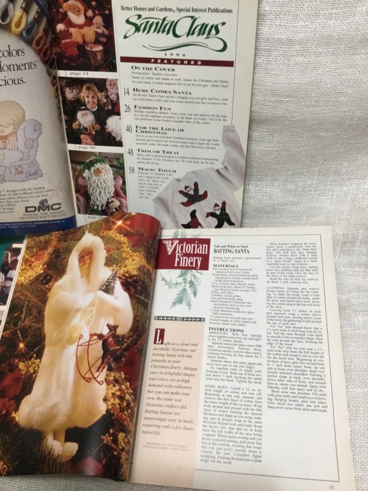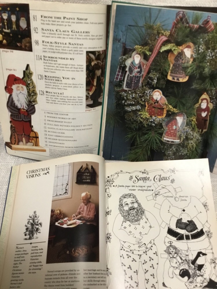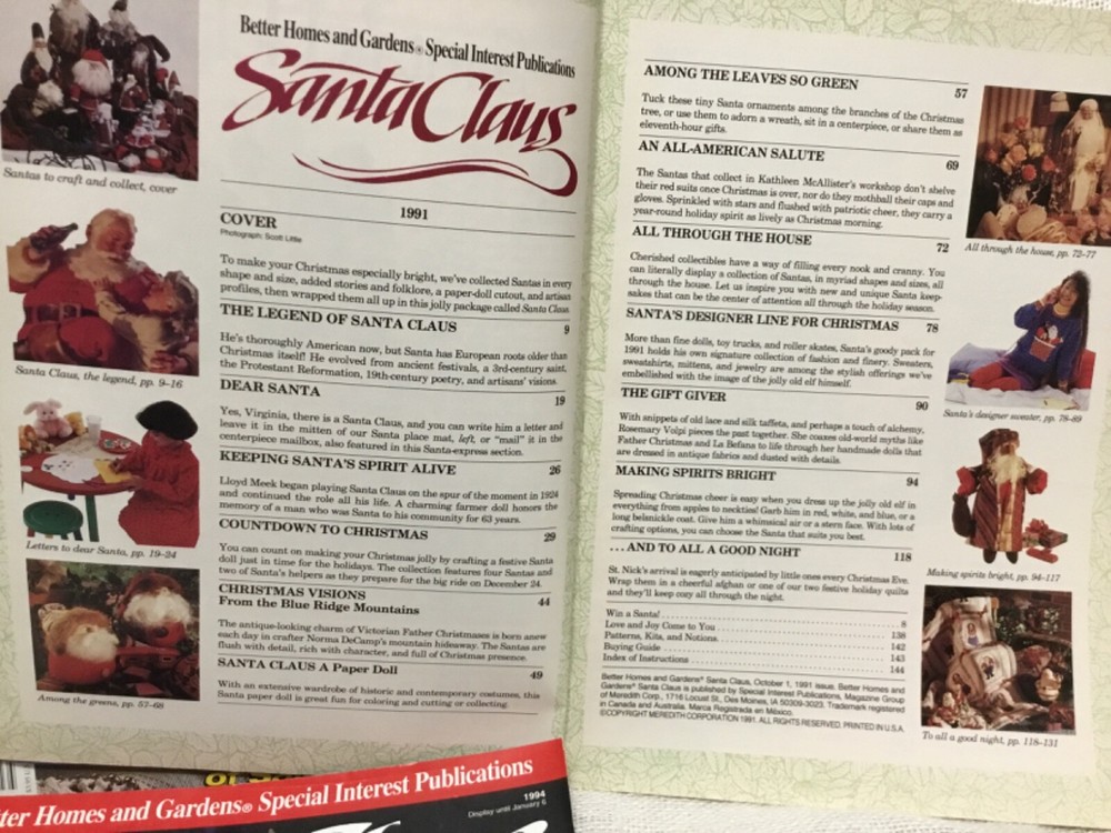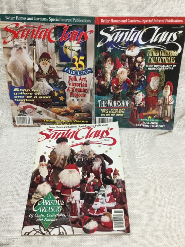 This is for three issues of BHG Santa Claus Magazines. Published once a year, these are from 1991, 1993, and 1994. A variety of crafts, Santa dolls, patterns and info. Some page top corners are turned down. These weigh 1 lb 14 oz and postage is included in the price.