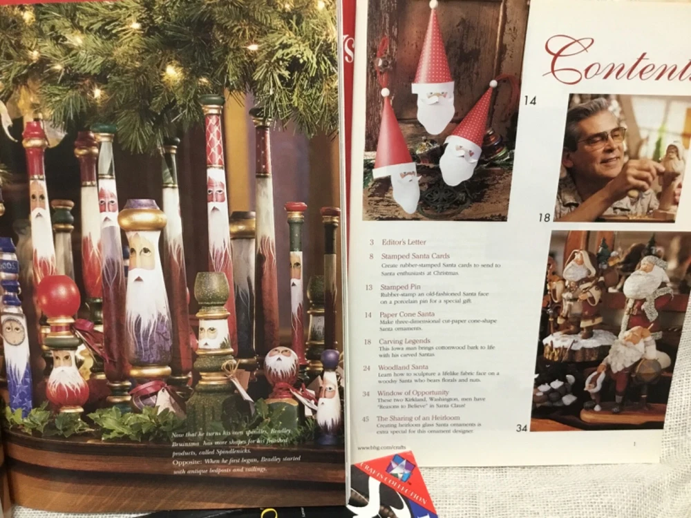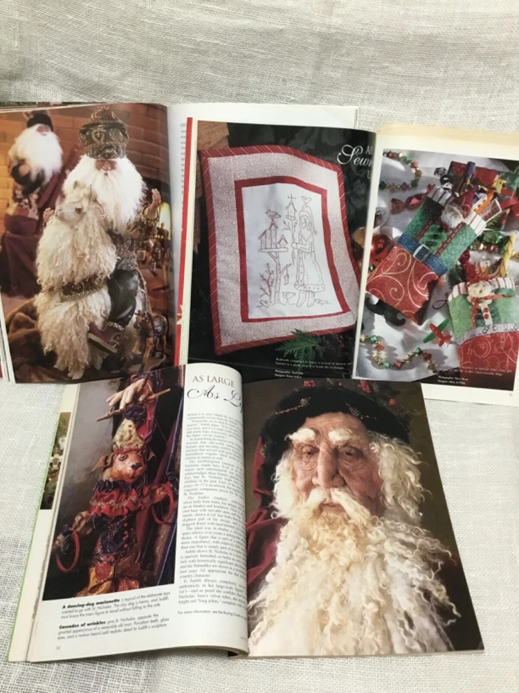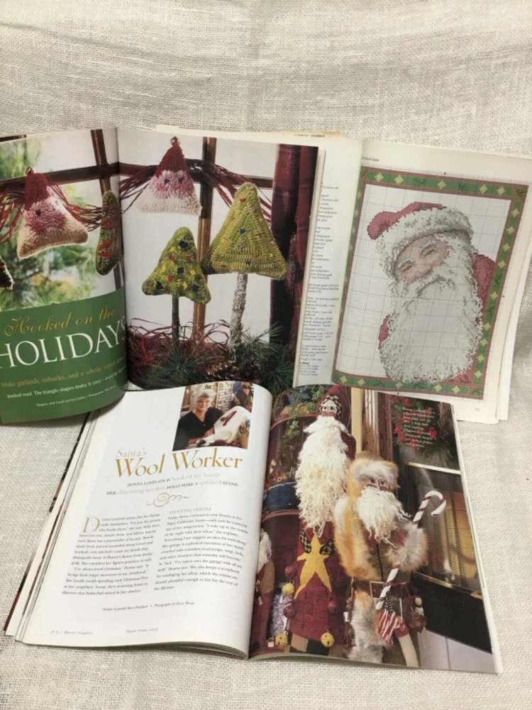 This is for 3 issues of the Better Homes and Gardens yearly publication Santa Claus, dated 1999, 2000, and 2003. Lots of historical Santas, decorating ideas, diy Santa dolls and figures, quilting, rug hooking, knitting, painting etc. I think that they covered it all. Patterns included. Very few pen marks. These weigh 1 lb 13 oz and postage is included in the price.