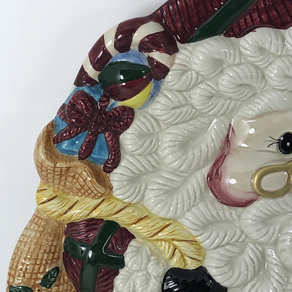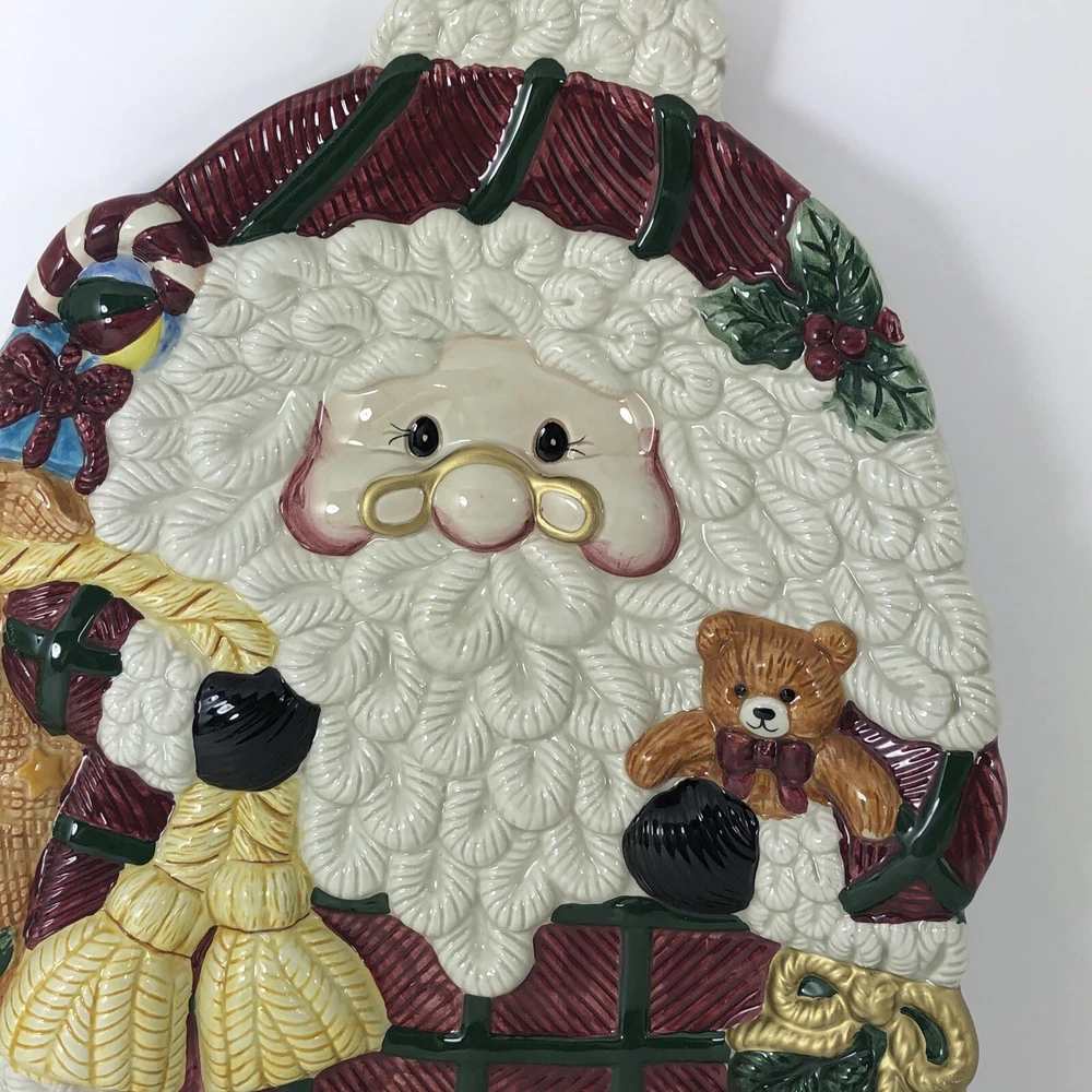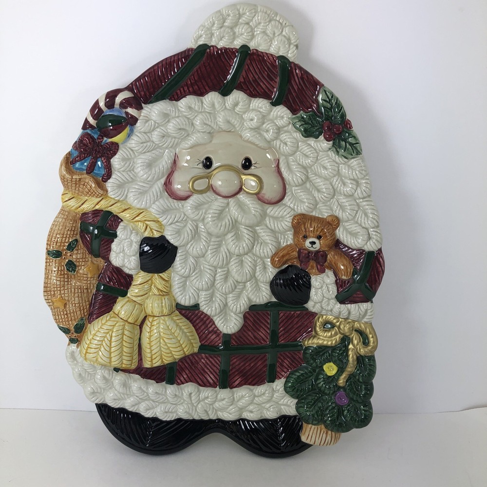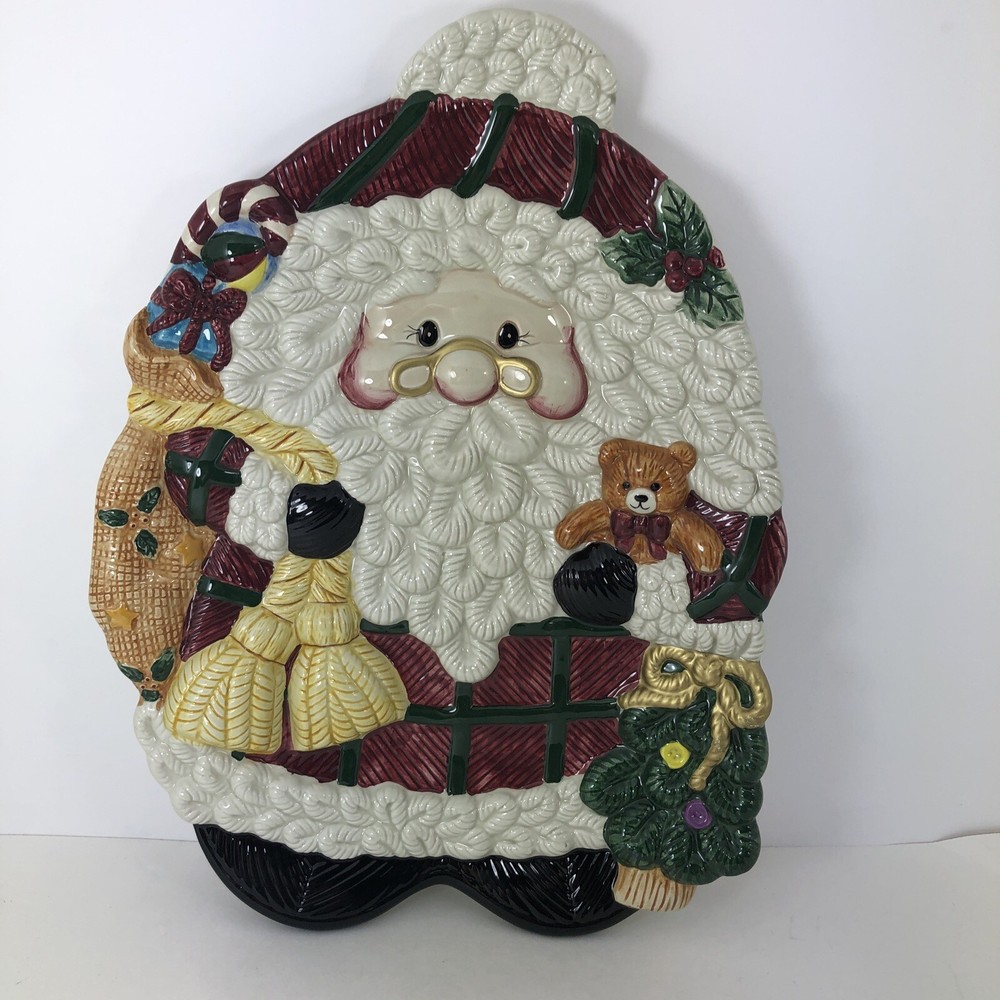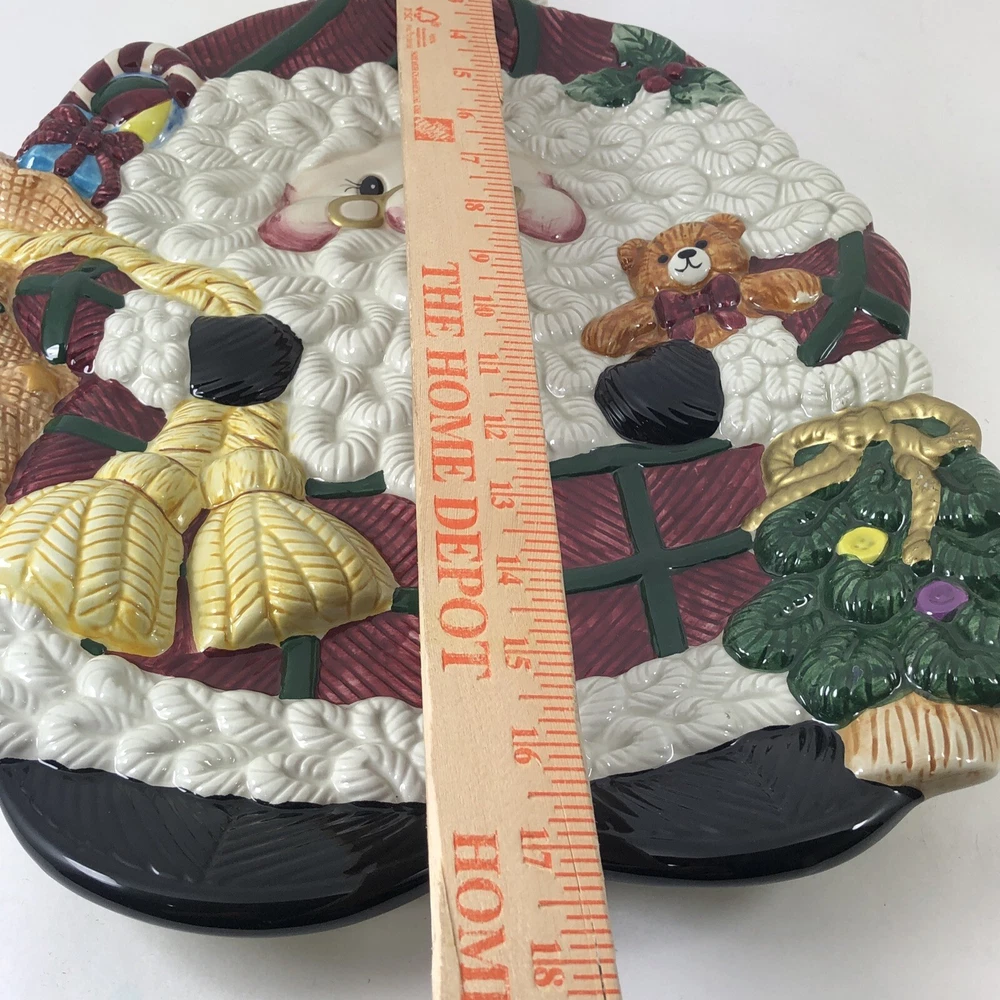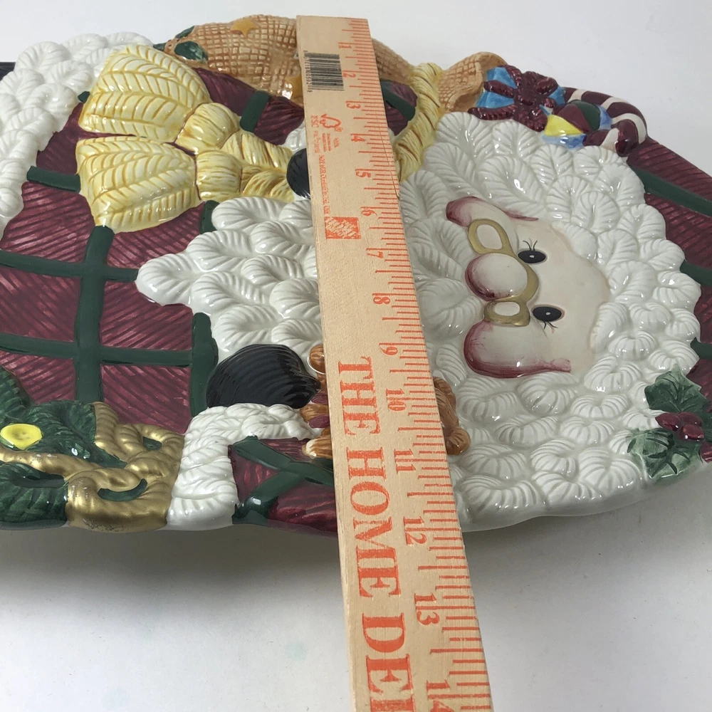 This large Santa platter from Jay Imports is perfect for adding a festive touch to your holiday table. Measuring 16 inches by 12 inches, it features a 3-D design of Santa carrying a sack of toys, a Christmas tree, and a teddy bear. The platter is made of ceramic and comes in a colorful, multicolor design. With its high-quality construction and attention to detail, this Santa platter is sure to be a hit with your family and guests. Whether you're using it to serve appetizers, desserts, or other holiday treats, it's a great addition to any holiday gathering. So why wait? Order yours today and get ready to celebrate the season in style! Excellent condition. No chips cracks or scratches. Please see photos