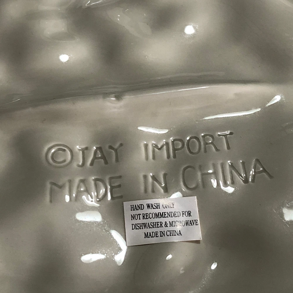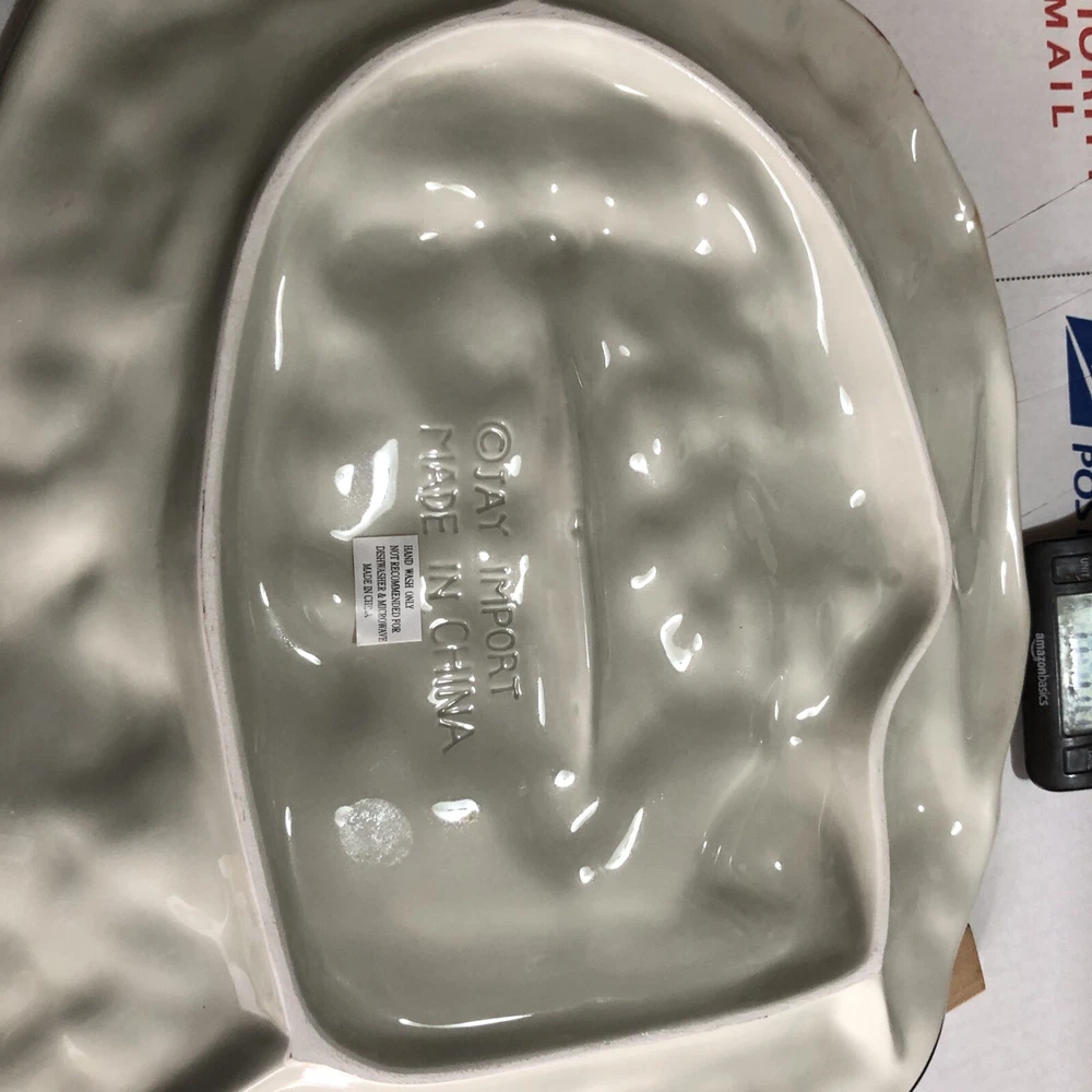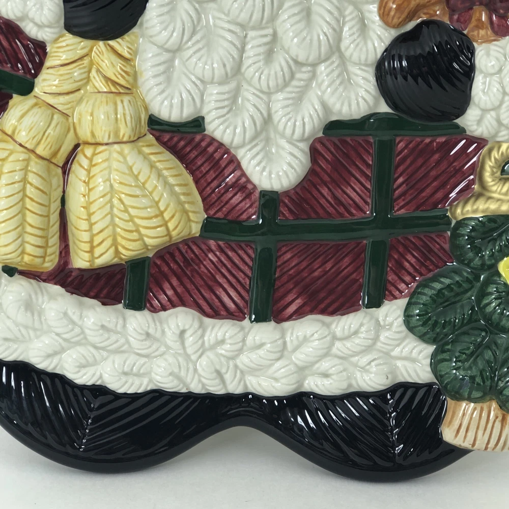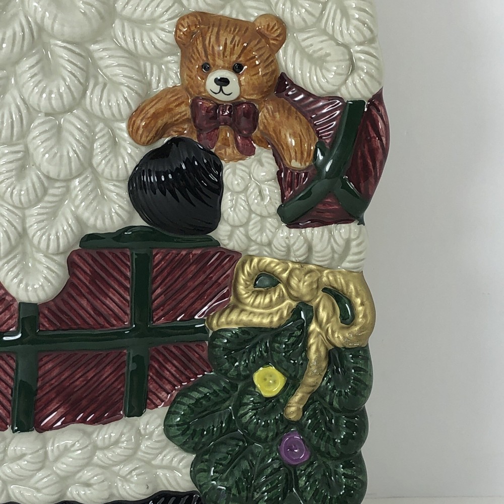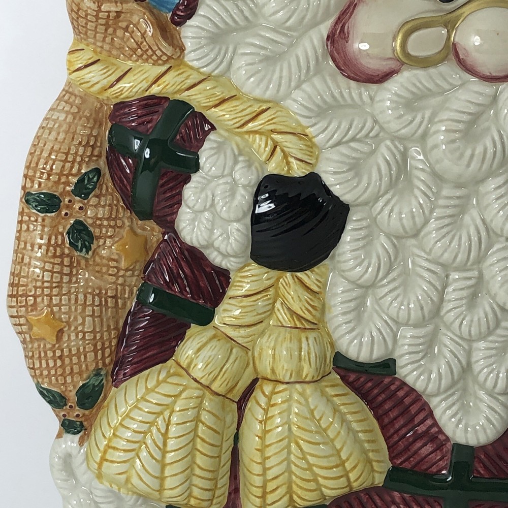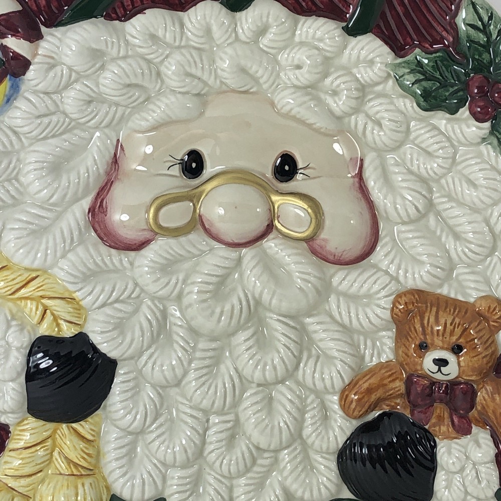 This large Santa platter from Jay Imports is perfect for adding a festive touch to your holiday table. Measuring 16 inches by 12 inches, it features a 3-D design of Santa carrying a sack of toys, a Christmas tree, and a teddy bear. The platter is made of ceramic and comes in a colorful, multicolor design. With its high-quality construction and attention to detail, this Santa platter is sure to be a hit with your family and guests. Whether you're using it to serve appetizers, desserts, or other holiday treats, it's a great addition to any holiday gathering. So why wait? Order yours today and get ready to celebrate the season in style! Excellent condition. No chips cracks or scratches. Please see photos