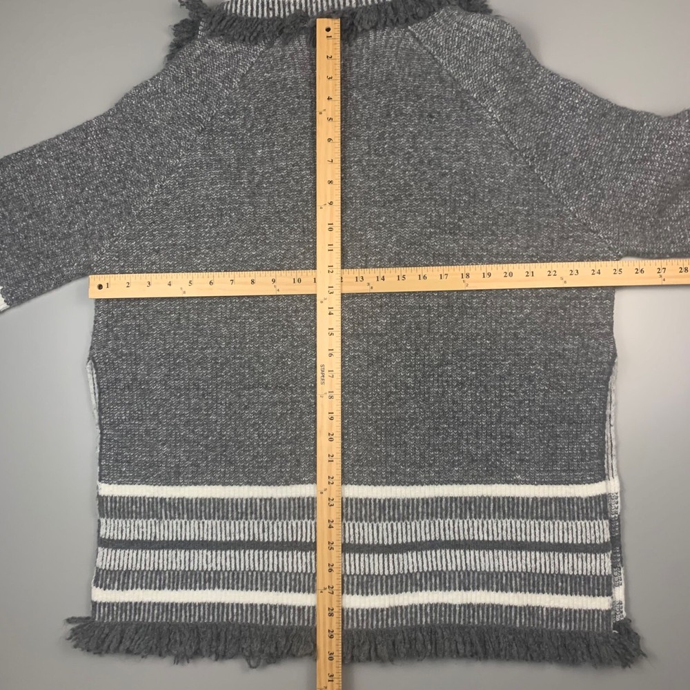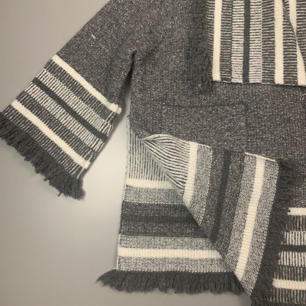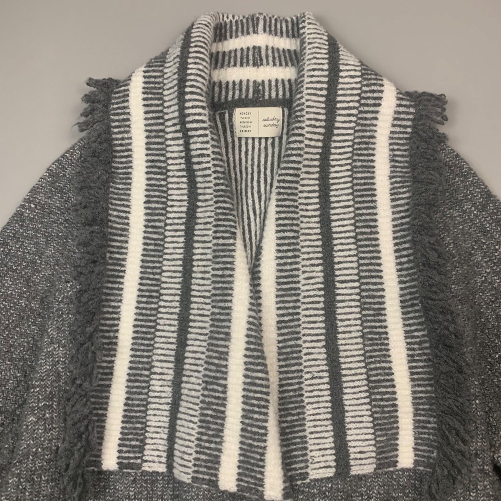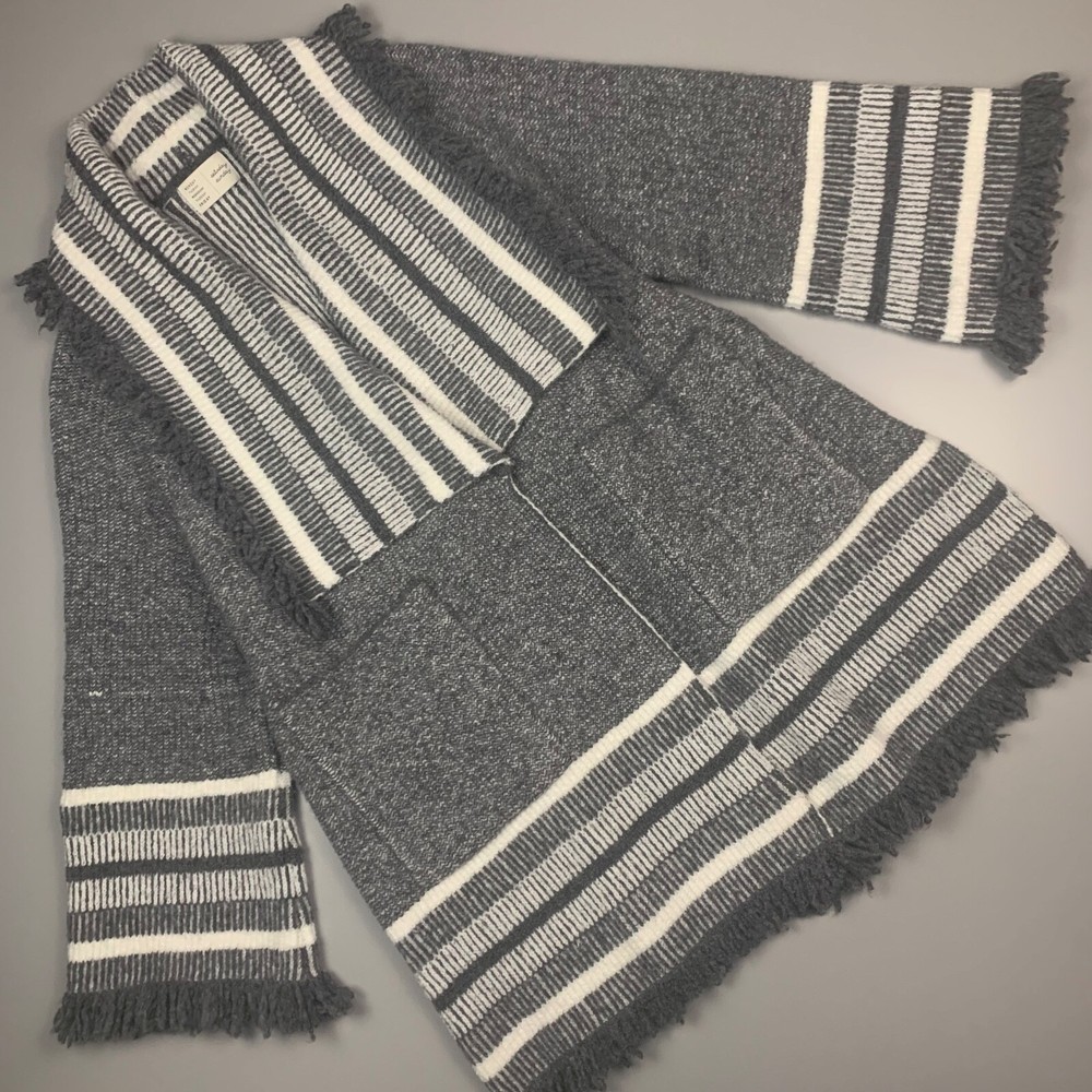 This is a Saturday Sunday, Anthropology open front sweater jacket in women's one size. The sweater has side slits, open front, pockets, wide collar and fringe on the edges. The sweater has a soft and cozy feeling. Measurements are in the photo. The sweater/jacket is in good preowned condition, no stains or rips.
