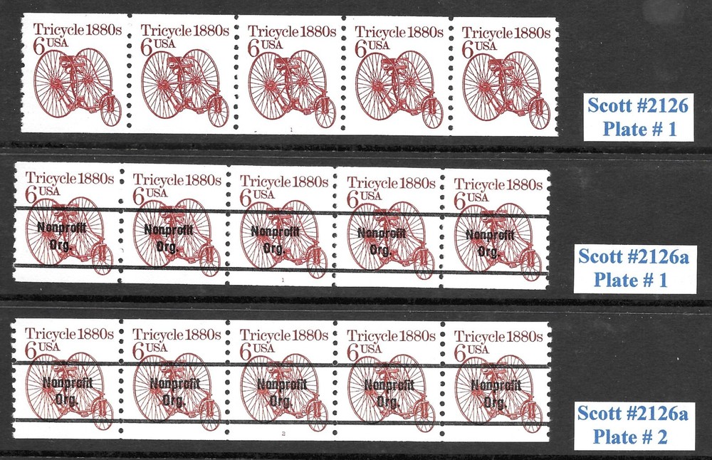 Hello! This is an auction for a COMPLETE set of ALL THREE plate number coil strips of five of tagged Scott #2126, the 6c Tricycle Plate #1 AND untagged, precanceled Scott #2126a, Plates #1-2 . This collection includes all regular tagged and untagged plate numbers represented in the Scott National Album--see above scans. Total 2024 Scott US Specialized catalogue value for the 3 strips is $6.00. All strips have been hand-selected for centering and integrity. All are Very Fine or better. These plate number strips of five are fault-free and all are mint, never hinged. The above scan is a stock scan, but the strips that you will receive will be of the same VF(+) quality. The presence (or not) of precancel gaps may match the above positions of the scanned strips, or they may be in different positions. SHIPPING IS FREE. Check out my other PNC5 auctions--- there's no additional Shipping charge for items won. I'm a 20 year member of the the APS and PNC3. Thanks for looking!