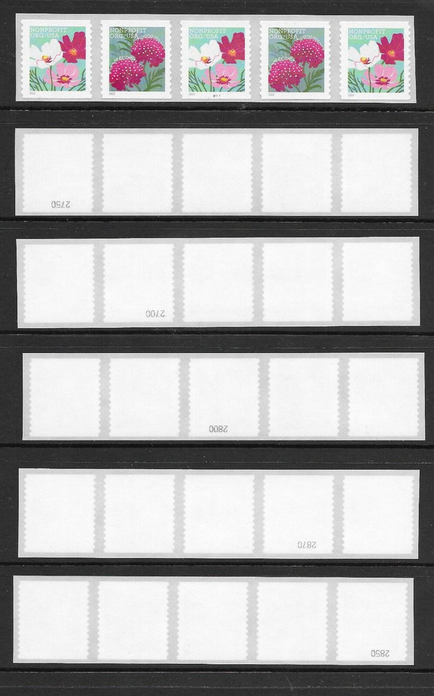 Hello! This is an auction for a complete BACK NUMBER set (and a strip with NO Back Number) of 6 Plate number coil strips of 5 of Scott #5665a, the (5c) Butterfly Garden Flowers, plate number B1111. These stamps come from coils of 3000. TWO different coils of 3000 were required to complete this set---an "odd" coil that contained back numbers on positions 2 and 4 on the strip, and an "even" coil that contained back numbers on positions 1, 3(the Key to the set---"number-on-number") and 5. The 4 digit black back numbers are UPSIDE-DOWN in relation to the position of the stamps on the strip. The above scan is a stock scan and may or may not represent the strips that you will receive. The only difference will be the back counting number. The 2022 Scott catalogue value for a regular PNC strip of 5 (with no consideration for back counting numbers) is $1.60. The strips are never hinged, are VF and have no flaws. Shipping is FREE! Check out my other PNC5 auctions--- including ERRORS! I'm a 20 year member of the the APS and PNC3. Thanks for looking!