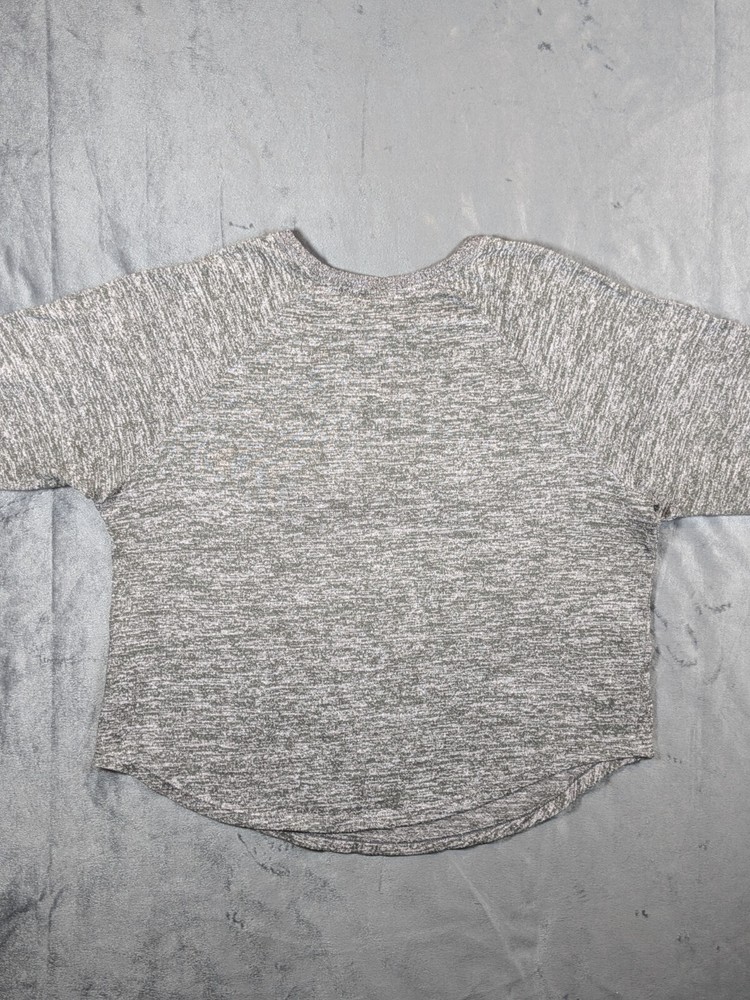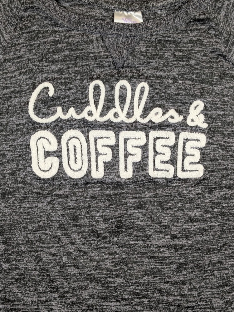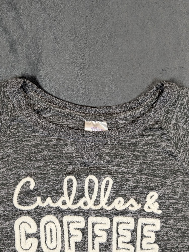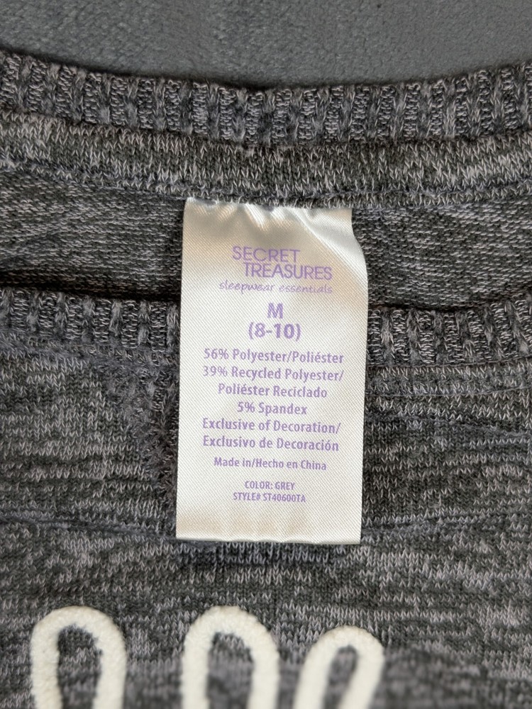 This Secret Treasures pajama top is a cozy and soft sleepwear option for women in size M (8-10). The top features a striped pattern in a stylish gray color, with long sleeves and a round neckline for added comfort. Made of a lightweight blend of polyester and spandex, this garment is perfect for all seasons and is machine washable for easy care. The top also includes a logo accent, making it a fashionable choice for relaxing at home.