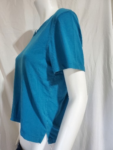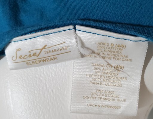 This Secret Treasures sleepwear top is perfect for a cozy night of sleeping or lounging. The soft and comfortable French terry cloth fabric comes in a lovely shade of blue, and the top features a crew neck and short sleeves with a pullover easy closure. The top blouse shirt is machine washable and made of a blend of polyester, cotton, and rayon materials, making it perfect for all four seasons. The size S (6/8) women's sleep top lounge shirt has a solid pattern and accents that add to its cozy feel. The sleep shirt does not have any graphic prints, and it is not vintage or handmade. It comes from the Secret Treasures product line, and it is perfect for those who love a comfortable and soft sleepwear top.