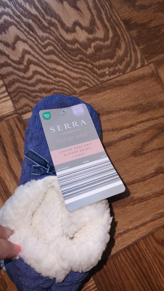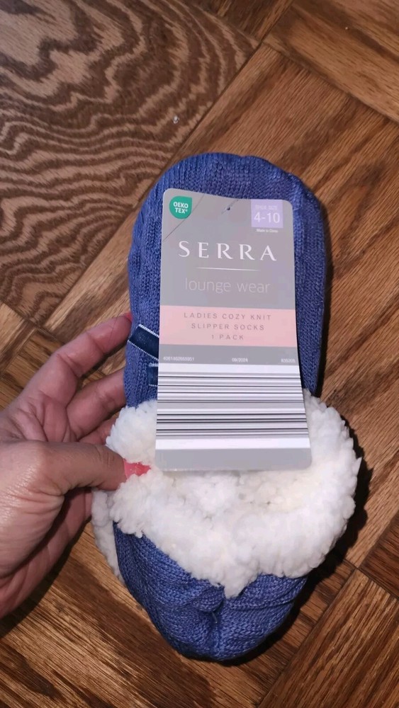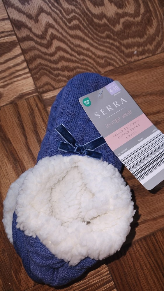 I don't accept returns ‼️‼️‼️‼️Keep your feet cozy and stylish with these Serra Ladies' Cozy Knit Slipper Socks. The knitted pattern and blue color make these socks a perfect addition to your loungewear collection. These socks are designed for women and come in size L, making them a comfortable fit for most. These bed/slipper socks are made by the brand Serra and are perfect for keeping your feet warm and comfortable during cold weather. They are also great for everyday wear, especially if you spend a lot of time indoors. Get yourself a pair of these comfortable and stylish socks today!