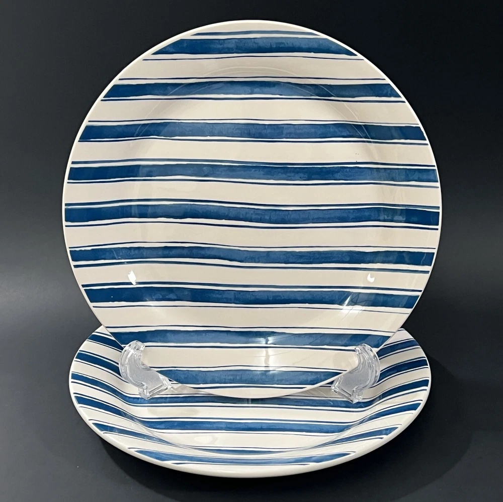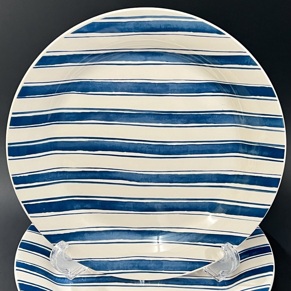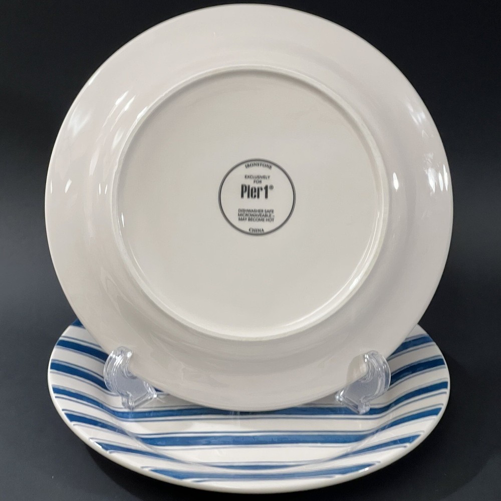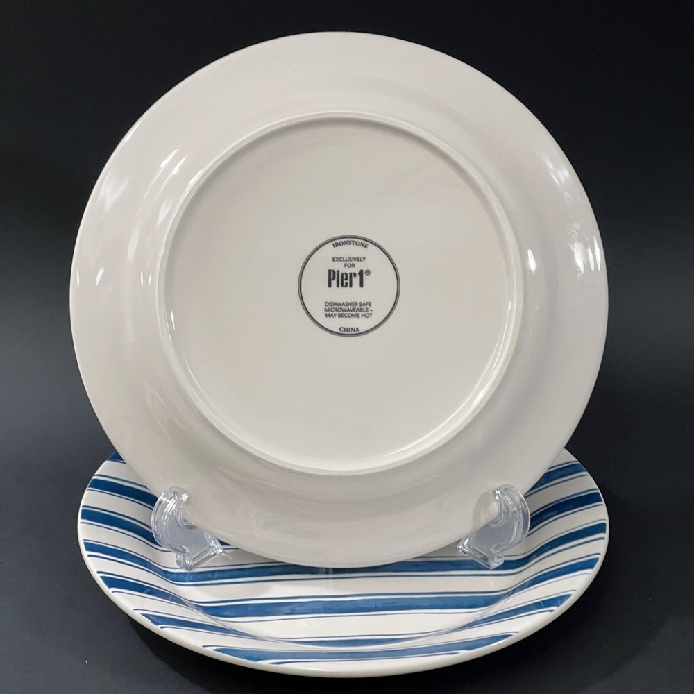 Set of 2 Pier 1 Exclusive Blue & White Striped Hand Painted Ironstone Salad Plates Nautical Themed 8.75" WIDTH VERY GOOD CONDITION NO CRACKS OR CHIPS OR CRAZING Microwave & Dishwashers Safe