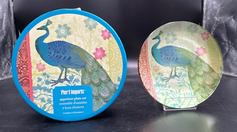 (4) Pier 1 Imports~Peacock π¦ Design/Silver Foil Backing~6β Appetizer Plates~Boxed!. π¦ Hand wash only~Delicate, beautiful~ New in box.