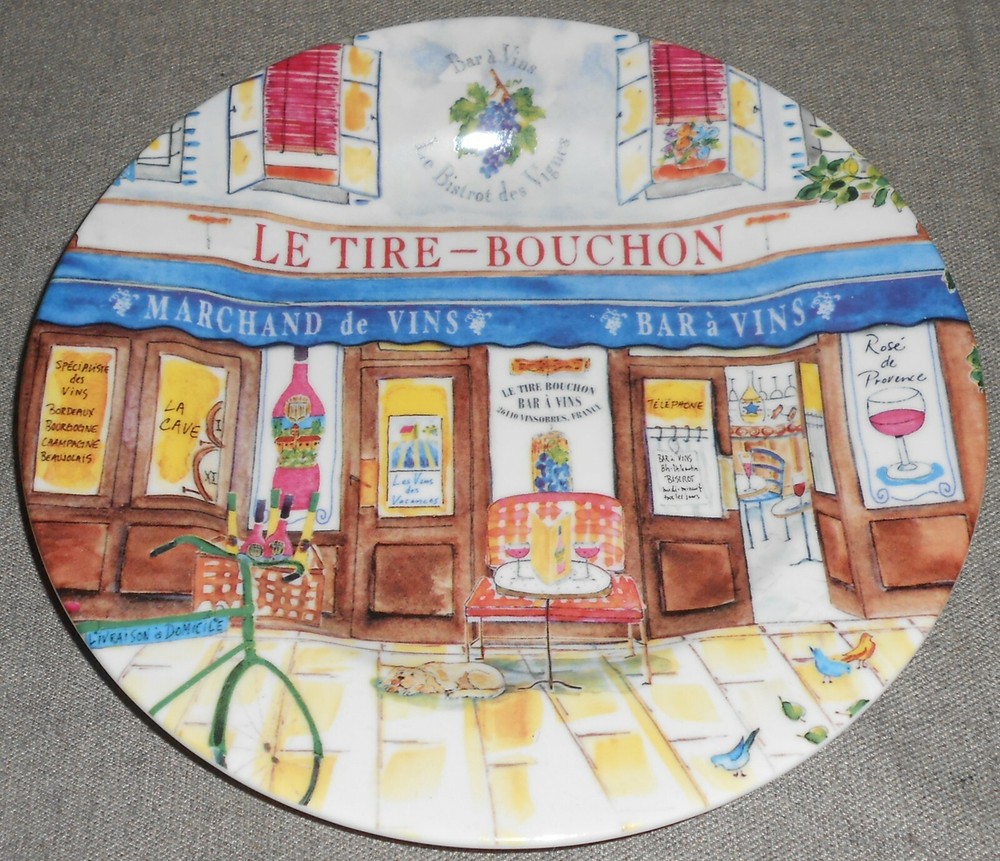 This is a Set of (4) 7 1/4" Porcelain Plates from Sisson Imports and The fRench Collection by Jill Butler. The graphics depict wine bars and reads LE TIRE-BOUCHON above and the plates are all in good pre-owned condition with no chips or damage. AUCTION TERMS AND CONDITIONS: Please email me with any questions. I am occasionally out of town for 2-3 days at a time but I will attempt to answer any questions immediately or upon my return. Payment is expected within three working days from purchase date unless other arrangements have been made. I ship via USPS Priority Mail (2-3 working days delivery) or FedEx Home Delivery (5-7 working days delivery)depending on which method you select at checkout. Purchases may be subject to applicable State Sales Tax if you live in a State that collects sales tax from out of State purchases. THANKS FOR LOOKING! SLF#48-UD