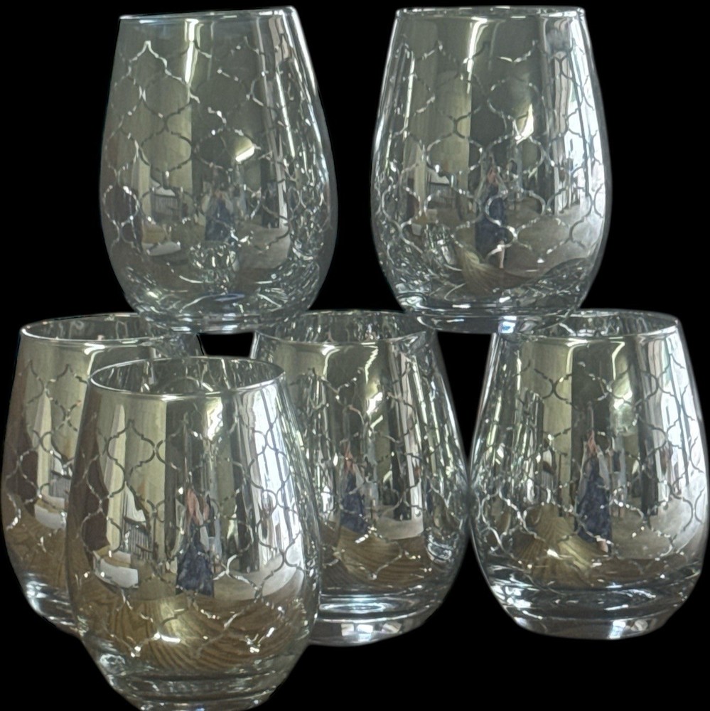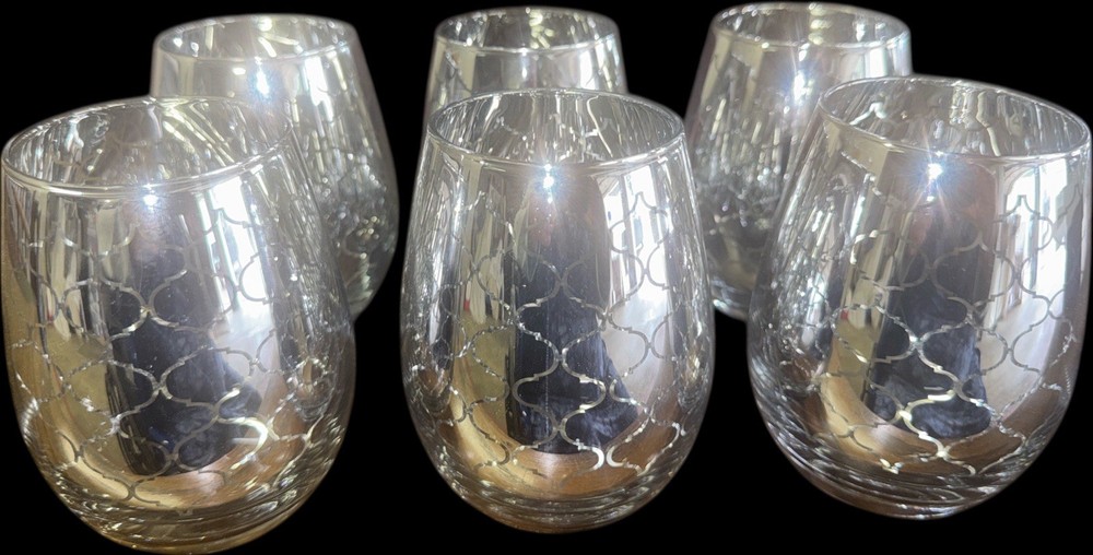 The product is a set of six Pier 1 Imports silver electroplated stemless wine glasses with a geometric design. These round wine glasses have a capacity of 20 oz and an item height of 4.5 inches. They are suitable for all occasions and are made of glass. This four-piece set is perfect for serving wine to a group of six people, adding a touch of elegance to any dining or entertaining setting.