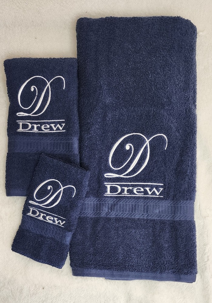 Personalized 3 piece towel set: bath(27x52} hand(16x26 towel and washcloth(12x12) combo set. All items are custom made. I have a range off designs just ask...sports, mascots, cartoons, sayings and many more. Please specify color of towels white, black, grey, blue. These towels will be personalized at your request for FREE! Simply include your request in the comment box or send us a separate message with details. Smoke and pet free environment. COLOR AND TOWEL DESIGN MAY VARY DO TO AVAILABLITY! Thank you for viewing our listings and be sure to check back. We are constantly adding new items. So add us to your favorite sellers list and visit often. Thanks