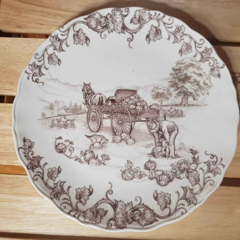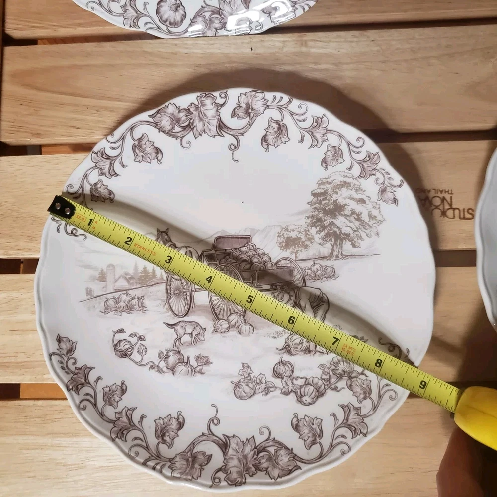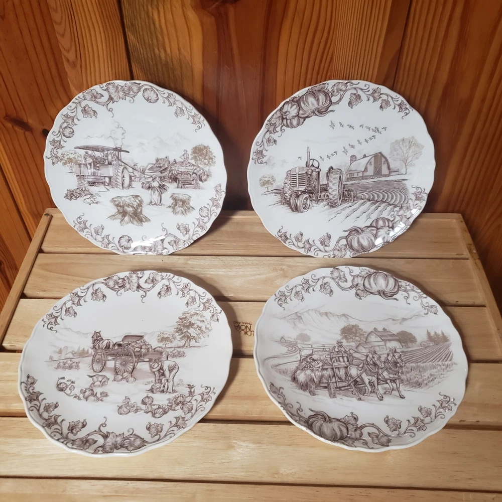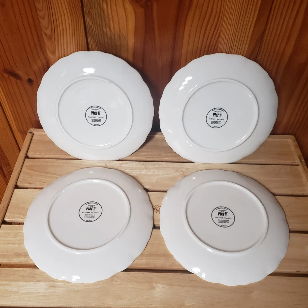 Set O 4 Pier 1 Imports Salad Plates Harvest Village Collection 8 3/4" Farm Life Nice pre-owned condition with original box which is also in very nice condition. Plates, although i cant be sure, do not appear used. One which i point out in last photo has a tiny spot that looks as though it might be a factory flaw? since the plates dont look used and the glossy finish, the way it looks at that little spot, looks like it could have been there at firing time. But again, cant say for sure. They are still all beautiful plates and the spot is so small, it doesnt ruin the visual at all. See pics for detail. Thanks for looking!