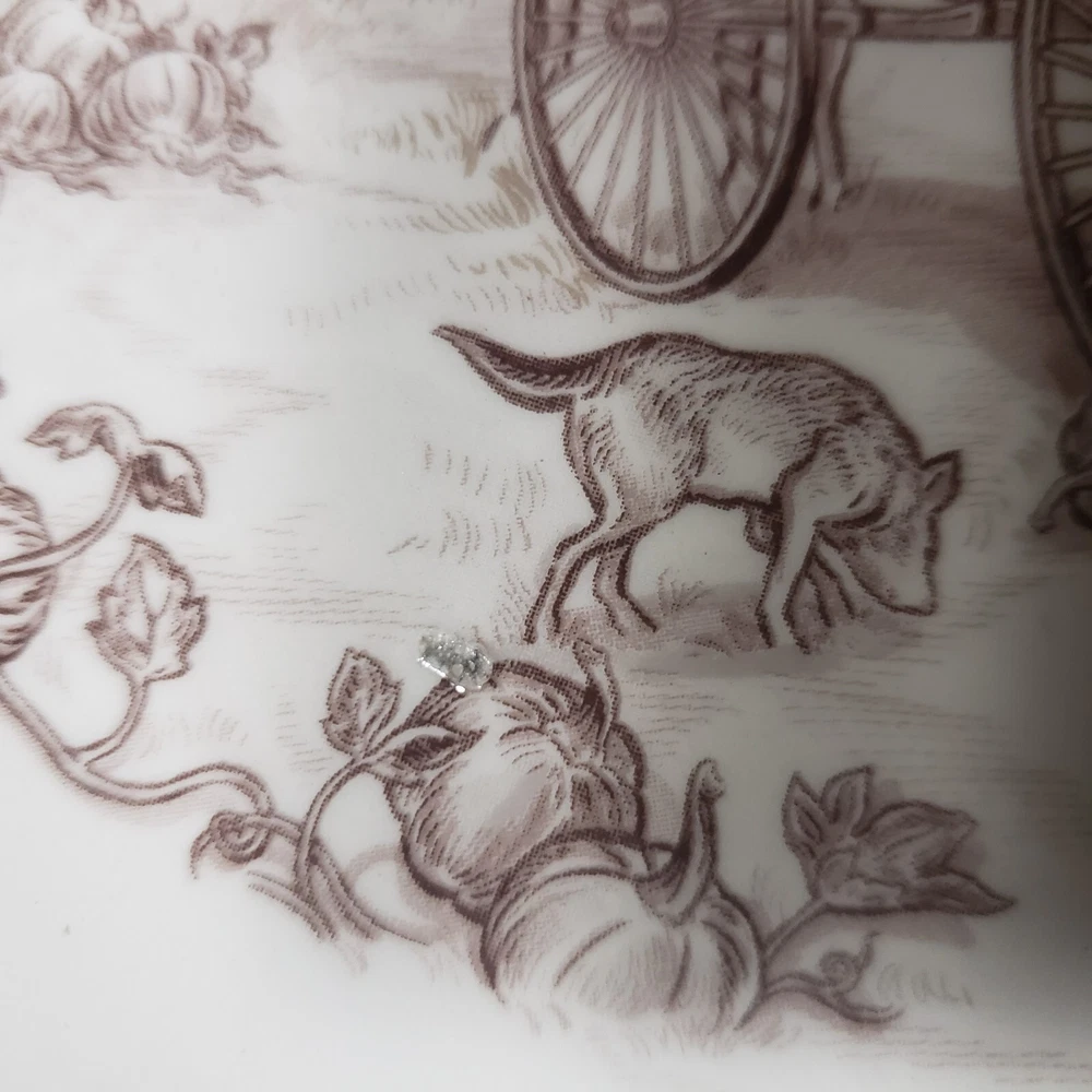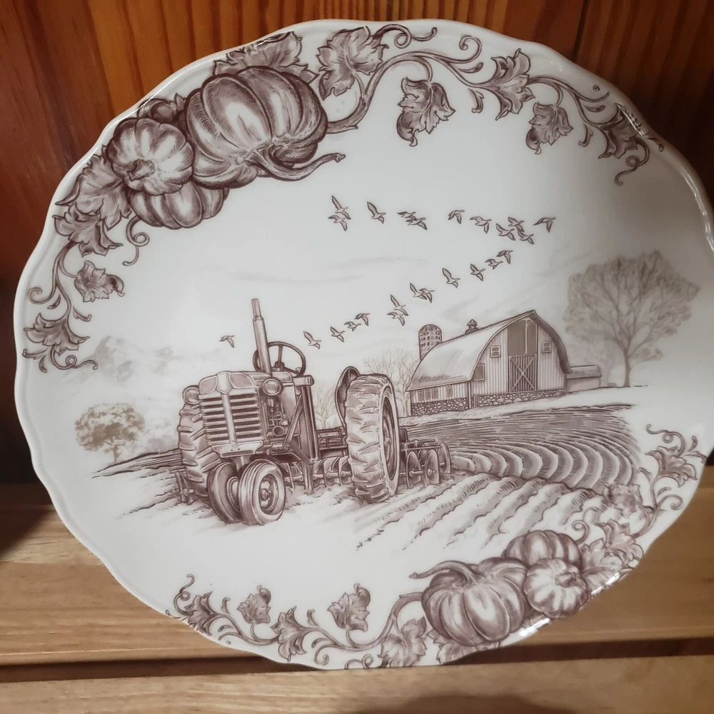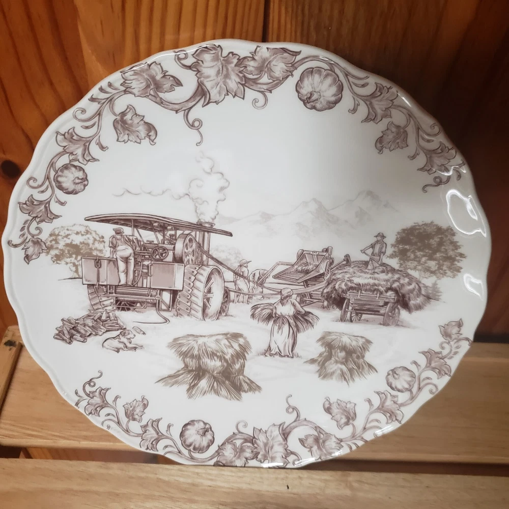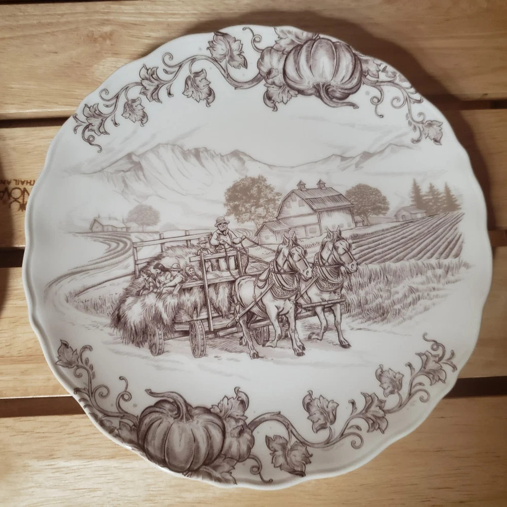Set O 4 Pier 1 Imports Salad Plates Harvest Village Collection 8 3/4" Farm Life Nice pre-owned condition with original box which is also in very nice condition. Plates, although i cant be sure, do not appear used. One which i point out in last photo has a tiny spot that looks as though it might be a factory flaw? since the plates dont look used and the glossy finish, the way it looks at that little spot, looks like it could have been there at firing time. But again, cant say for sure. They are still all beautiful plates and the spot is so small, it doesnt ruin the visual at all. See pics for detail. Thanks for looking!