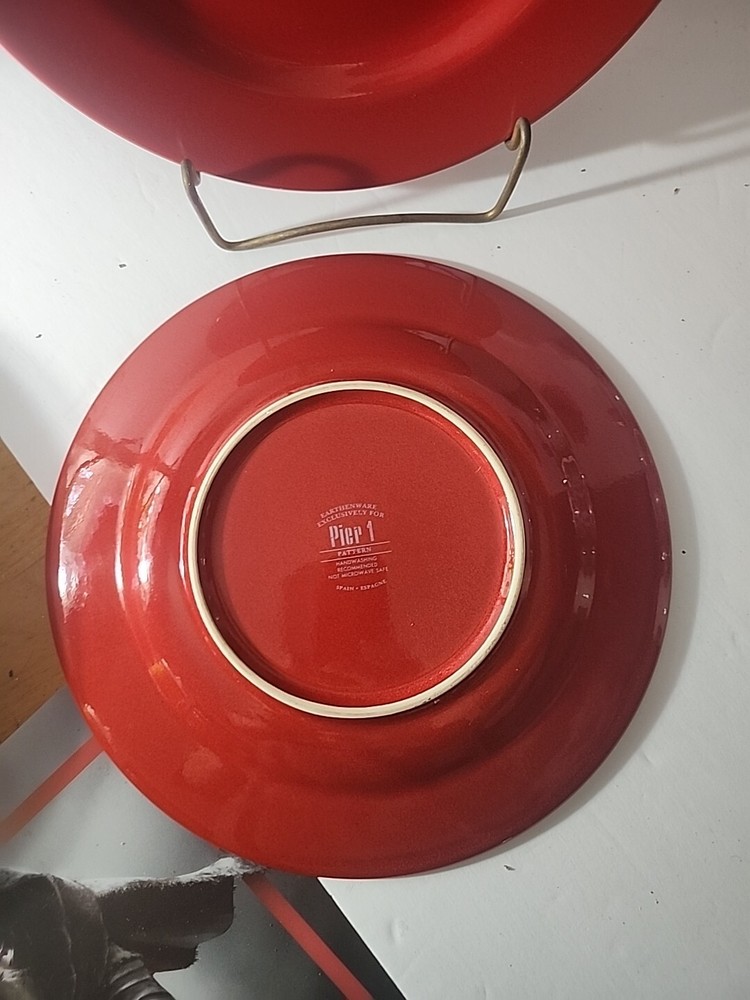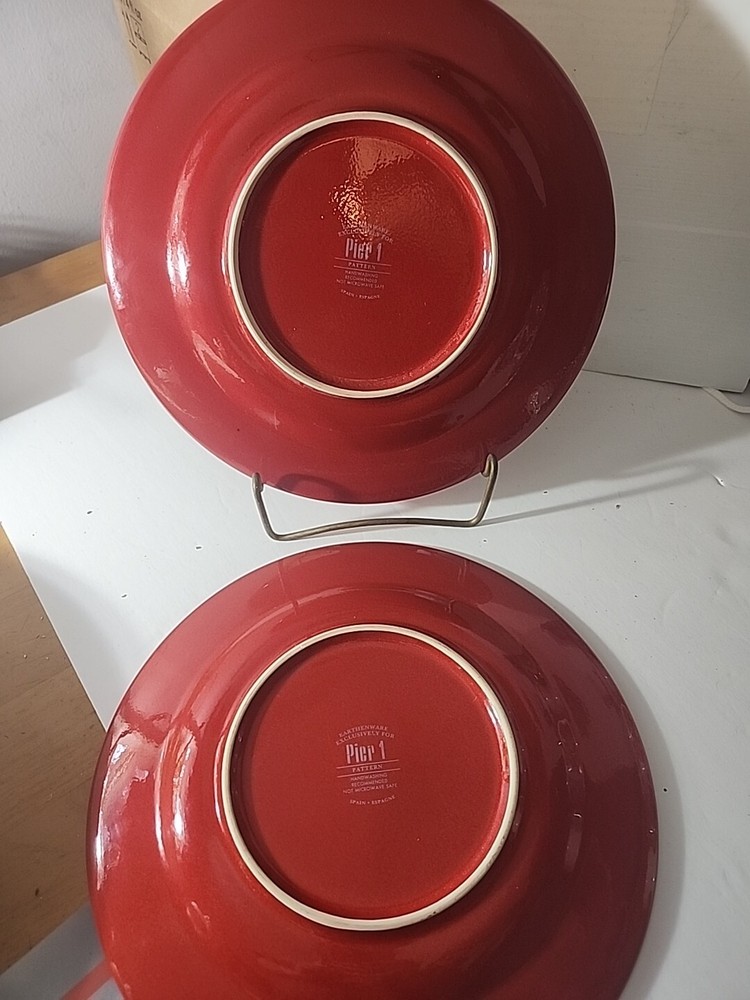 Set of 2 This beautiful dinner plate from Pier 1 Imports is a one-piece set with a round shape and a glossy finish. The plate is hand-painted in a stunning burgundy red color with an earthenware design, making it a perfect addition to any dinnerware collection. The plate measures 10 5/8 inches in width and has a printed backstamp. The Italian-style dinner plate is an original, licensed reproduction with a production technique of pottery. It is perfect for all occasions and has a unique pattern PER170. The plate is handmade and features an art pottery production style. This Pier 1 Imports dinner plate is a must-have for anyone looking to add a touch of elegance to their dining experience.