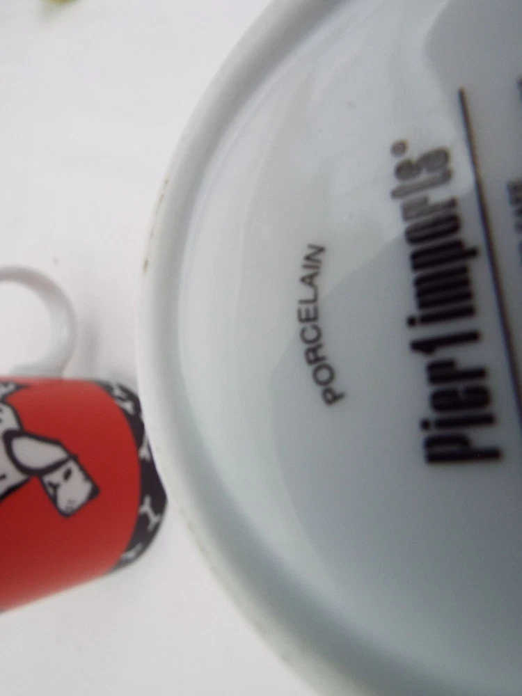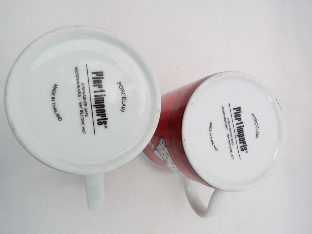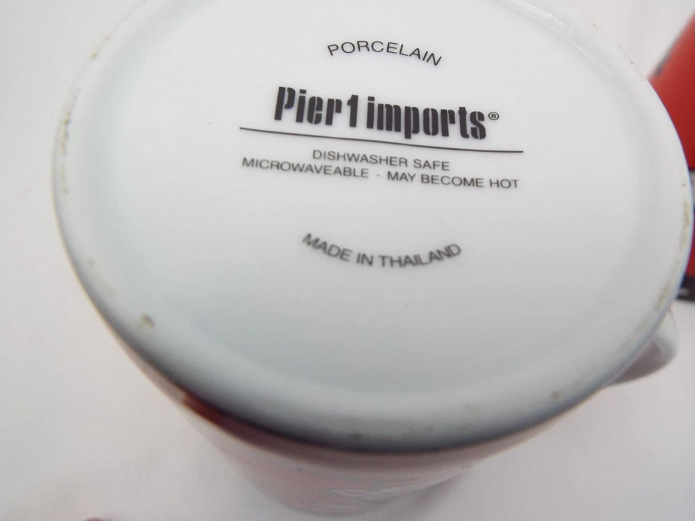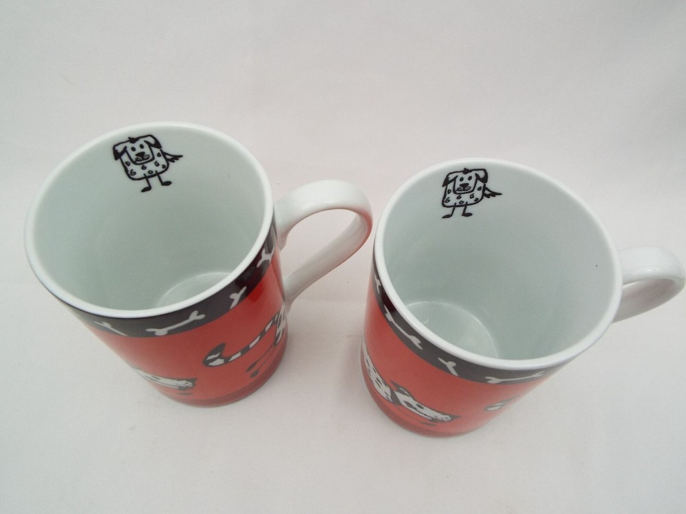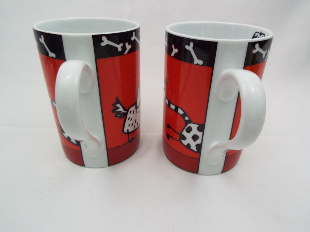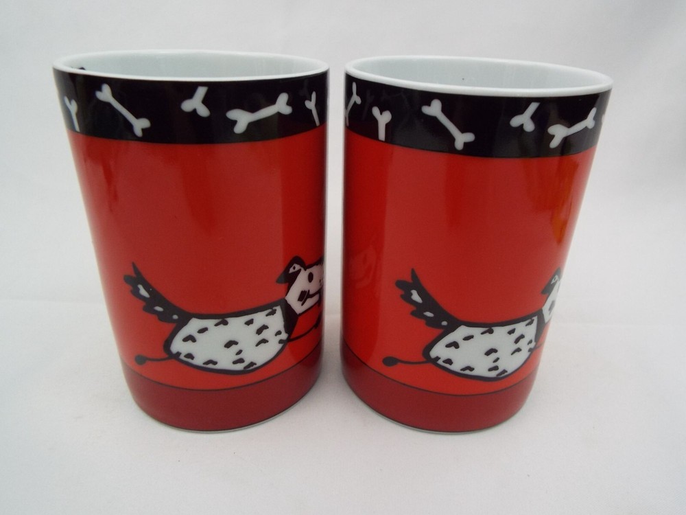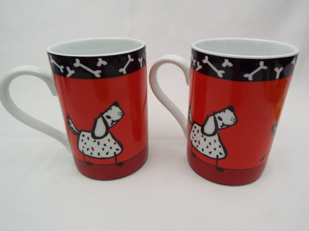 This set of Pier 1 Imports mugs showcases a delightful Dalmatian dog design on a vivid red and black background. Made from durable porcelain, these mugs offer a playful yet sophisticated touch to your kitchenware. Ideal for dog lovers and collectors, they add charm and character to your coffee or tea experience. • Made from high-quality porcelain • Dalmatian dog chasing cat with bone design • Red and black color scheme • Comfortable handle grip • Dishwasher safe Features: Thailand Condition: Pre-Owned Pre-owned condition, some wear on bottom rim. no cracks or chips.