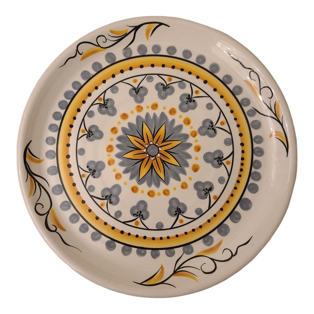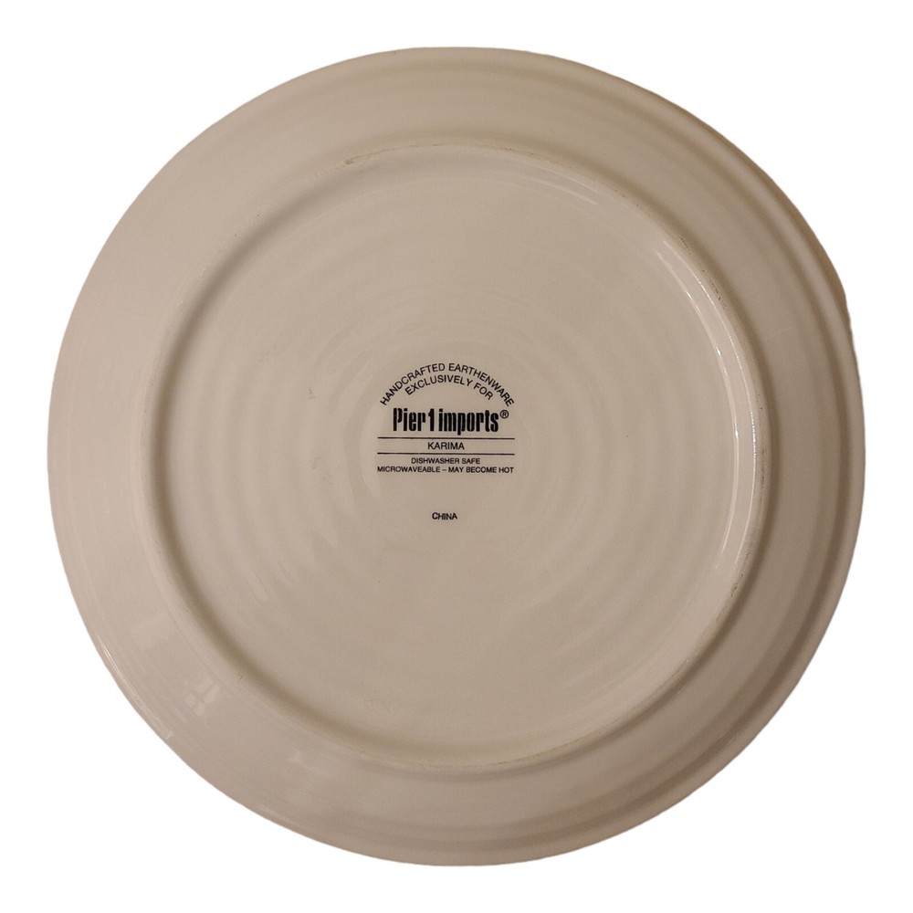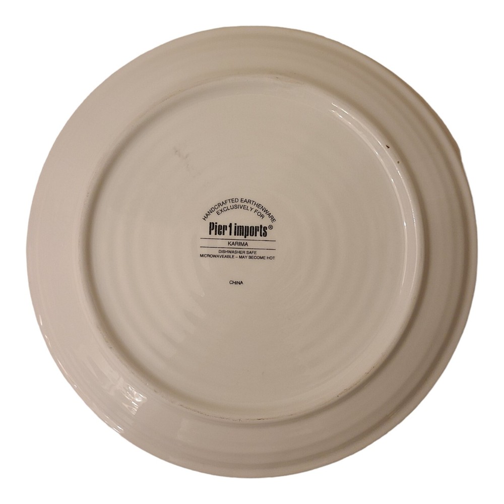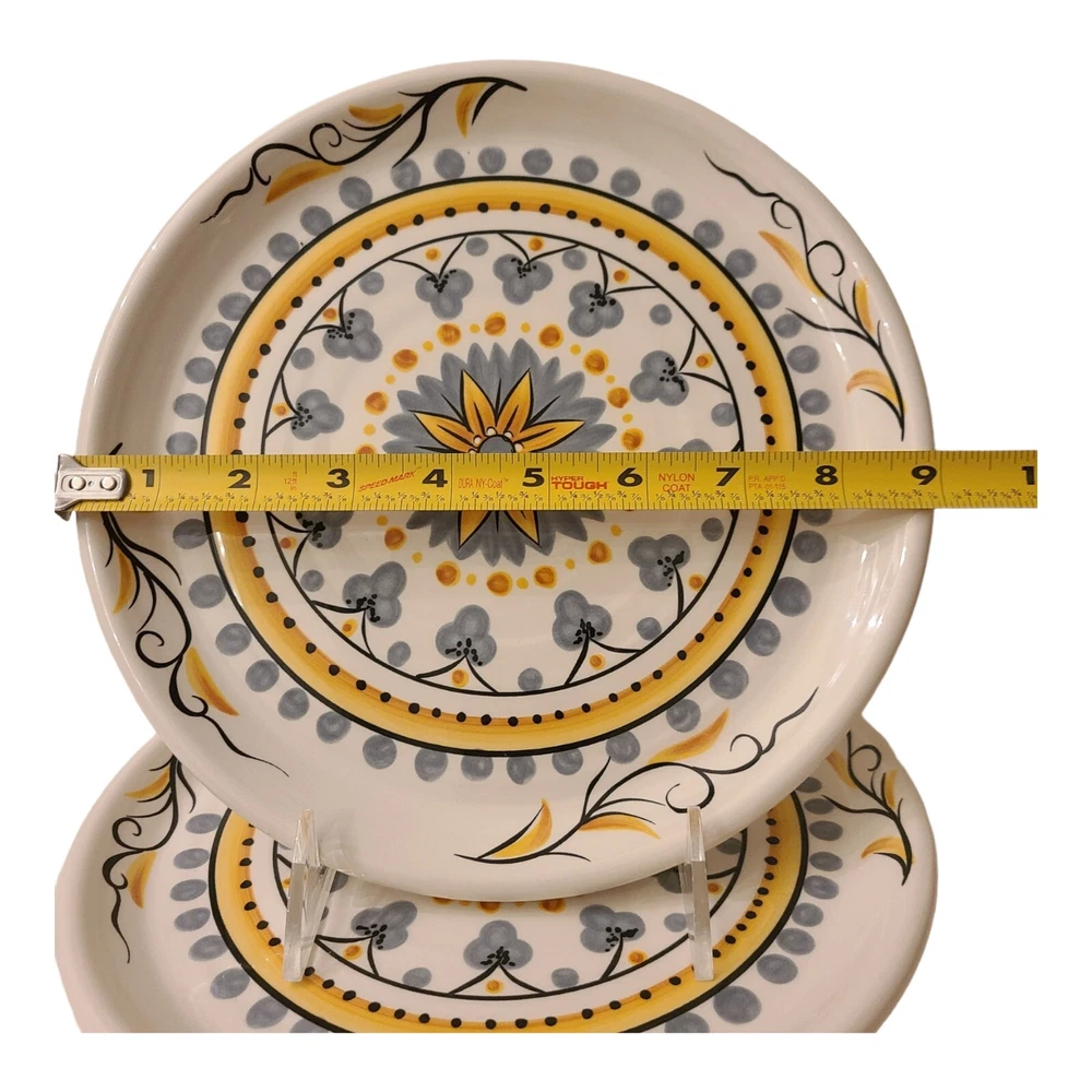 Add some flair to your table setting with this beautiful Pier 1 Earthenware Karima set of two geometric flower luncheon salad plates. The plates feature a stunning yellow, gray, black, and white color scheme and are made of high-quality earthenware. These plates are perfect for any occasion, whether it be a casual lunch or a special dinner party. They are easy to clean and are sure to impress your guests. Don't miss out on the chance to add this lovely set to your collection. Pre-owned and purchased from a nice estate. No chips, cracks or repairs that I can see. Please look at all pictures carefully, as they are part of the description. Feel free to email me with any questions. Thanks for looking!!!
