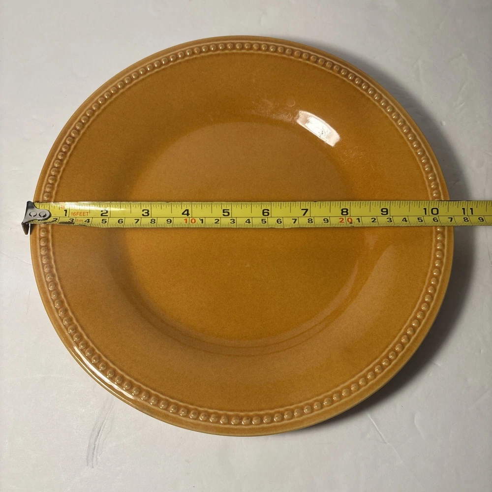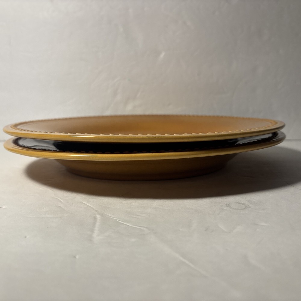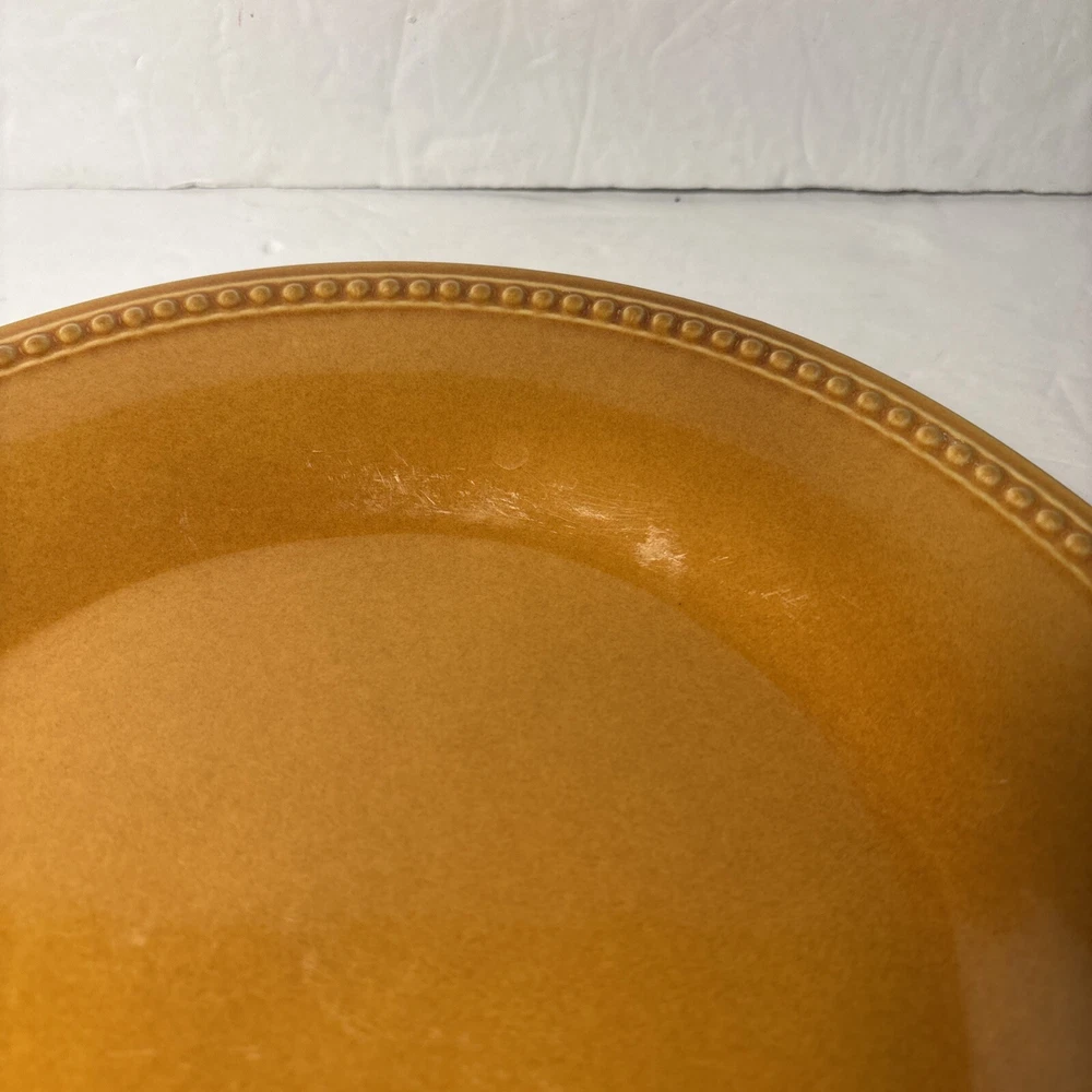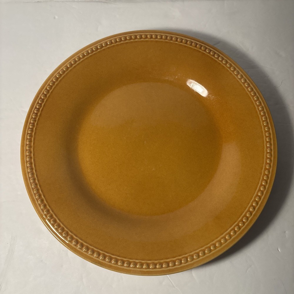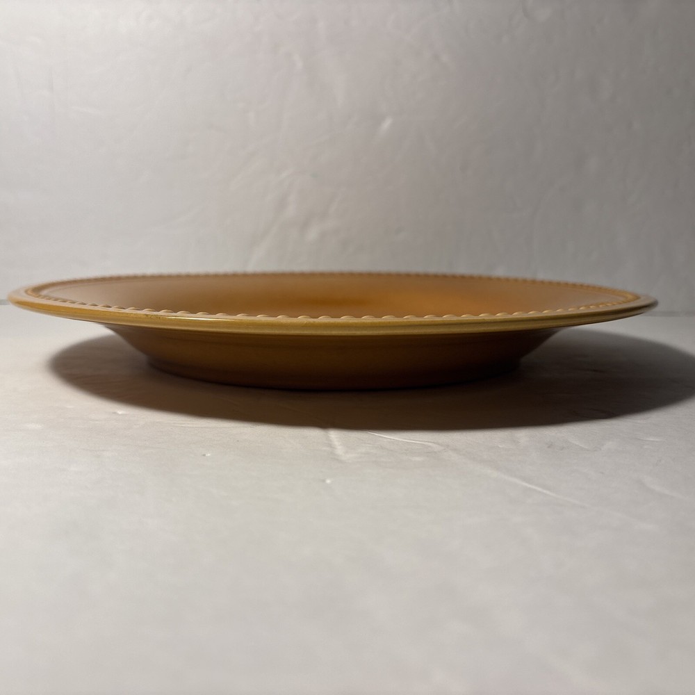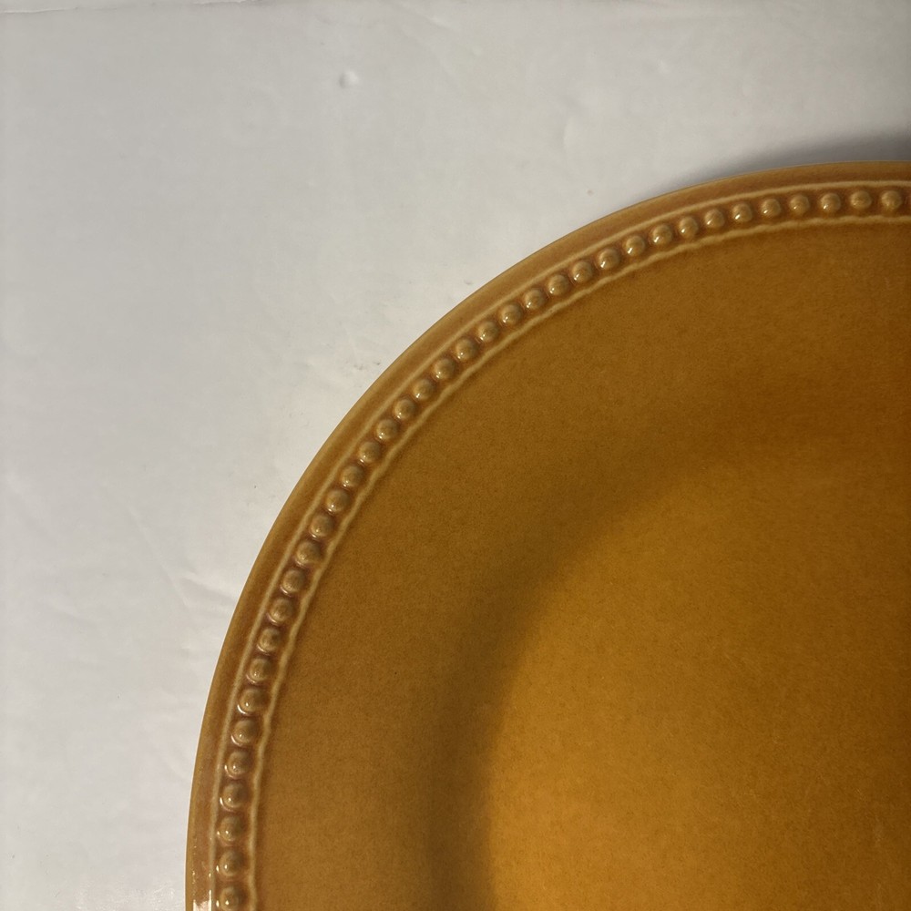 ✨ Item Overview: Brighten your table with this set of 2 Pier 1 Imports Spice Route dinner plates in the warm and inviting Ginger Yellow glaze. These 10.5” stoneware plates feature a textured beaded rim and a rich finish that adds a vibrant, earthy touch to any meal. A beautiful find for everyday use or expanding your collection. 🍽️ Features: Brand: Pier 1 Imports Line: Spice Route Color: Ginger Yellow Material: Stoneware Diameter: 10.5 inches Style: Beaded Rim 🧼 Condition: Plates are in good condition with some typical utensil marks from prior use. No chips or cracks. The glaze is still glossy and the beaded detail remains sharp and beautiful—ideal for casual meals or decorative use. 📸 What's Included: 2x Pier 1 Spice Route Ginger Yellow 10.5” Dinner Plates 🛒 Why Buy From Us? We specialize in unique, discontinued, and high-quality dinnerware. Every item is carefully inspected and shipped fast. Trust us for excellent customer service and a smooth, honest transaction every time. 🎗 Notes to the Buyer: This set is part of the Pier 1 Spice Route collection—known for its warm colors and rustic charm. These plates mix beautifully with others in the same line, like Clove and Paprika. Perfect for collectors or anyone wanting to enhance their table with bold, natural tones. 🔑 Keywords: Pier 1 Ginger Yellow, stoneware dinner plate, Spice Route collection, yellow stoneware dishes, rustic yellow plates, 10.5 inch plate, beaded rim dinnerware, Pier 1 Imports dinnerware, collectible plates, earthy tone kitchenware