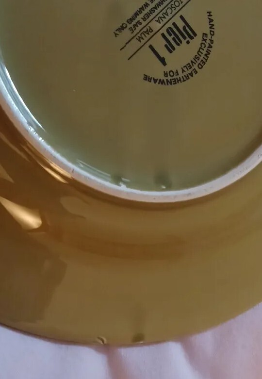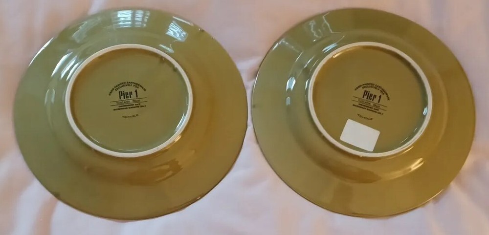 Set of 2 luncheon/ salad plates. Pier 1 Toscana Palm which is similar to an avacado green. The original price tag is still attached to one place, the other may have had dome minimal usage. Manufacturers flaw on the back of one plate. Please review pictures and reach out with questions