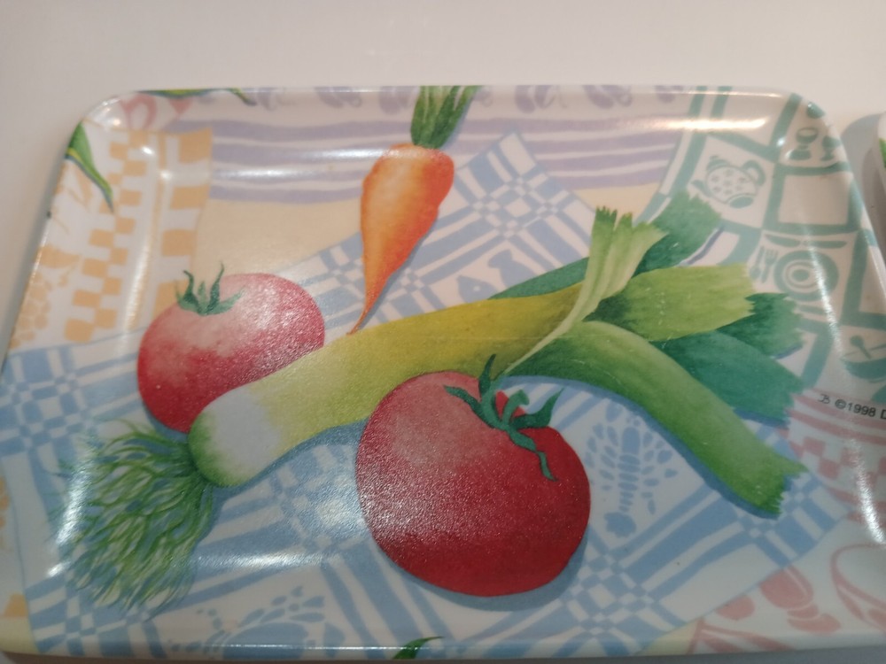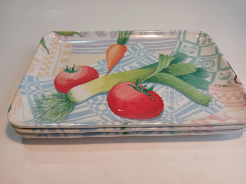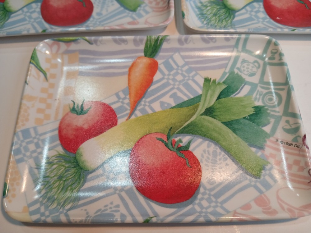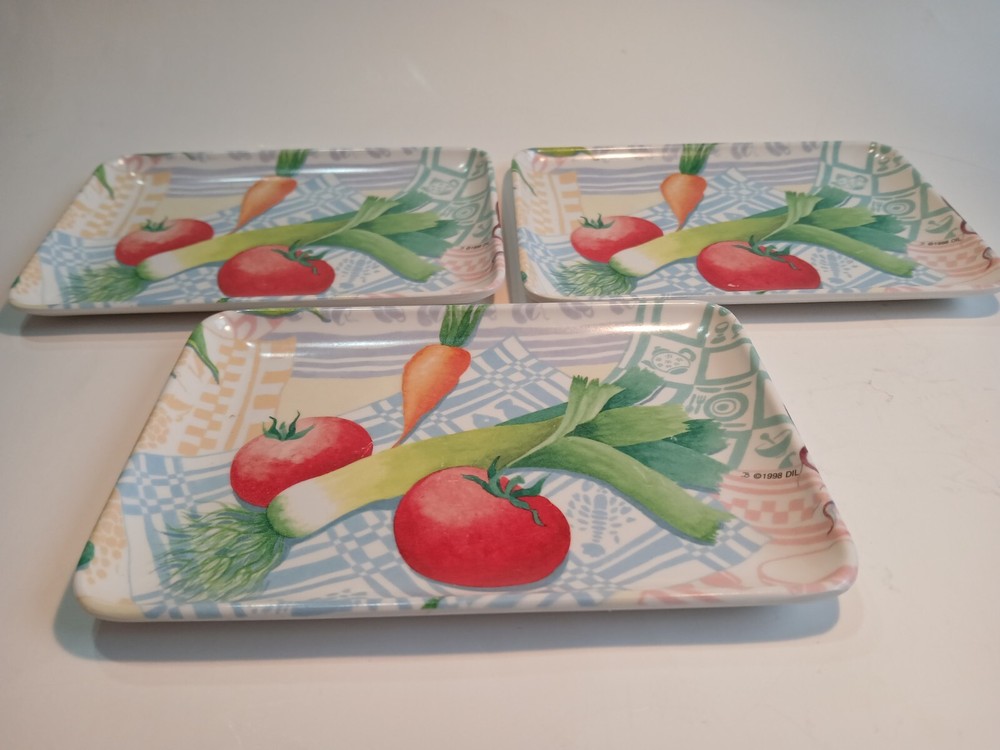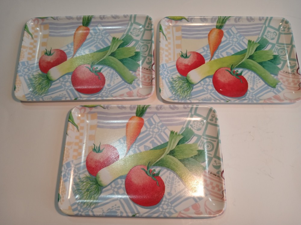 Set of 3 6 x 4 ( approximately) Plastic trays with a veggie Motif. Design Imports Providence Rhode Island, Made in Italy 1998. These are in decent Used condition & are really cute! Some slight wear from age. Please see photos for details. Sold as is & no returns.