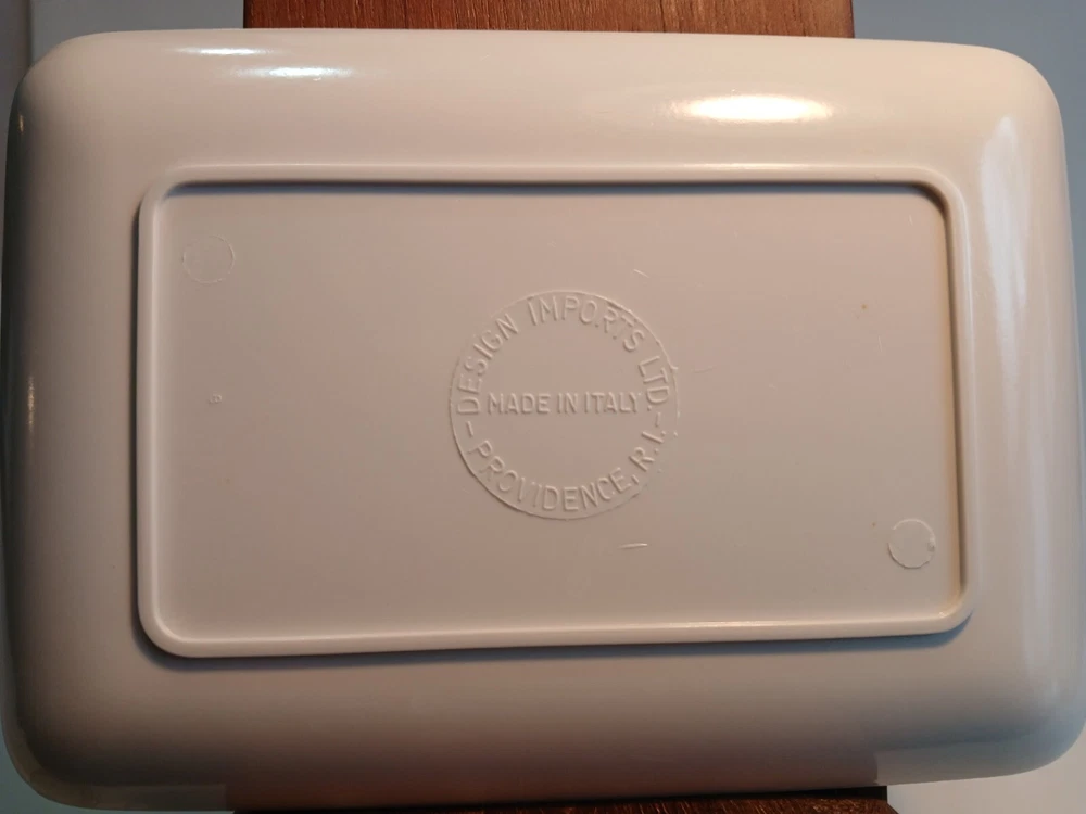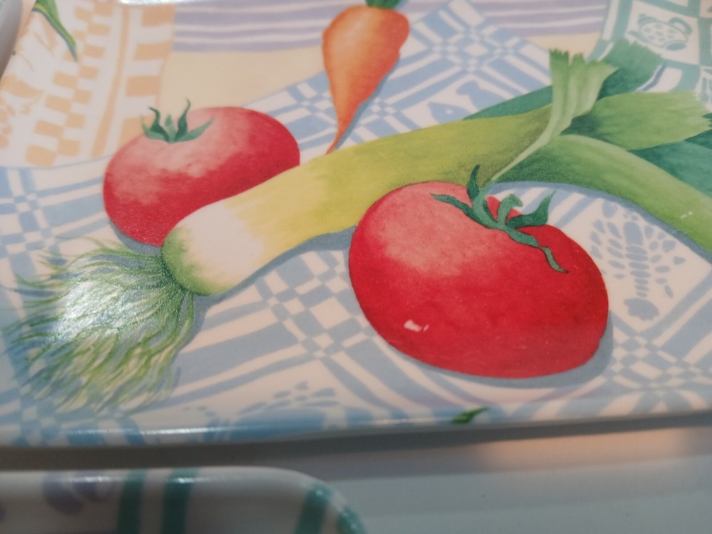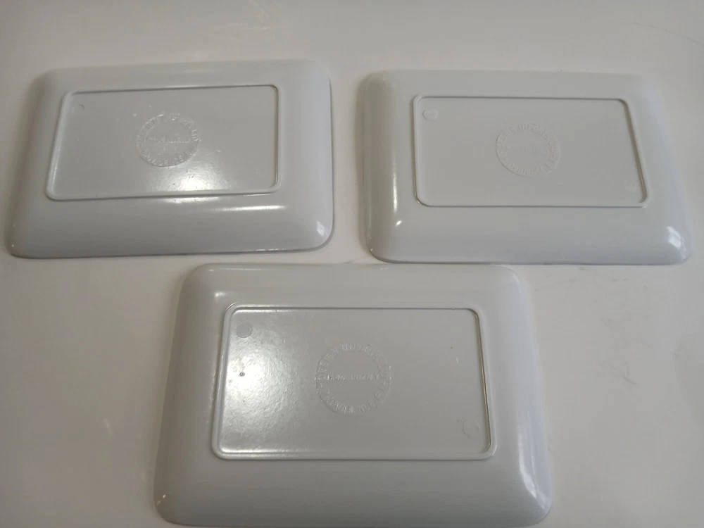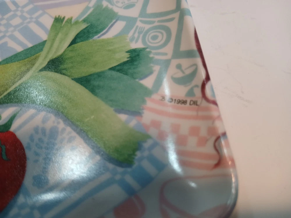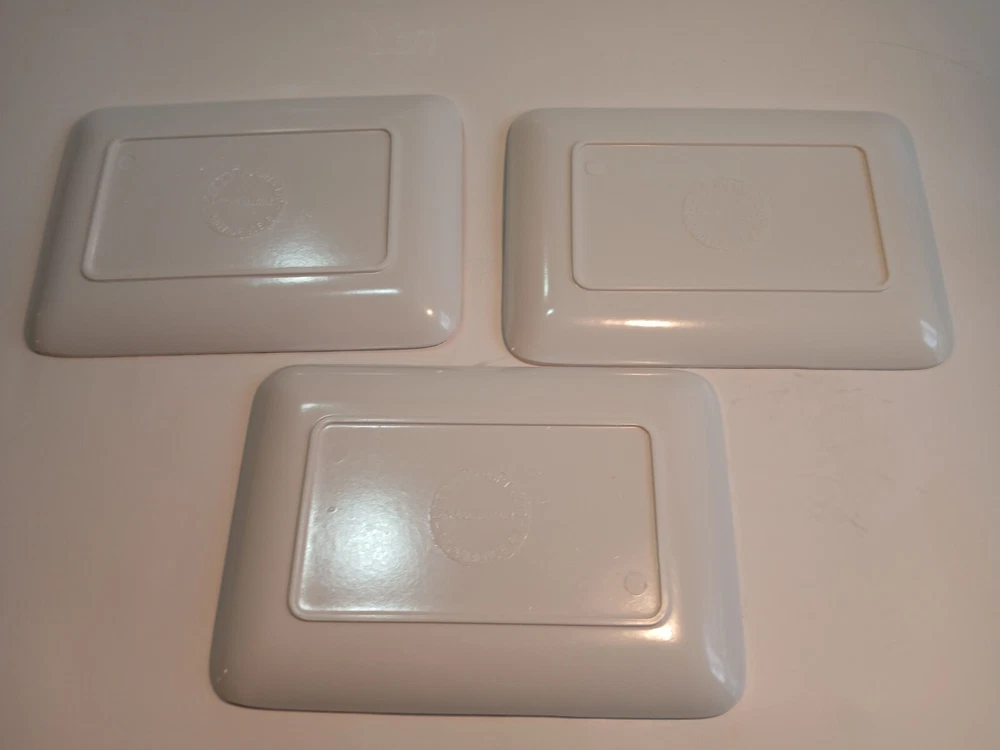 Set of 3 6 x 4 ( approximately) Plastic trays with a veggie Motif. Design Imports Providence Rhode Island, Made in Italy 1998. These are in decent Used condition & are really cute! Some slight wear from age. Please see photos for details. Sold as is & no returns.
