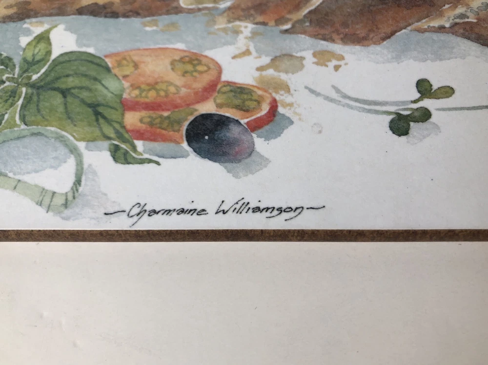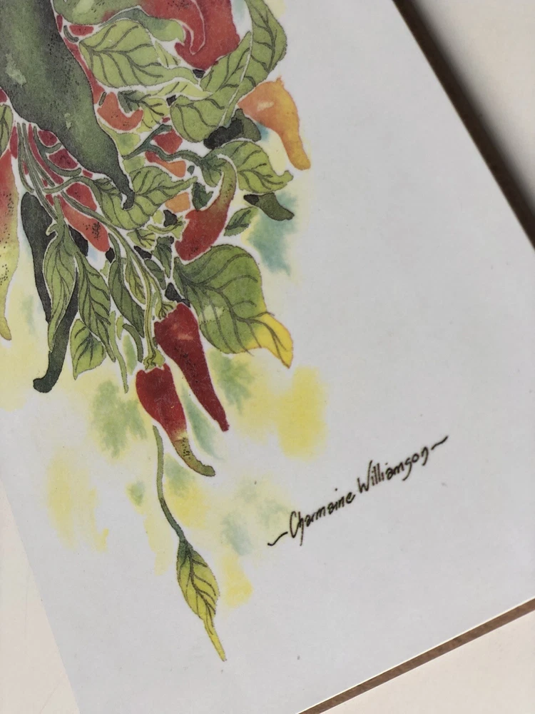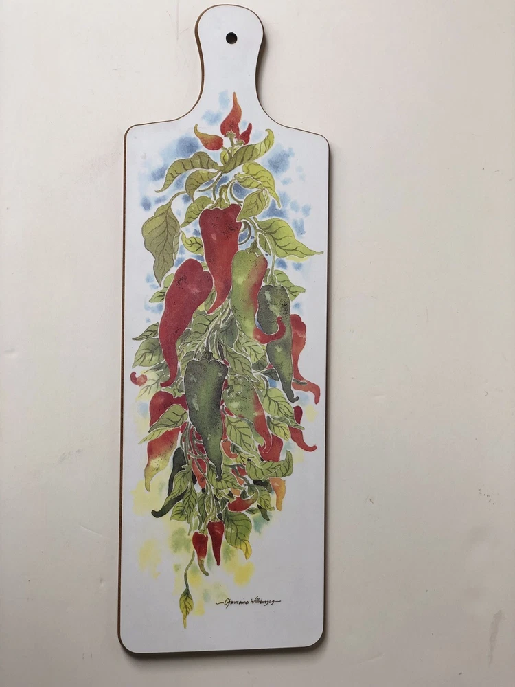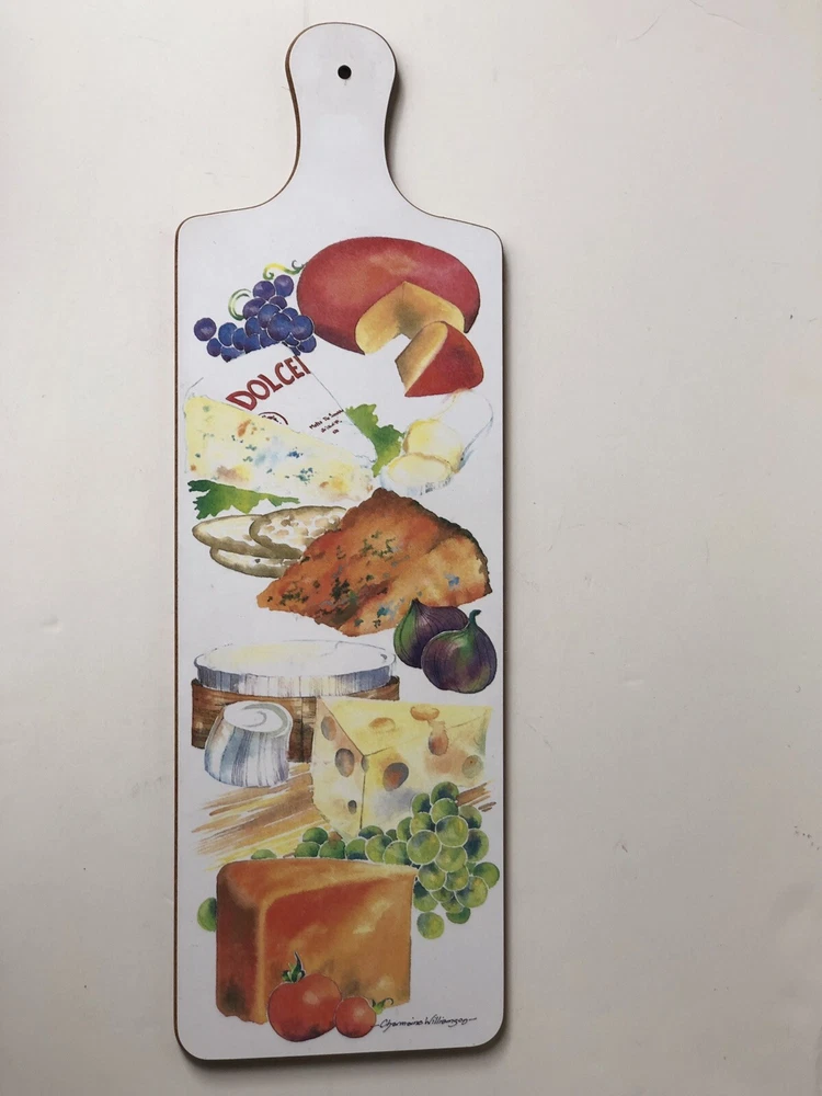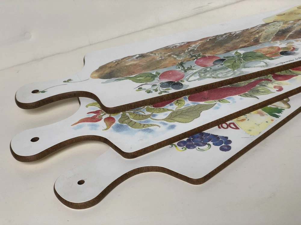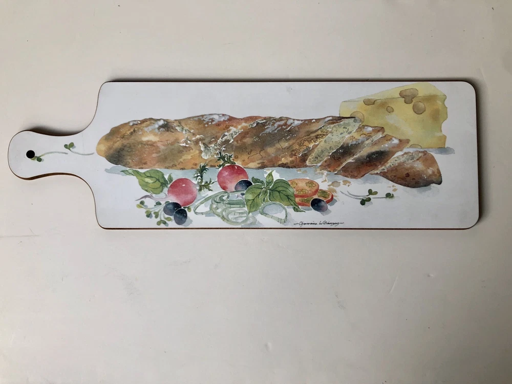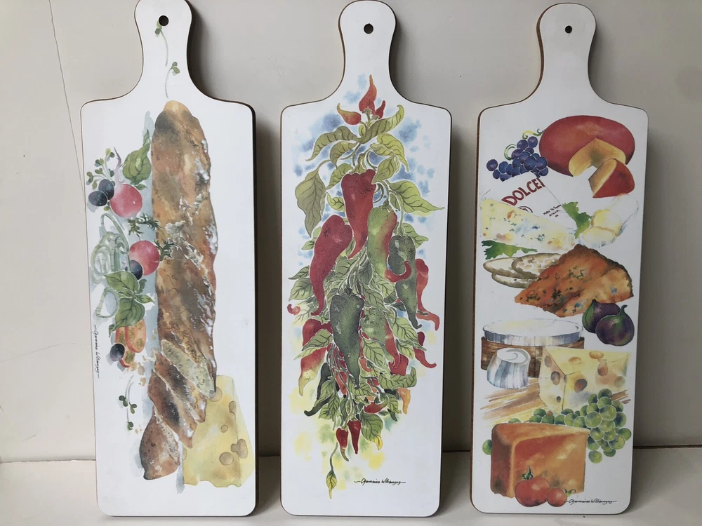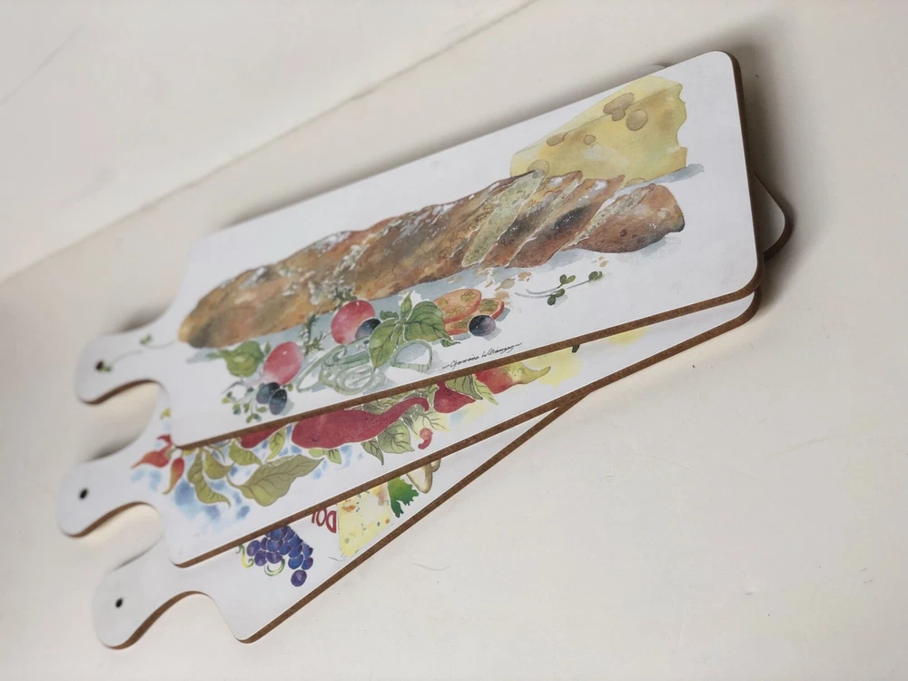 Set Of 3 laminated melamine Cutting Boards, Made in Great Britain. Never used, still have original stickers on. Each features beautiful artwork by Charmaine Williamson - bread and cheese, peppers and cheese assortment. Great gift, fits any kitchen, especially cottage style. each board measures 17”x5.5” Thank you for your interest! Please view my other listings!