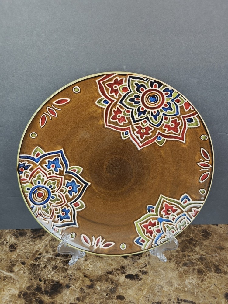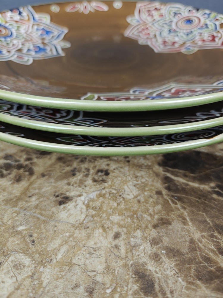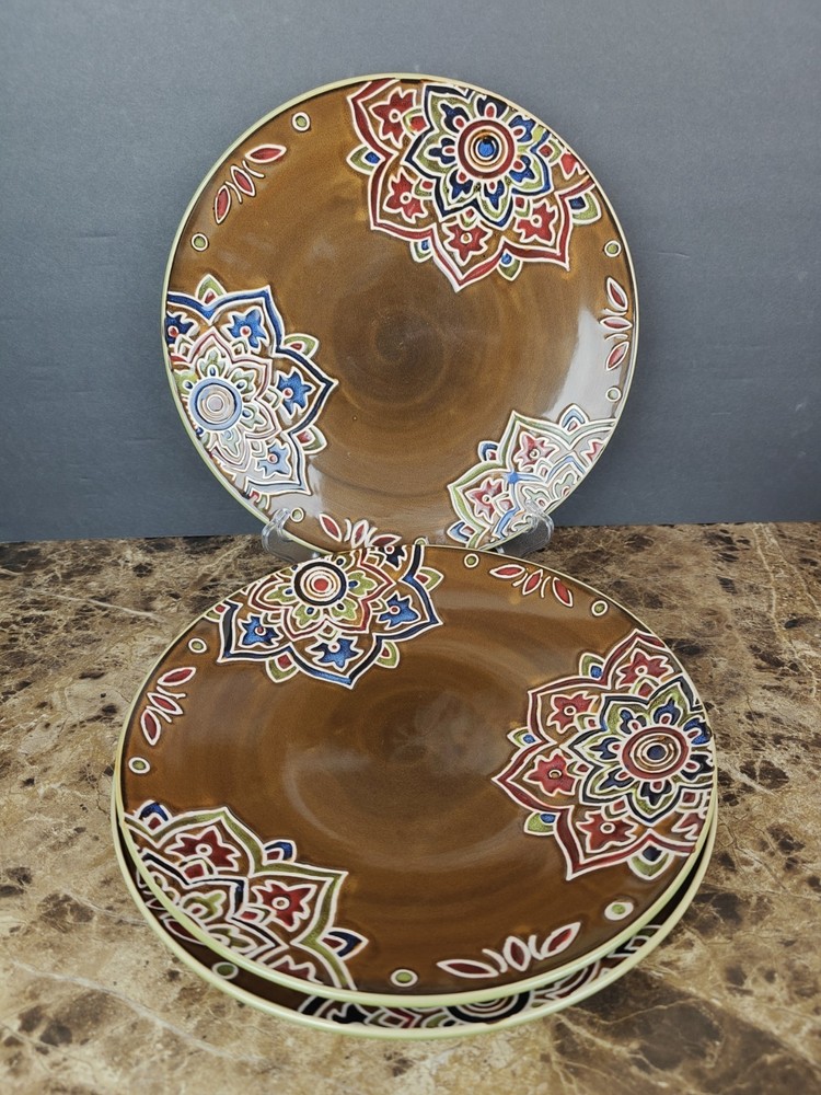 Set Of 3 Global Medallion Pier 1 Imports Dinner Plates 11" Brown Floral. Utensil marks present. No chips or cracks....