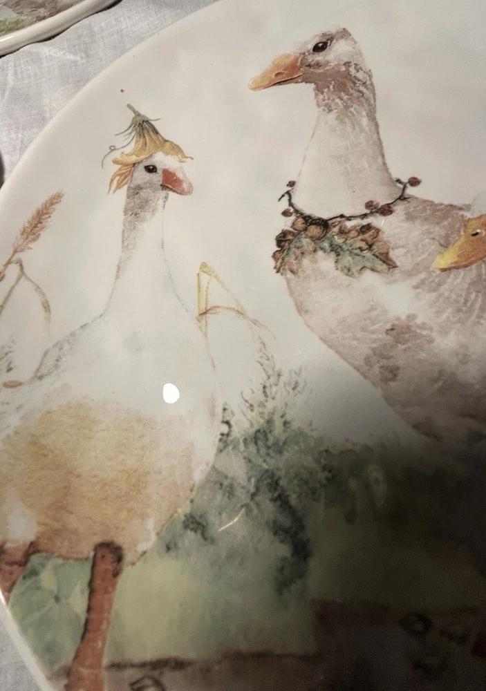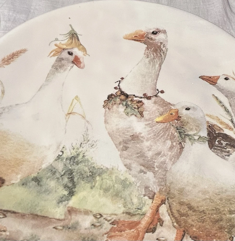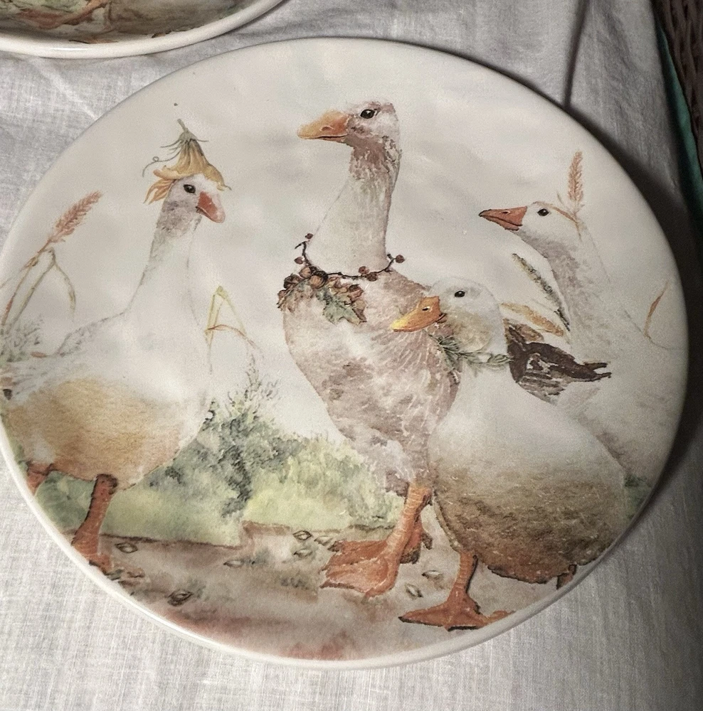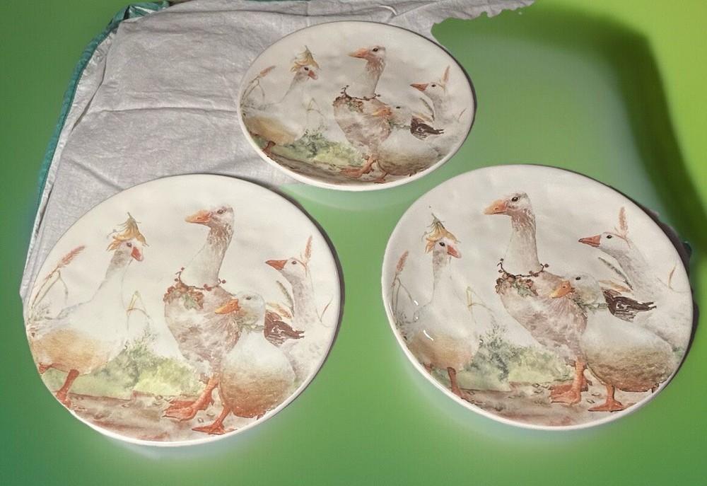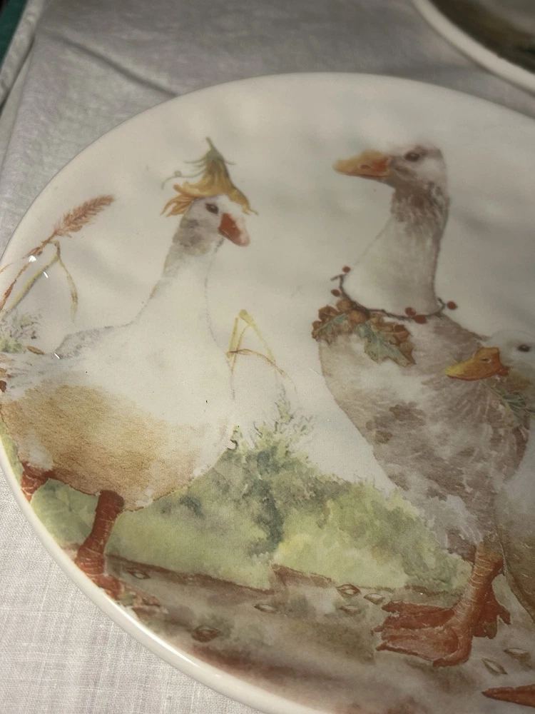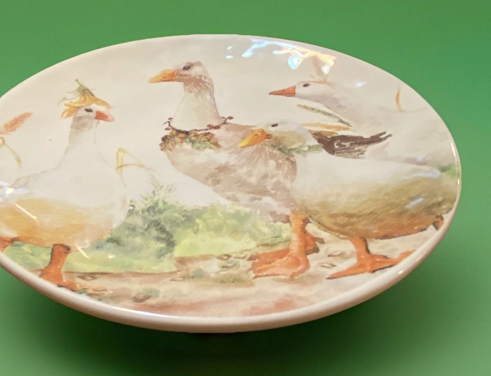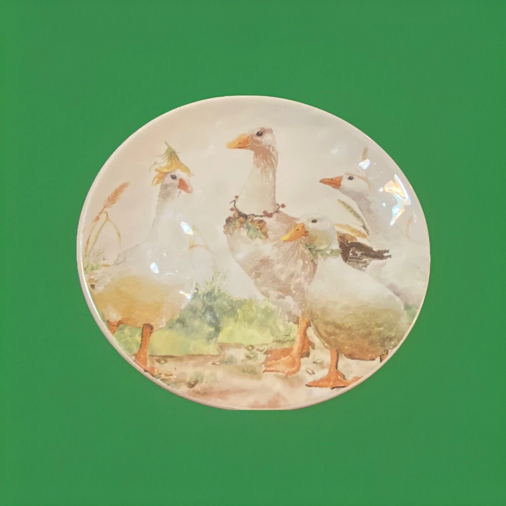 This set of three Pier 1 Imports Dolomite Autumn Geese/Ducks dessert plates is a perfect addition to any collection. The plates feature a beautiful multicolor pattern of autumn geese and ducks, making them an ideal choice for any occasion. The plates are made of high-quality dolomite material, ensuring they are durable and long-lasting. The set includes three plates, perfect for serving desserts or light snacks. These plates are perfect for anyone who loves unique and beautiful designs. They are perfect for collectors, and with their autumn theme, they make a great gift for a loved one. Add this set of plates to your collection today!