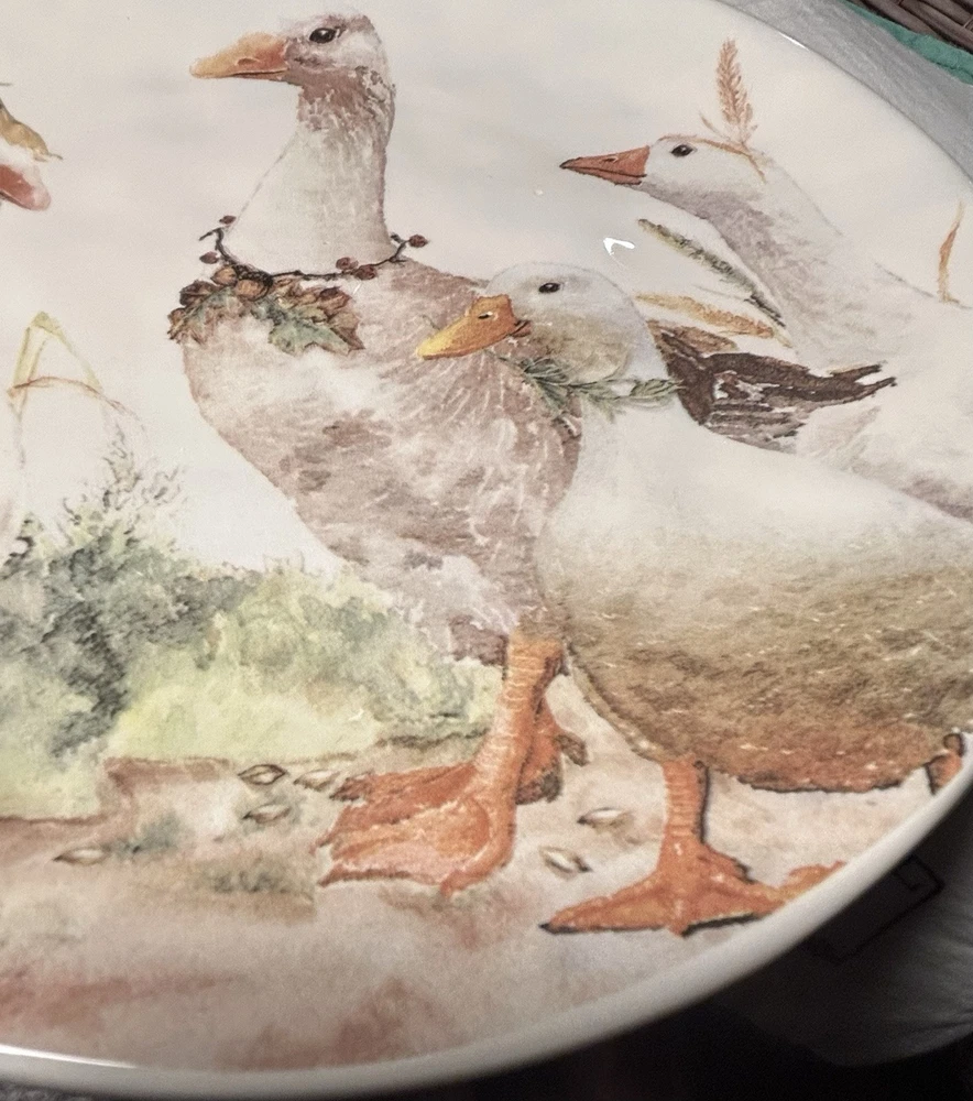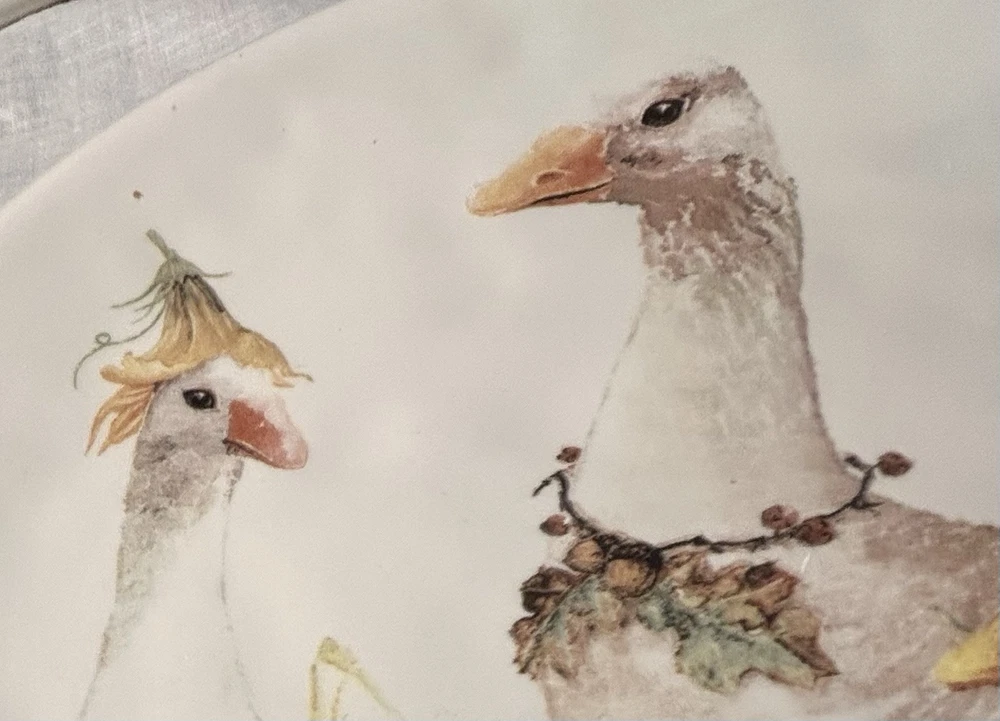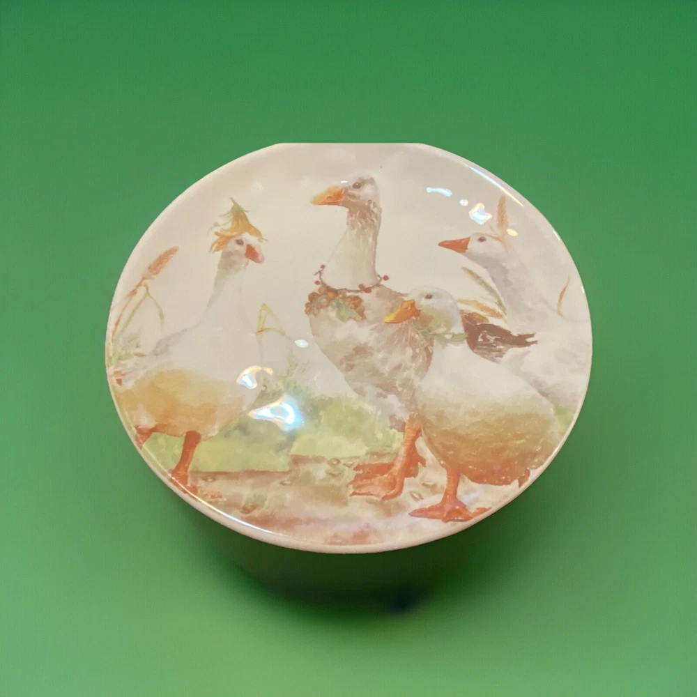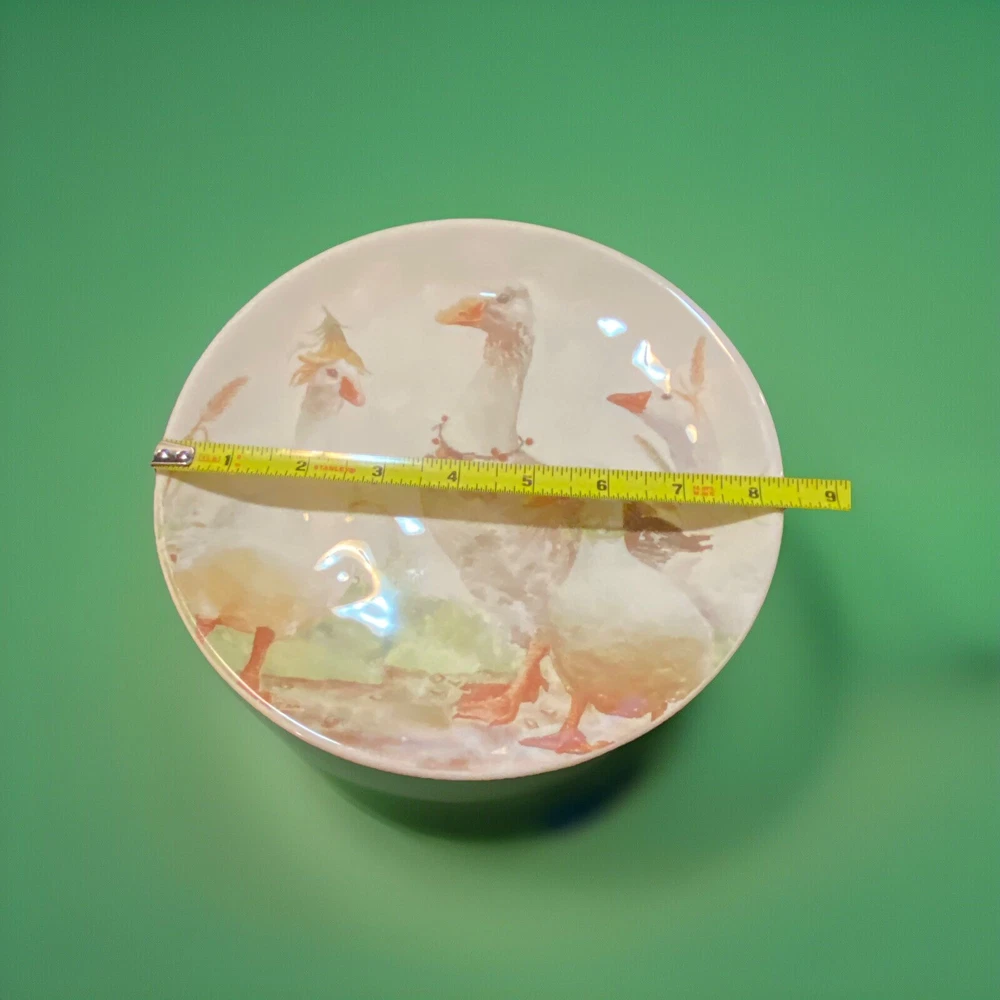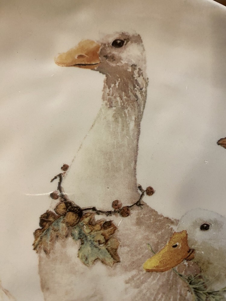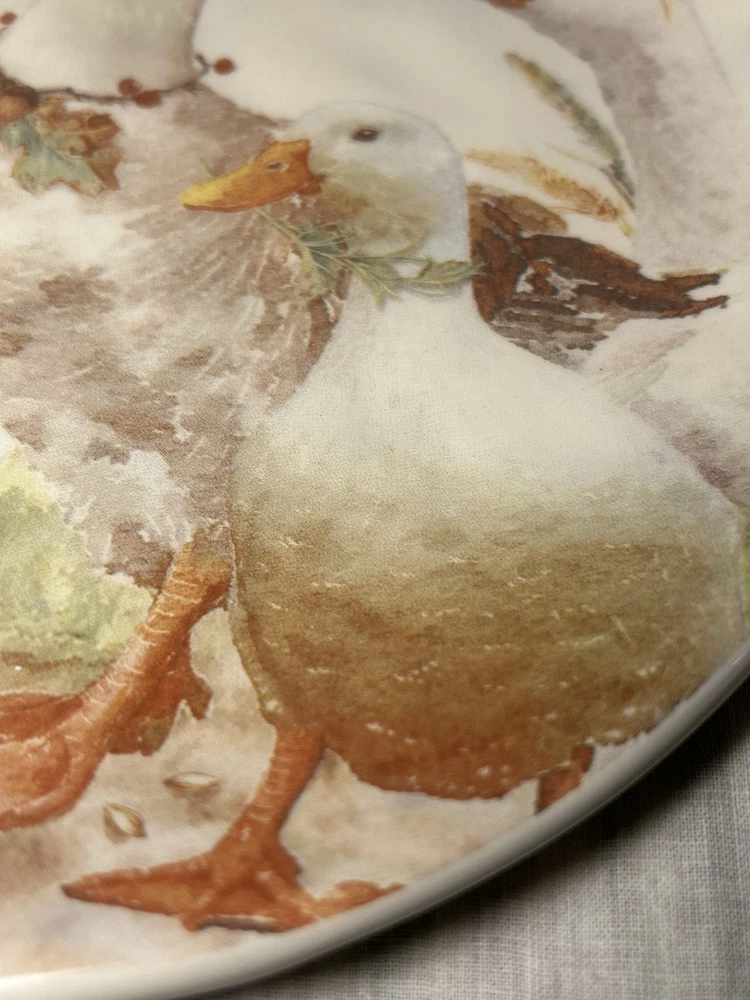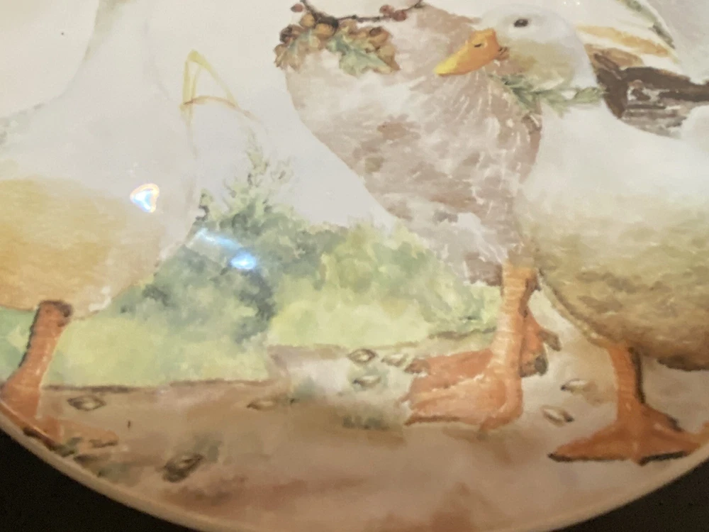 This set of three Pier 1 Imports Dolomite Autumn Geese/Ducks dessert plates is a perfect addition to any collection. The plates feature a beautiful multicolor pattern of autumn geese and ducks, making them an ideal choice for any occasion. The plates are made of high-quality dolomite material, ensuring they are durable and long-lasting. The set includes three plates, perfect for serving desserts or light snacks. These plates are perfect for anyone who loves unique and beautiful designs. They are perfect for collectors, and with their autumn theme, they make a great gift for a loved one. Add this set of plates to your collection today!