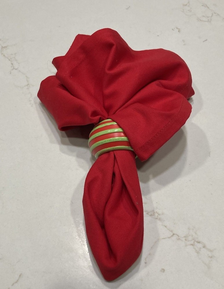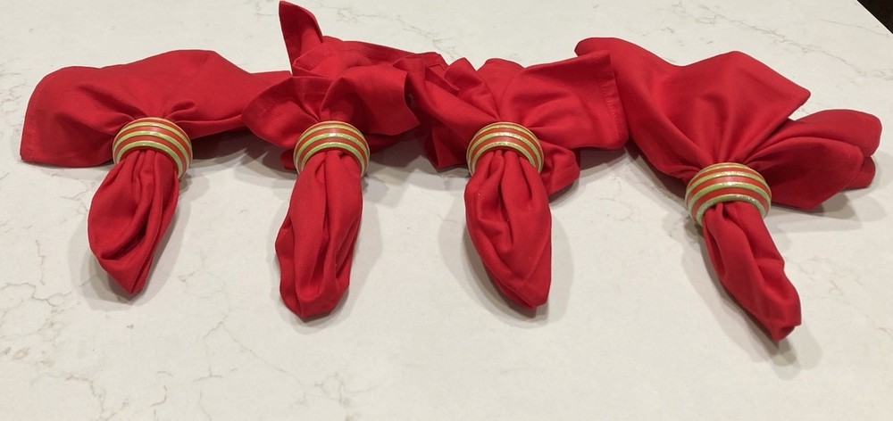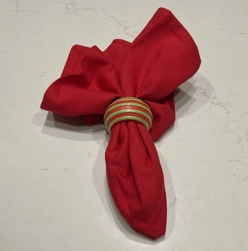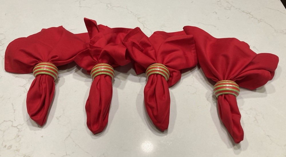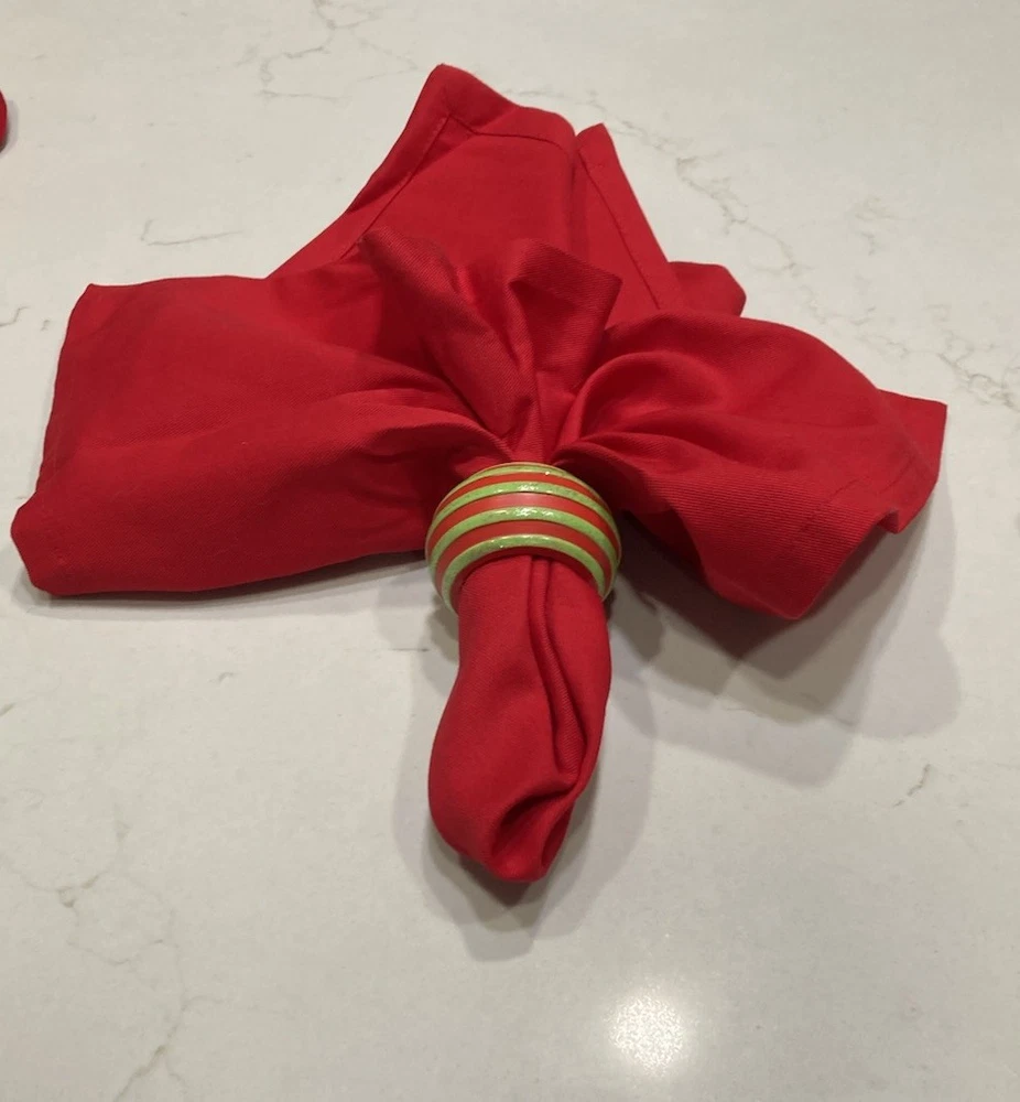 Elevate your dining experience with this set of four red Pier 1 napkins, each complemented by a coordinating red and green wooden ring adorned with subtle glitter. These classic, square-shaped napkins are made from 100% cotton, and measure 20” x 20”.