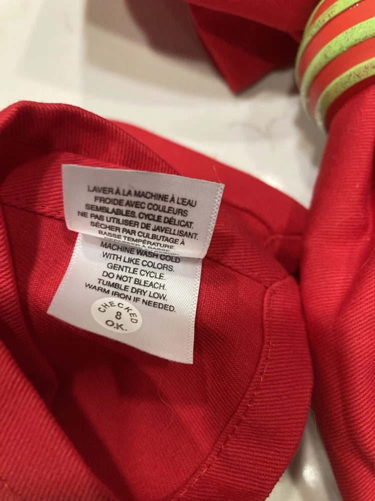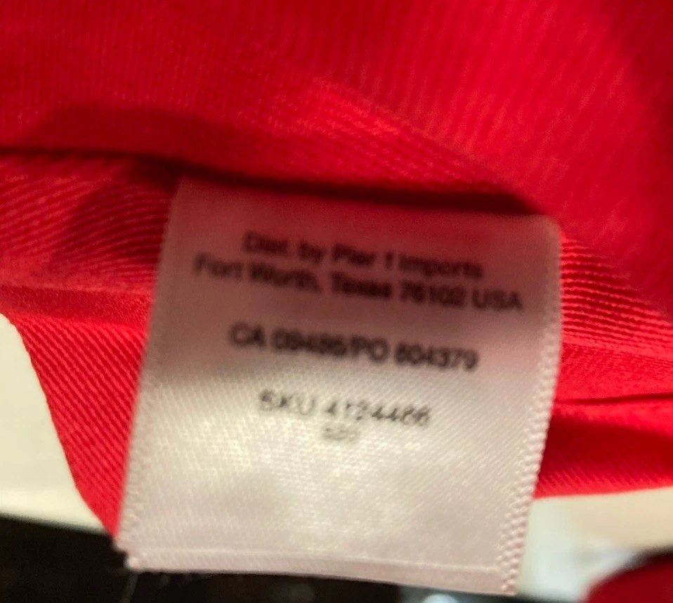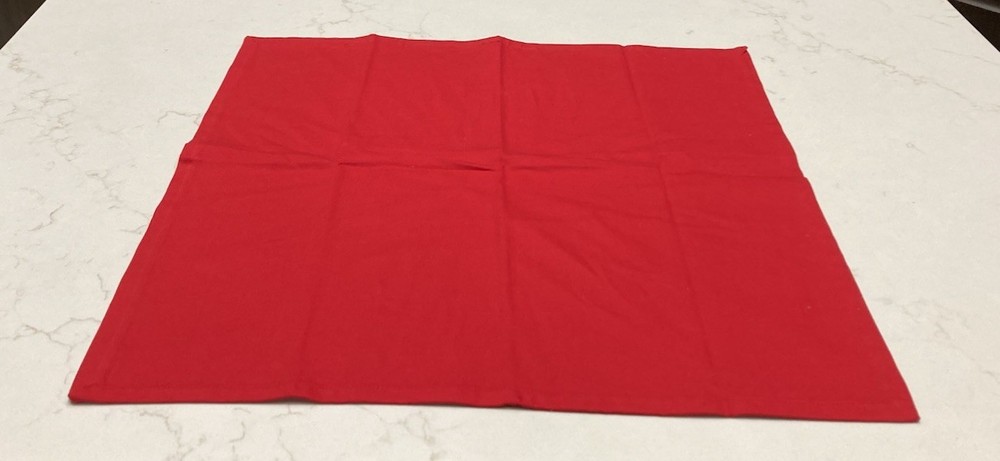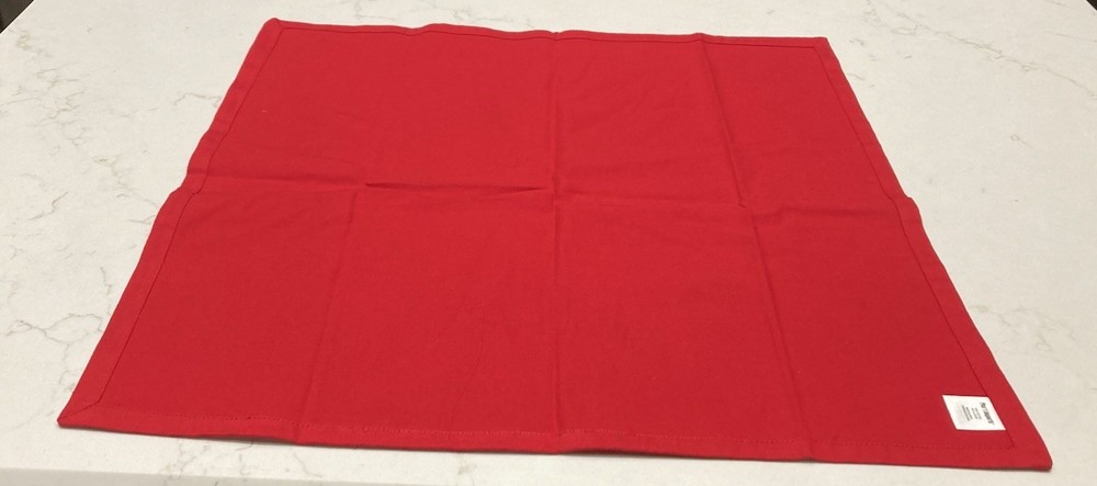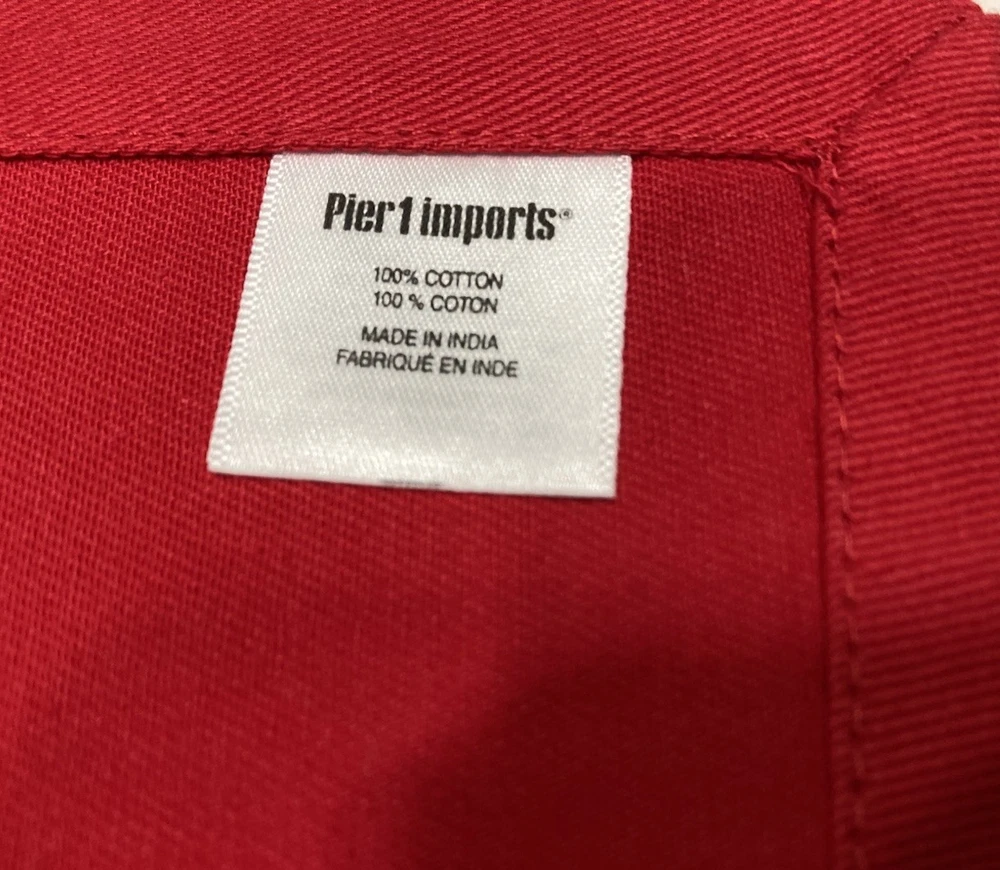 Elevate your dining experience with this set of four red Pier 1 napkins, each complemented by a coordinating red and green wooden ring adorned with subtle glitter. These classic, square-shaped napkins are made from 100% cotton, and measure 20” x 20”.