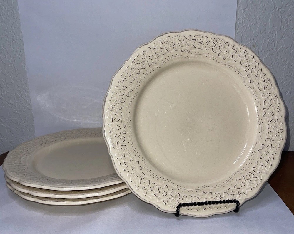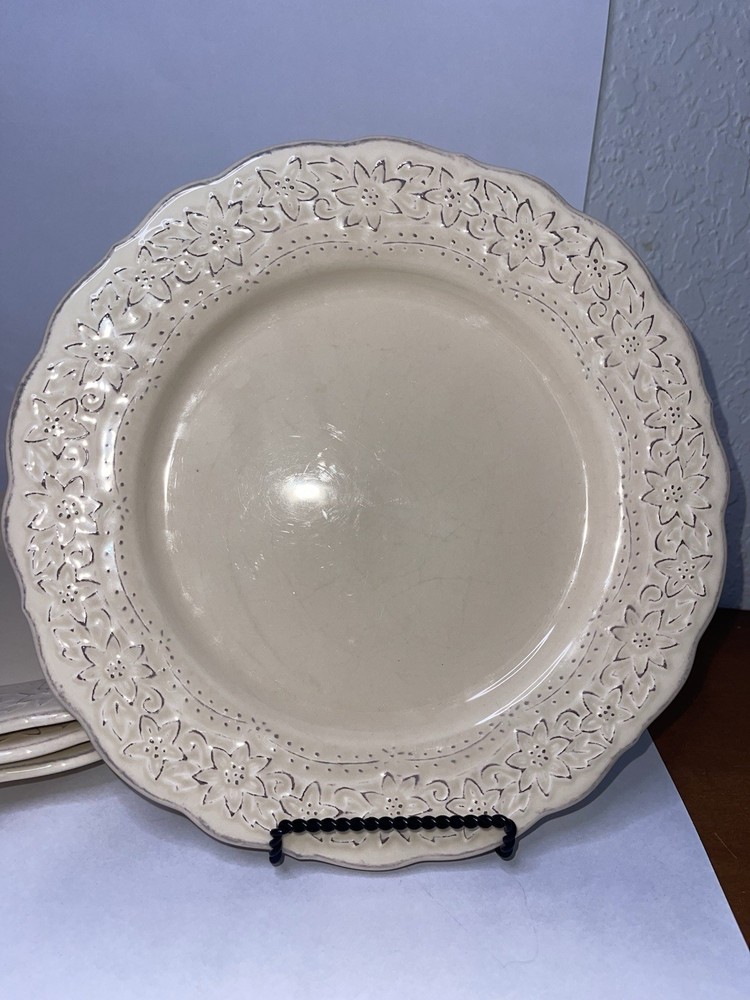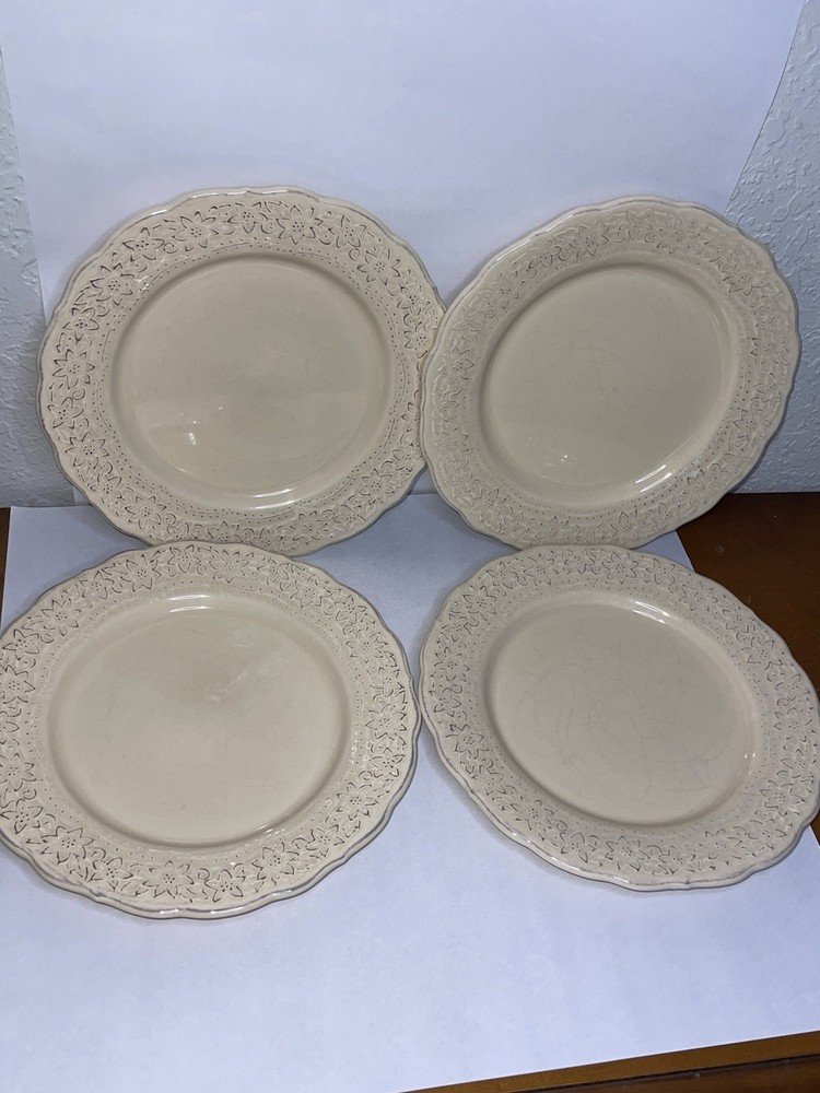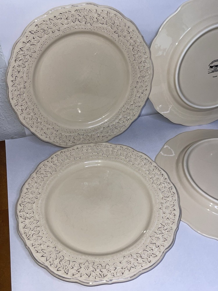 Set Of 4 Pier 1 Imports Lacey Dinner Plates Cream Hand Painted Earthenware This is a set of 4 Set Of 4 Pier 1 Imports Lacey Dinner Plates. Each plate is about 10.5” in diameter. All were made in Portugal and are in the Lacey style. All the plates have a cool embossed floral design around the rim and are in a cream/beige color. All are dishwasher and microwave safe. One has a small chip on the bottom rim (see last picture). There is also cracking on the middle of all the plates (not sure if it’s intentional). Please look at all pictures for condition and stamp. If you have any questions please message me and I’d be happy to help! Thanks!