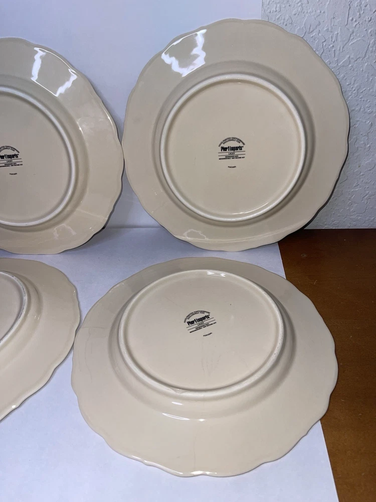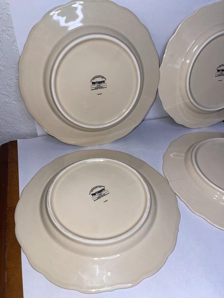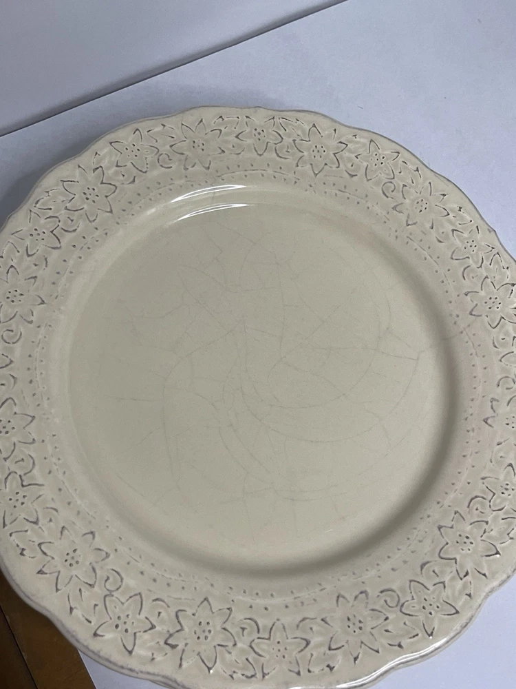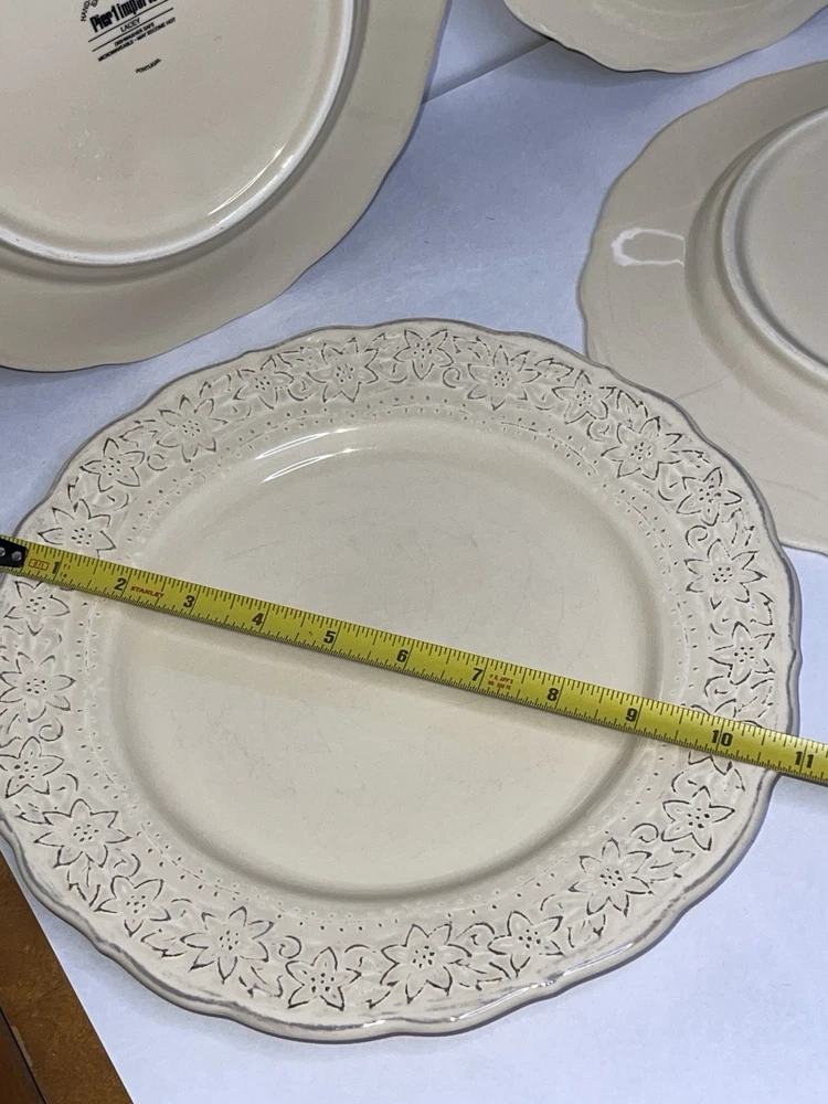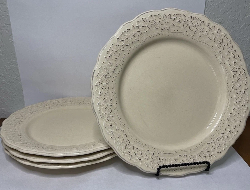 Set Of 4 Pier 1 Imports Lacey Dinner Plates Cream Hand Painted Earthenware This is a set of 4 Set Of 4 Pier 1 Imports Lacey Dinner Plates. Each plate is about 10.5” in diameter. All were made in Portugal and are in the Lacey style. All the plates have a cool embossed floral design around the rim and are in a cream/beige color. All are dishwasher and microwave safe. One has a small chip on the bottom rim (see last picture). There is also cracking on the middle of all the plates (not sure if it’s intentional). Please look at all pictures for condition and stamp. If you have any questions please message me and I’d be happy to help! Thanks!