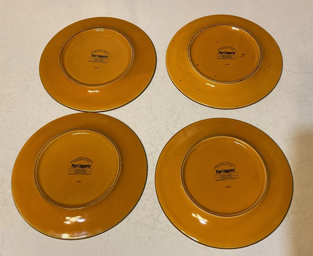 Set of 4 Pier 1 Imports Sunflower Salad Plates feature a hand-painted design on terracotta. Each plate has a diameter of 8.25” and is microwave and dishwasher safe. The plates are round in shape with a glossy finish, perfect for all occasions. Made in China, these contemporary style plates showcase a vibrant multicolor sunflower pattern, adding a cheerful touch to your table setting. No chips or cracks. Shipped with USPS Ground Advantage. International shipping through eBay’s global shipping service only. Thanks for looking.