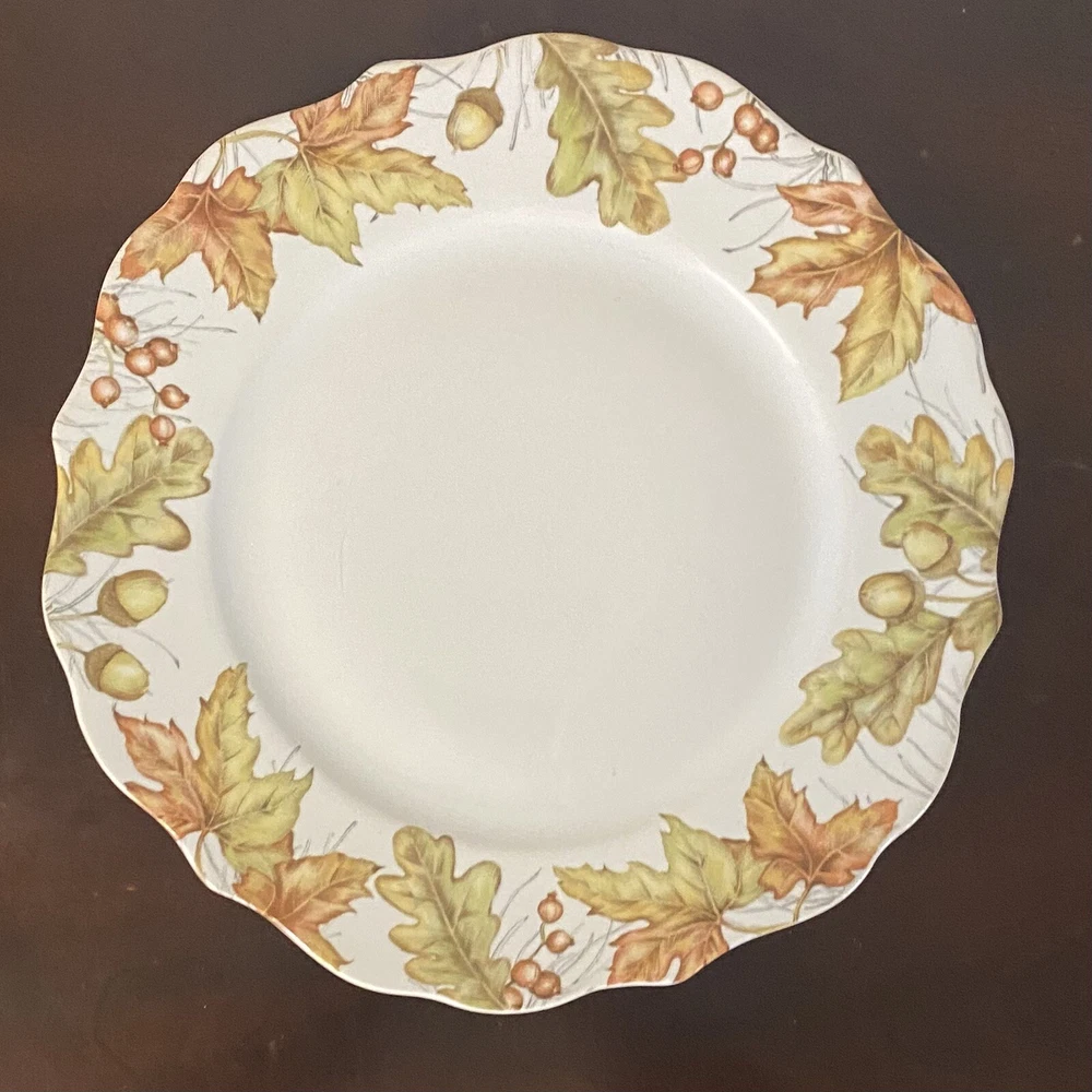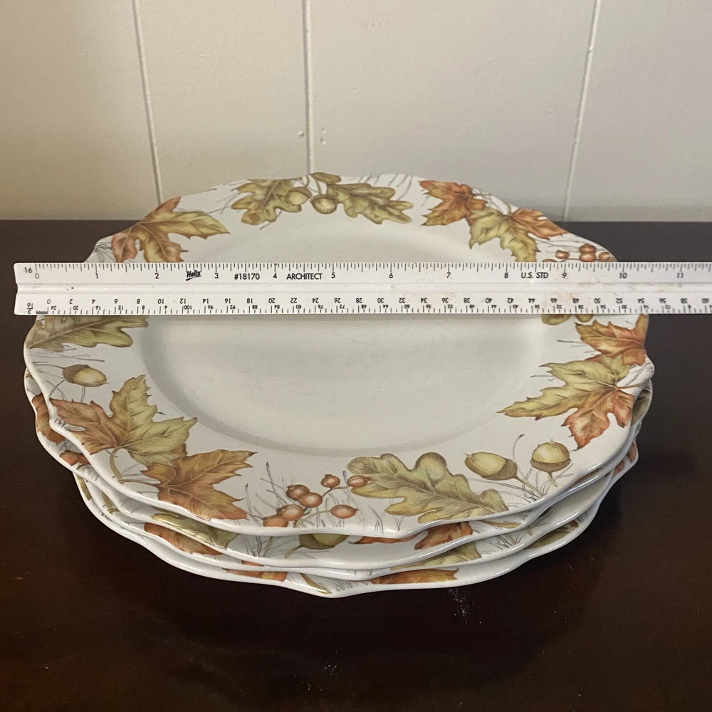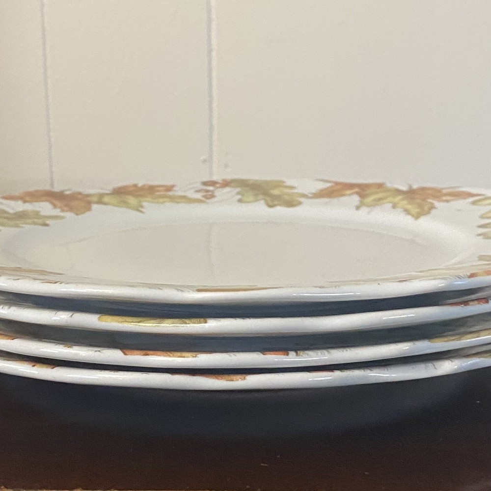Set Of 4 Pier 1 Mazey the Squirrel Collection “LEAVES” 10.5” Dinner Plates. There are no chips or cracks. There are some utensil marks.