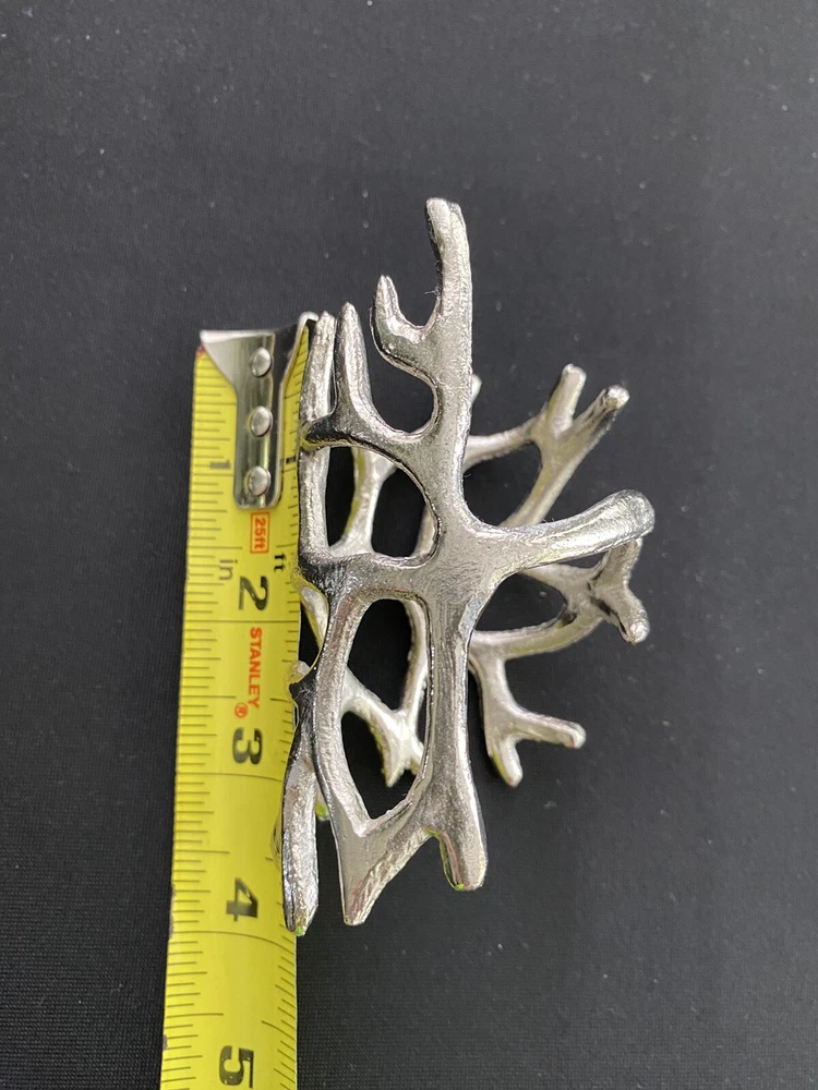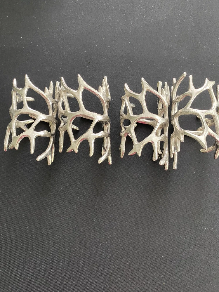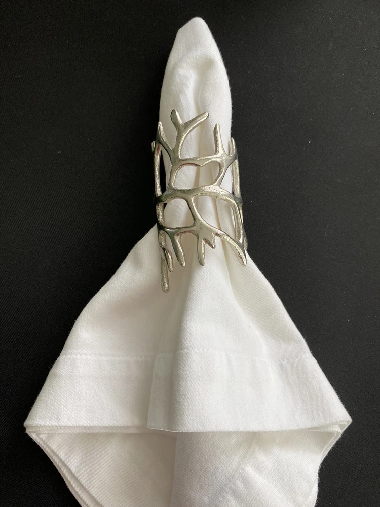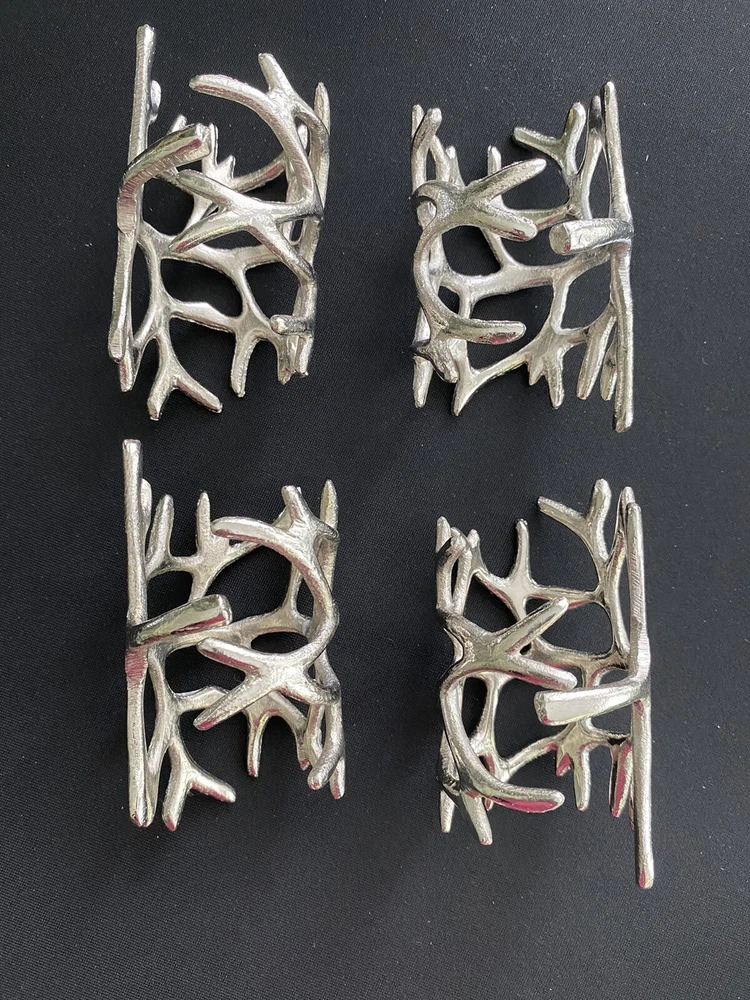Enhance the elegance of your dining room with this set of 4 metal napkin rings from Pier 1. The intricate designs of antler, twig, or coral in silver-toned color add a touch of nature-inspired beauty to any occasion. Hand wash only and made in India, these napkin rings come in a set of 4 and are perfect for formal dinners or casual gatherings. The abstract pattern and designer theme of these napkin rings make them a perfect addition to your linens and textiles collection. They do not contain any California Prop 65 Warning and cannot be personalized. Add a touch of sophistication to your table setting with this set of napkin rings approximately 3.5" long. Napkins not included.