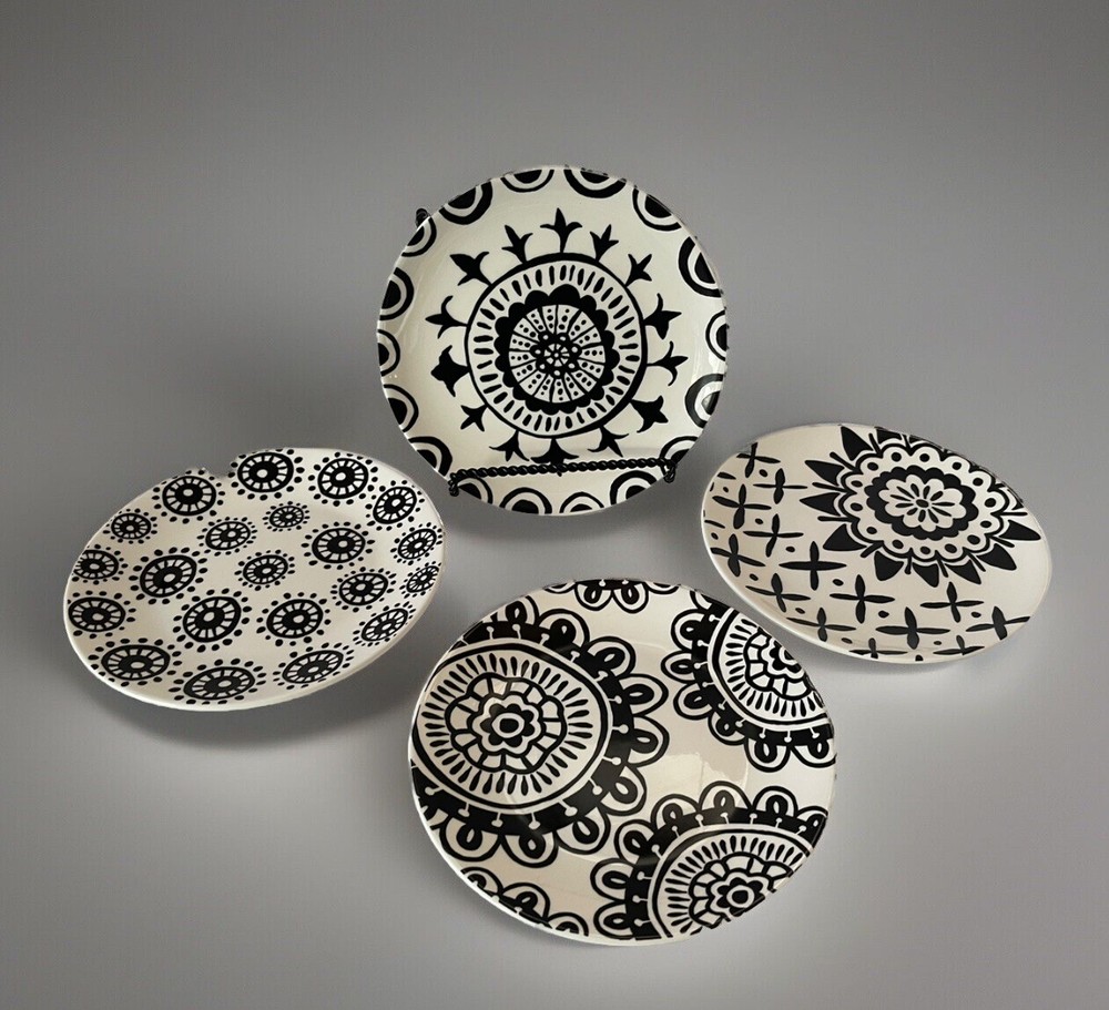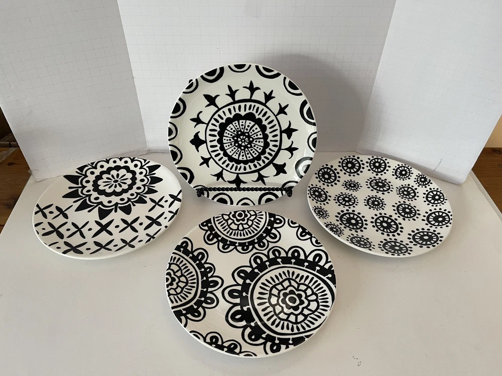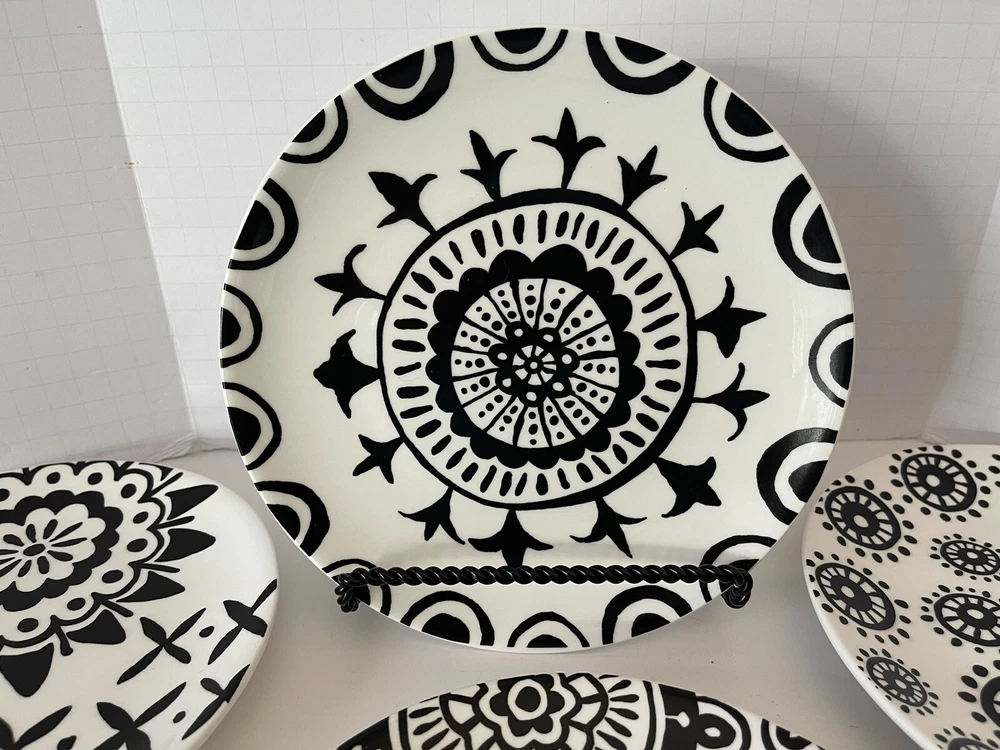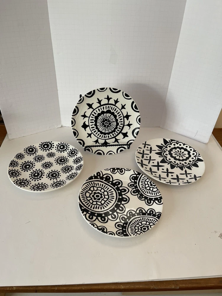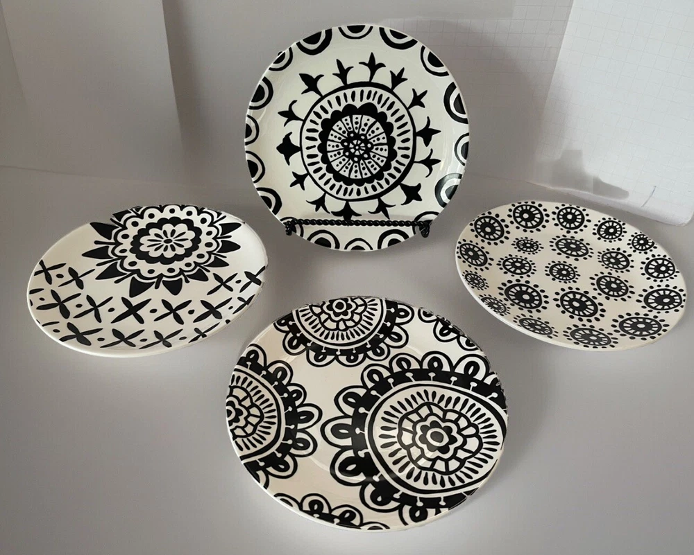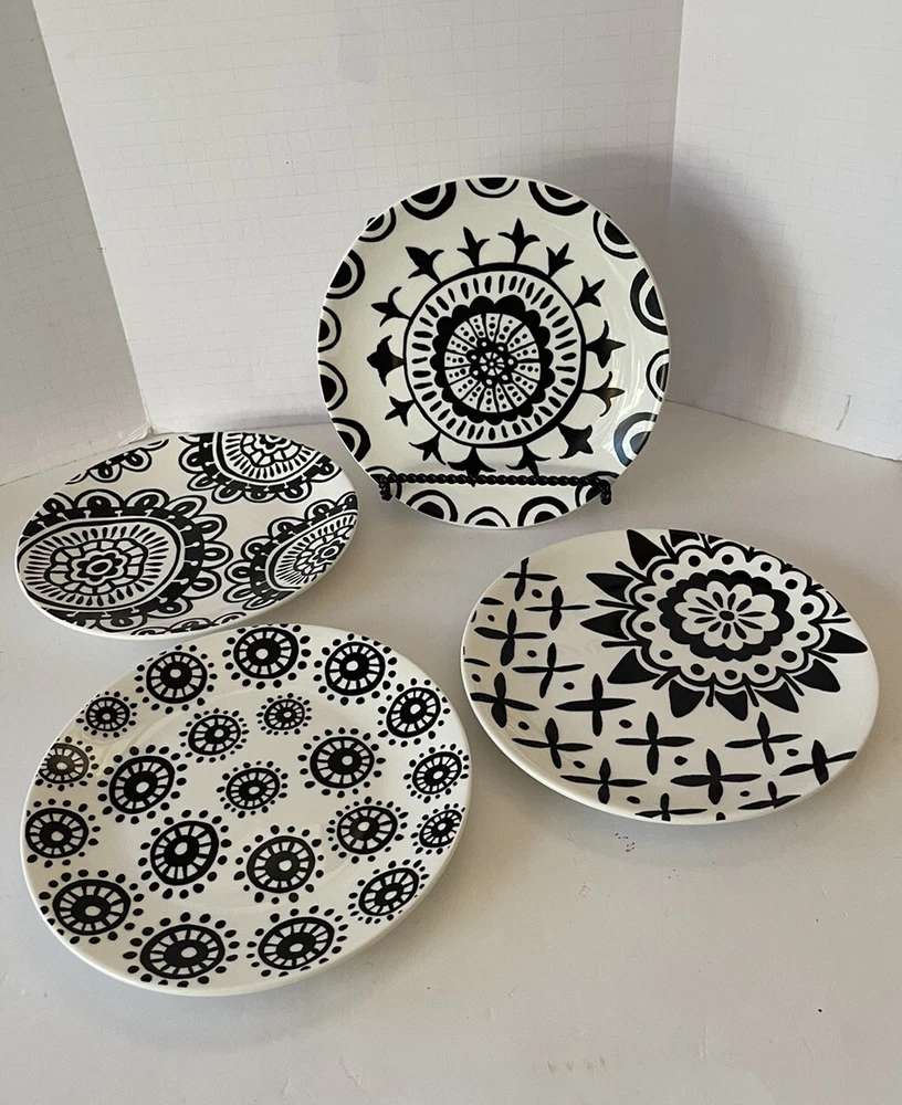 A set of four Pier 1 Imports stoneware salad, or dessert plates. This particular style and design is very difficult to find since it is now discontinued and the style and design was made exclusively for Pier 1. Each plate coordinates with the other plates, but are not the exact same pattern, but are complementary and incredibly attractive. Each plate has a white background with black designs that are both geometric, floral, etc. This is definitely a contemporary/modern design that would be attractive on any table. 8 inch plates with a height of 0.75 inches. The plates look great, and if they have been used, it is extremely hard to tell. When boxed and packaged the plates will weigh 5 pounds and will ship in the 13 x 10 x 7” cardboard box