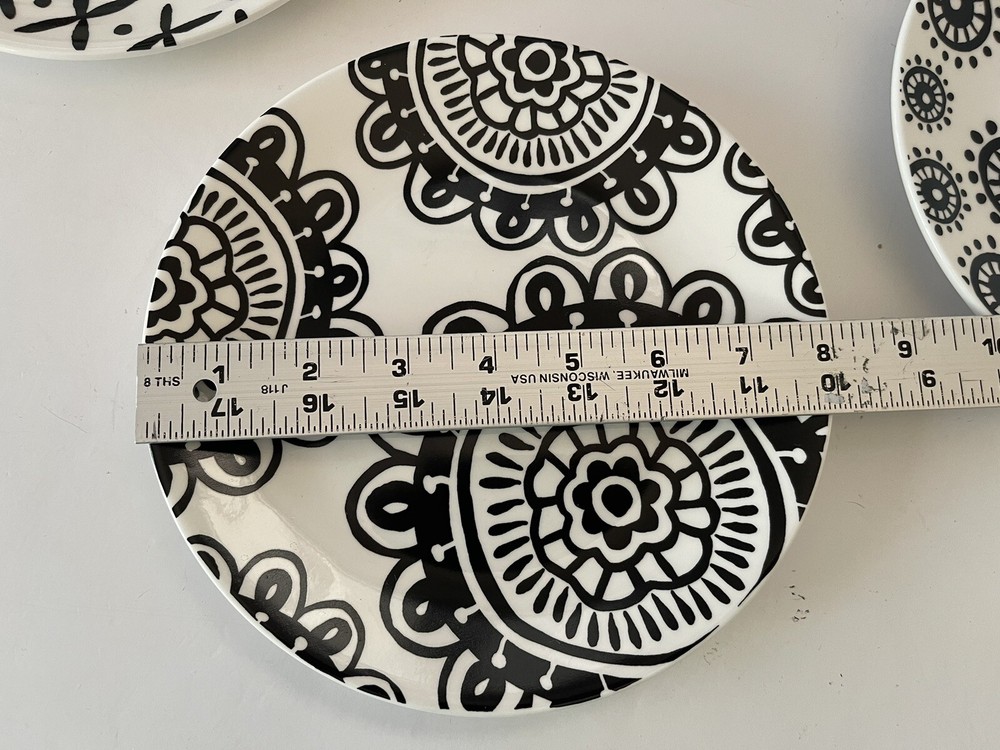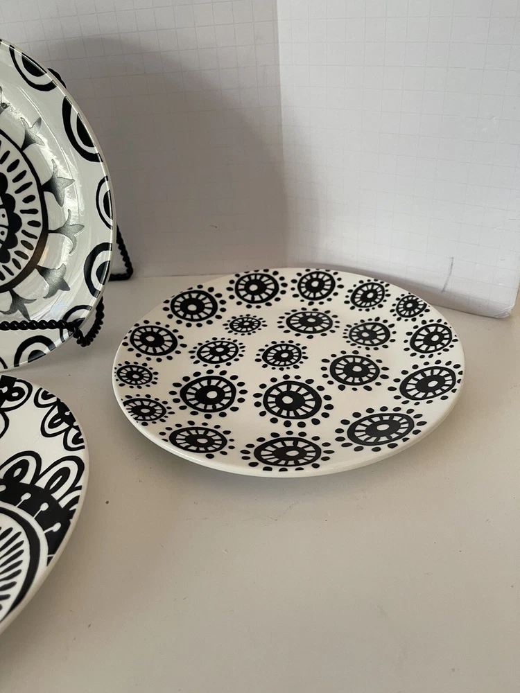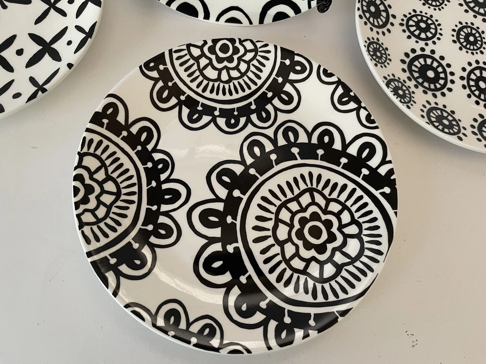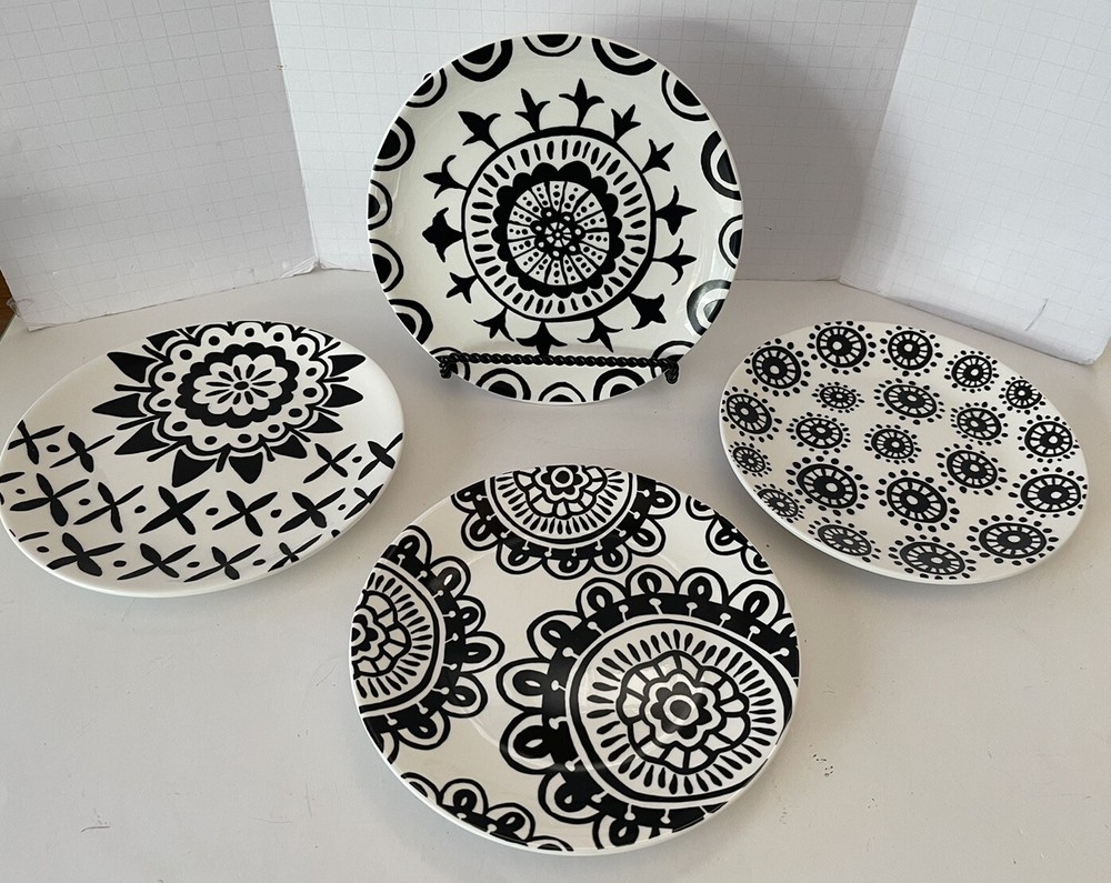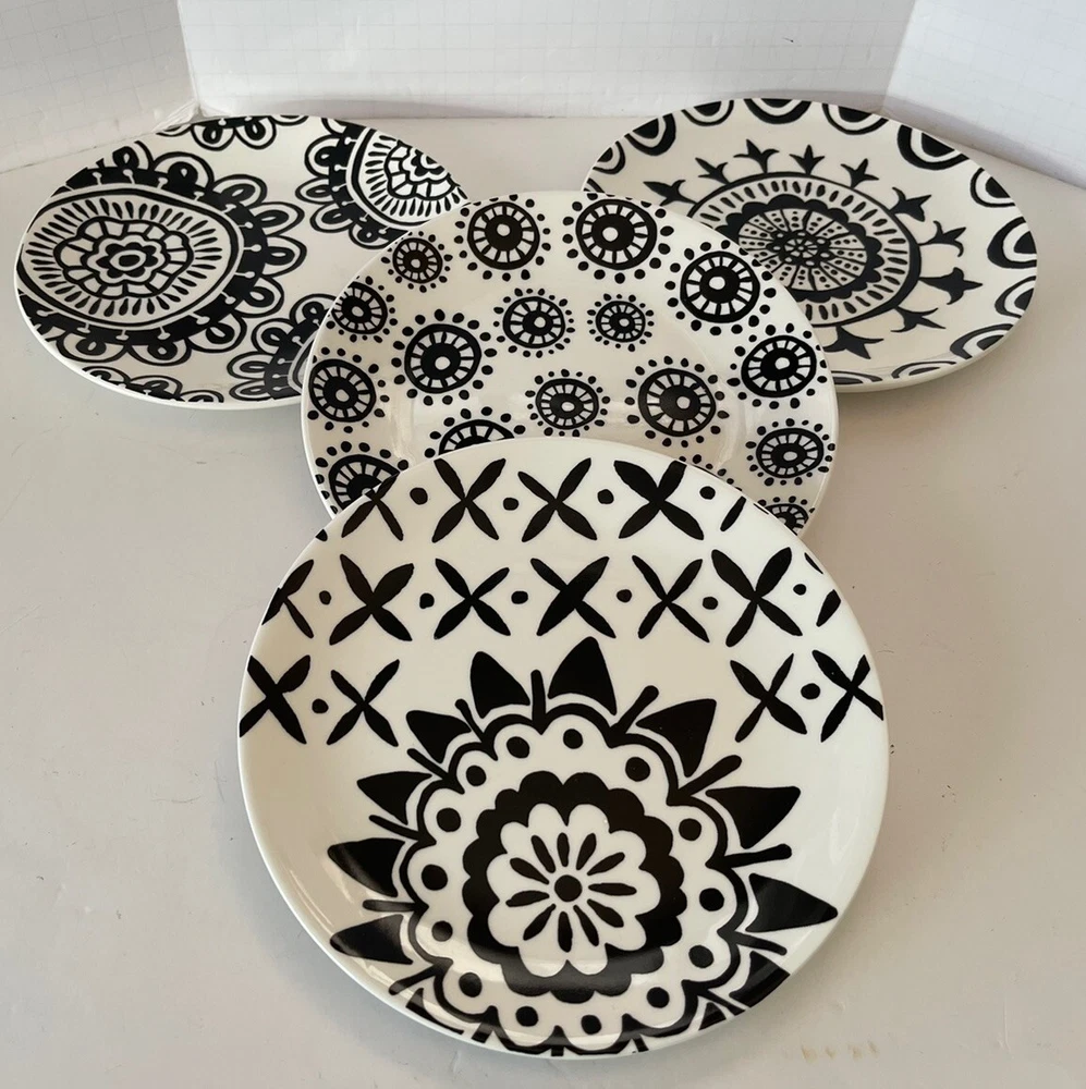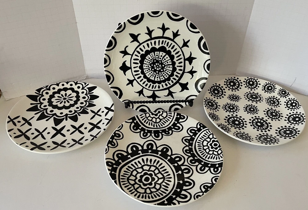 A set of four Pier 1 Imports stoneware salad, or dessert plates. This particular style and design is very difficult to find since it is now discontinued and the style and design was made exclusively for Pier 1. Each plate coordinates with the other plates, but are not the exact same pattern, but are complementary and incredibly attractive. Each plate has a white background with black designs that are both geometric, floral, etc. This is definitely a contemporary/modern design that would be attractive on any table. 8 inch plates with a height of 0.75 inches. The plates look great, and if they have been used, it is extremely hard to tell. When boxed and packaged the plates will weigh 5 pounds and will ship in the 13 x 10 x 7” cardboard box