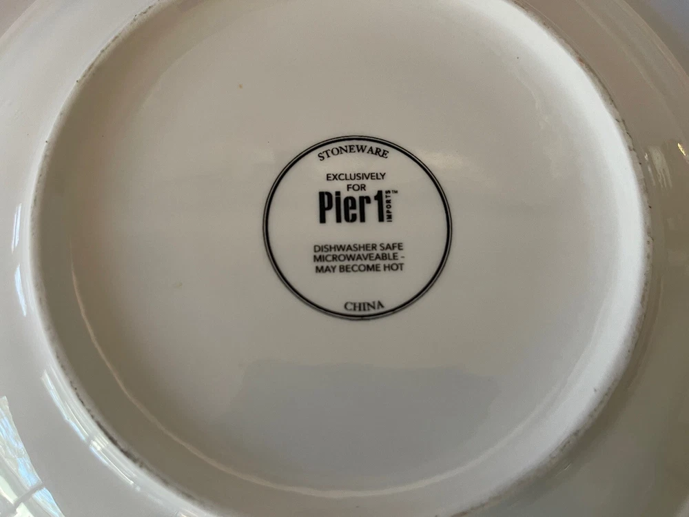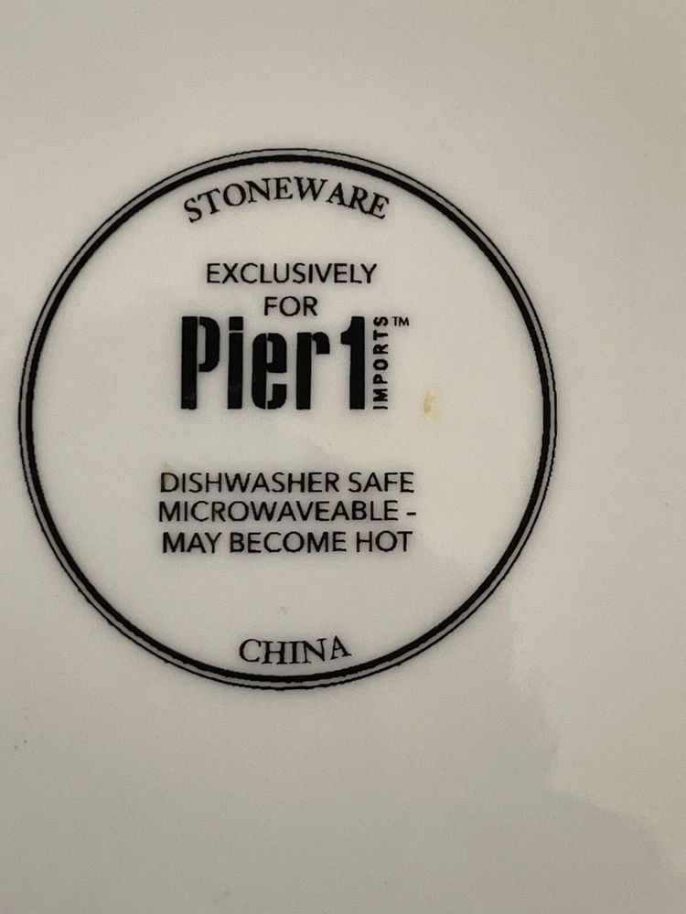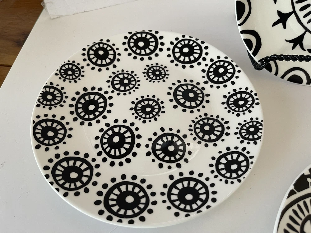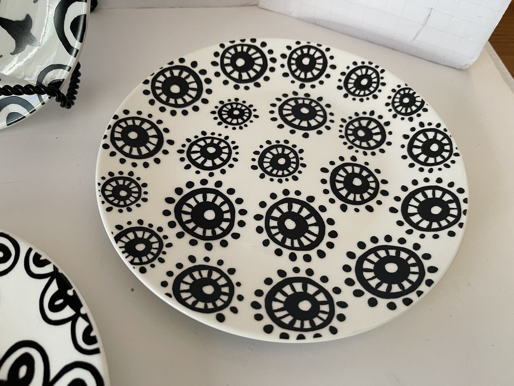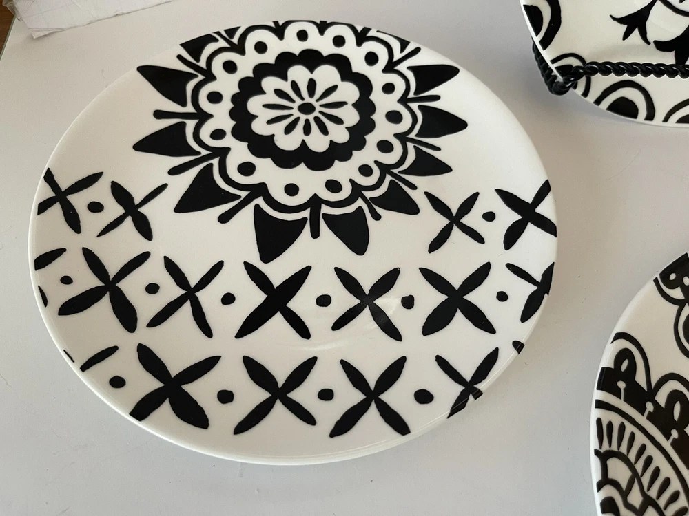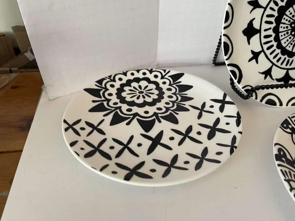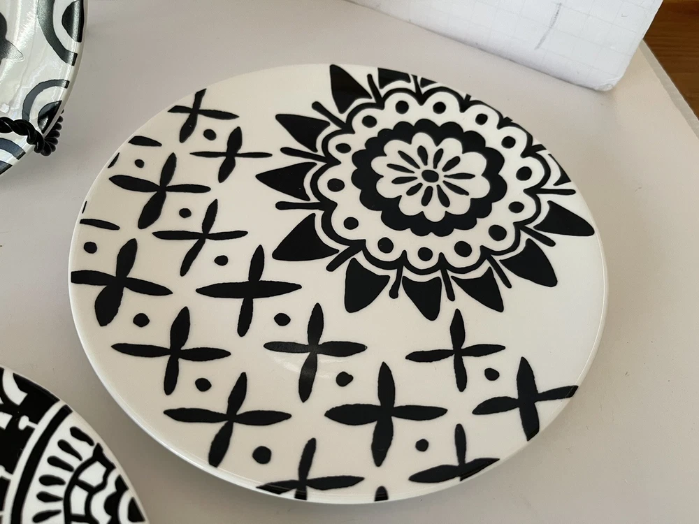 A set of four Pier 1 Imports stoneware salad, or dessert plates. This particular style and design is very difficult to find since it is now discontinued and the style and design was made exclusively for Pier 1. Each plate coordinates with the other plates, but are not the exact same pattern, but are complementary and incredibly attractive. Each plate has a white background with black designs that are both geometric, floral, etc. This is definitely a contemporary/modern design that would be attractive on any table. 8 inch plates with a height of 0.75 inches. The plates look great, and if they have been used, it is extremely hard to tell. When boxed and packaged the plates will weigh 5 pounds and will ship in the 13 x 10 x 7” cardboard box
