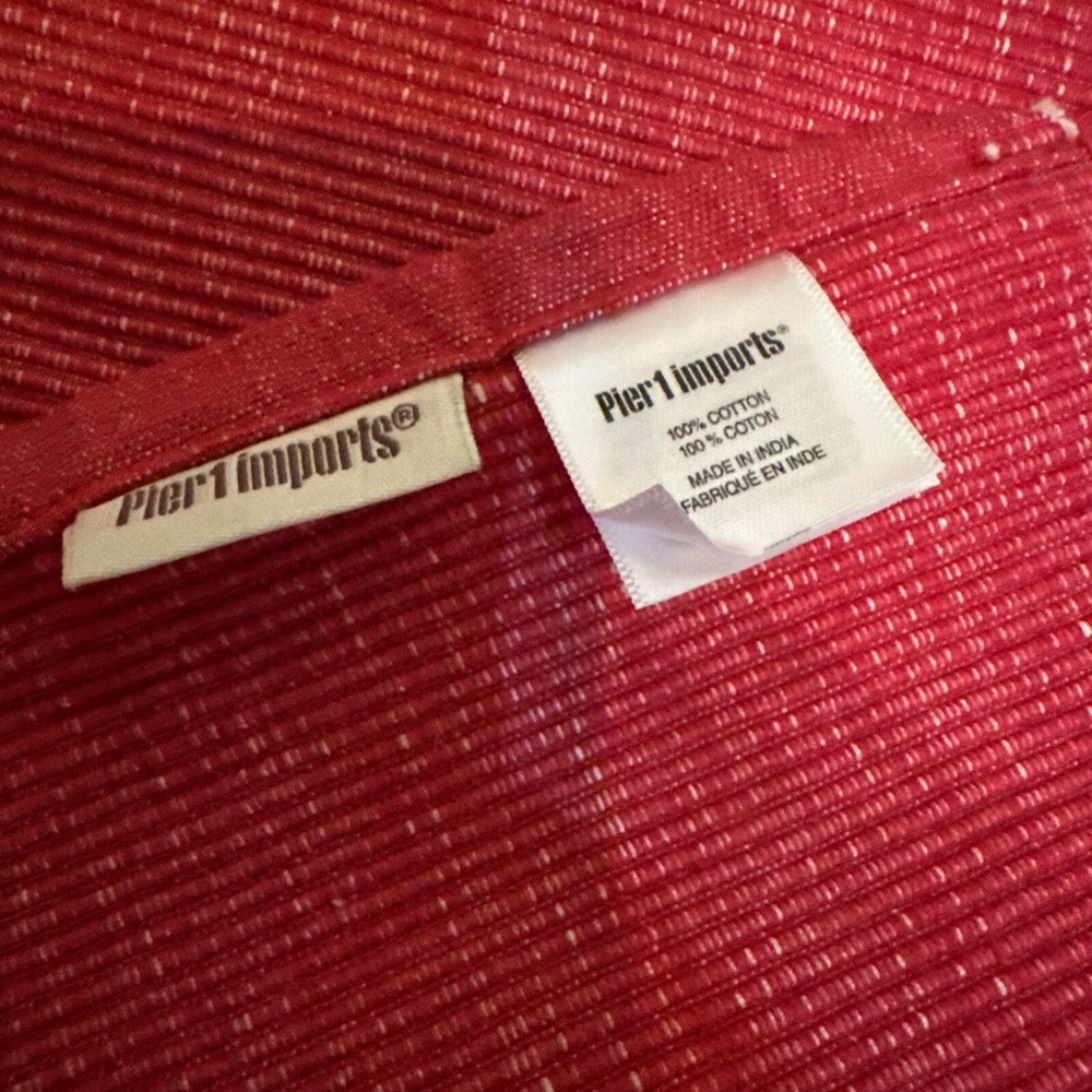 Add a touch of sophistication to your dining table with this set of 4 Pier One Imports placemats. These rectangular placemats are made of 100% cotton and feature a beautiful pintuck pattern in a vibrant red color. Perfect for any occasion, whether it be a Christmas dinner or a multipurpose gathering, these placemats are sure to impress your guests. Crafted with care and attention to detail, these placemats are machine washable for easy maintenance. The set includes 4 placemats, making it ideal for larger gatherings or everyday use. Upgrade your dining experience with these stylish and functional placemats from Pier One Imports.
