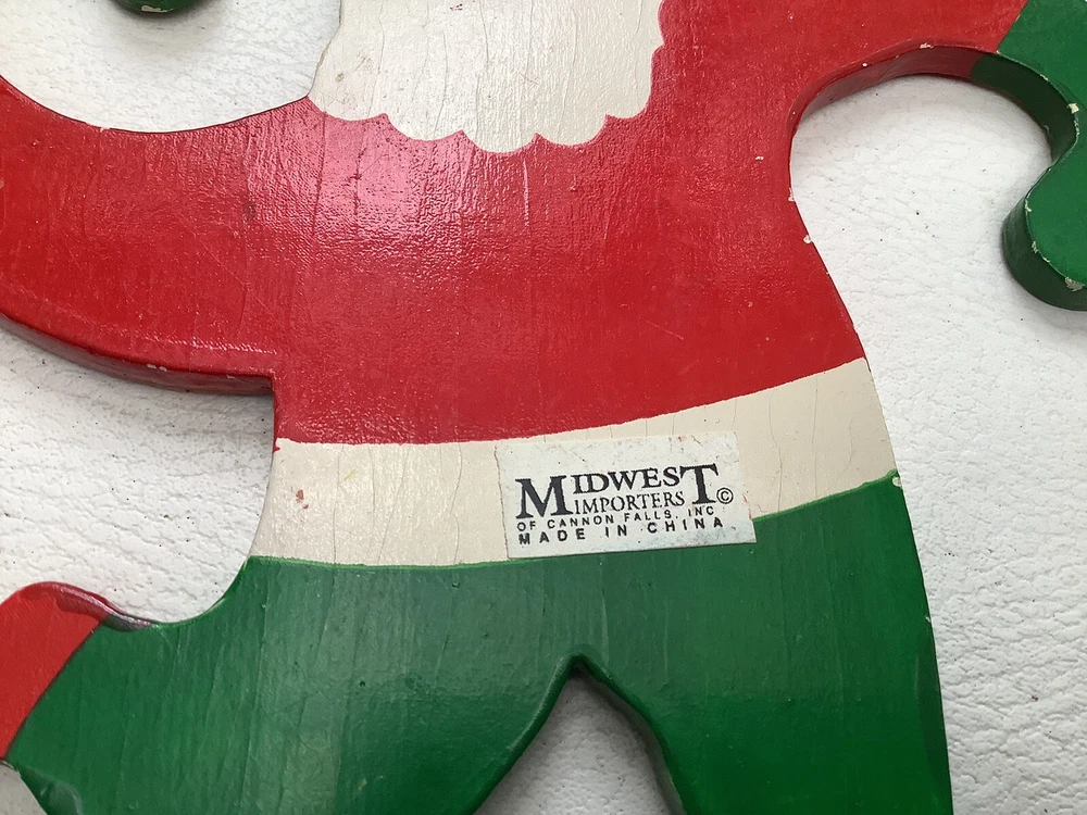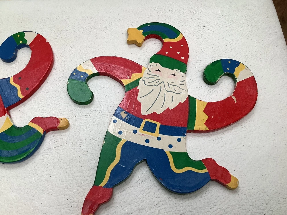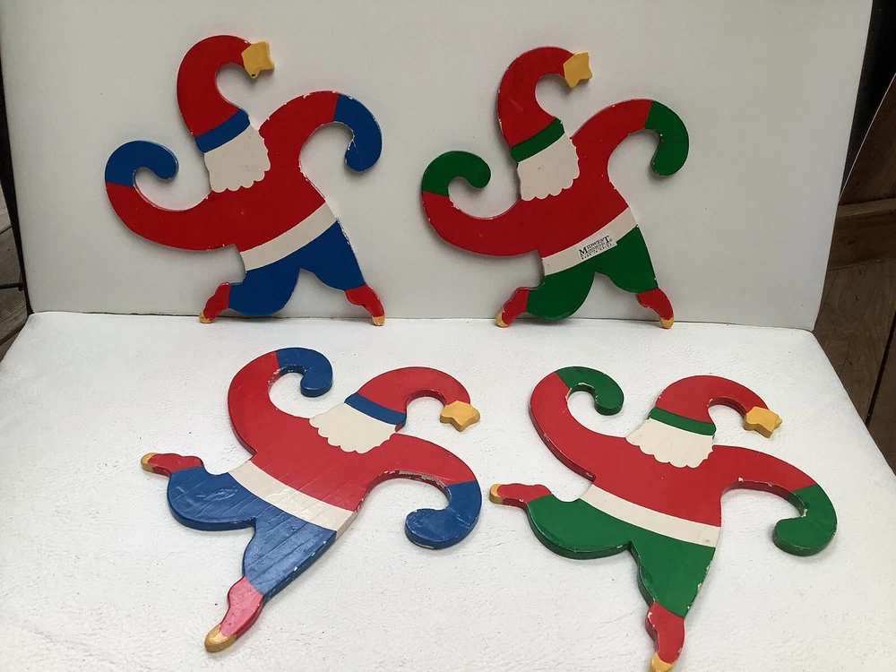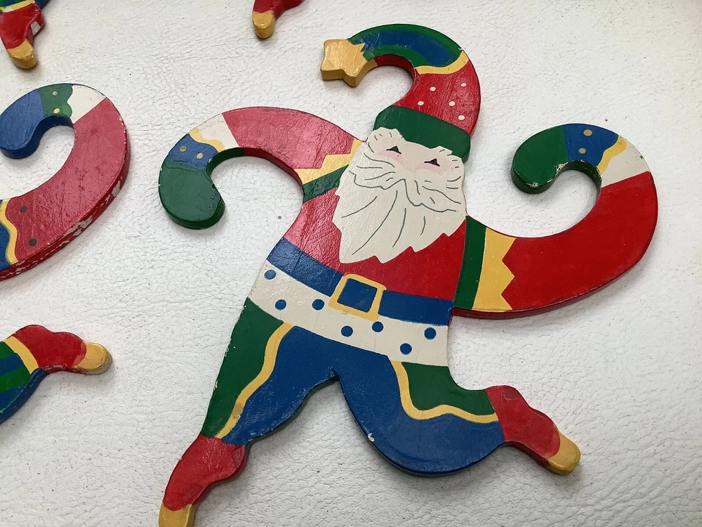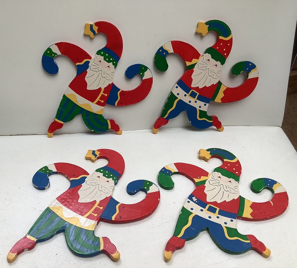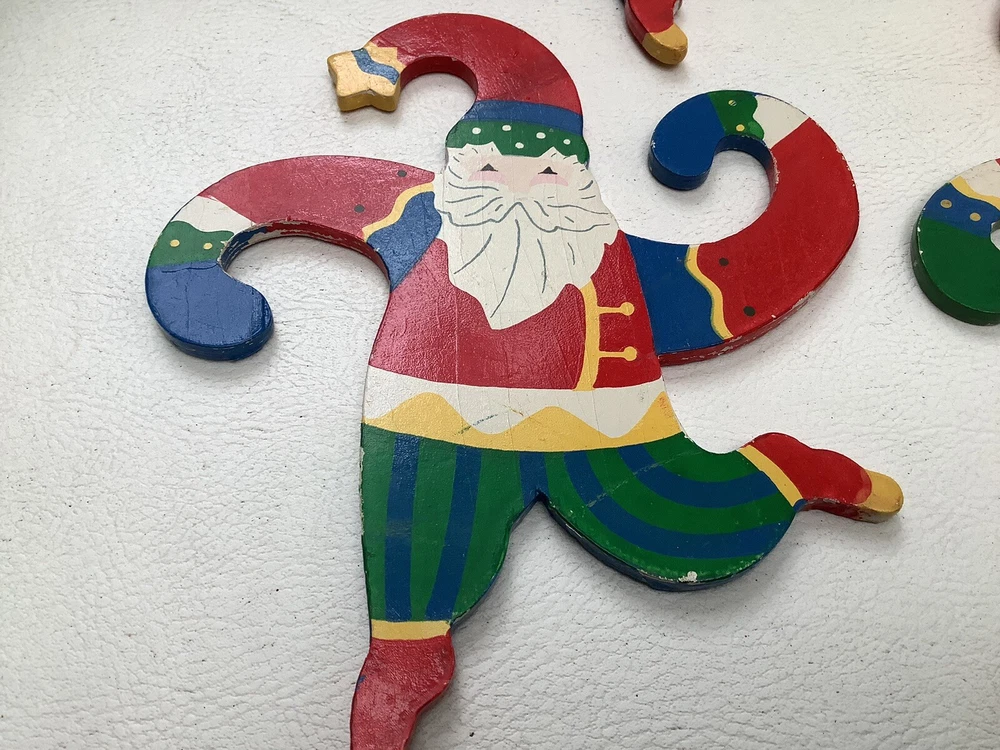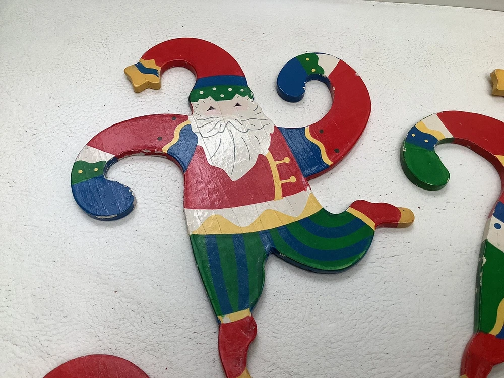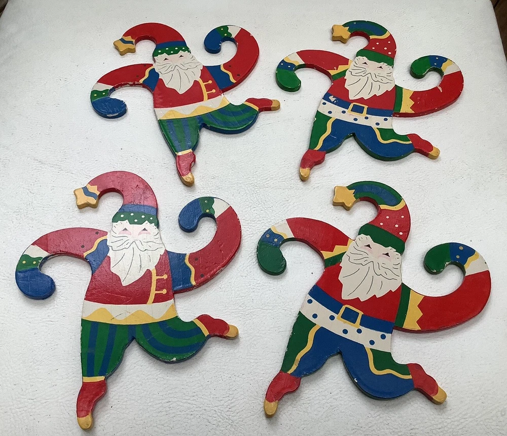 Vintage Set of 4 Hanging Santa Wooden ornaments About 7” high x 6” wide. With curling arms to be hung on the tree or garland. Very cute retro look. Excellent condition with bright colors and a few minor chips from use. Please ask any questions and thanks for looking.
