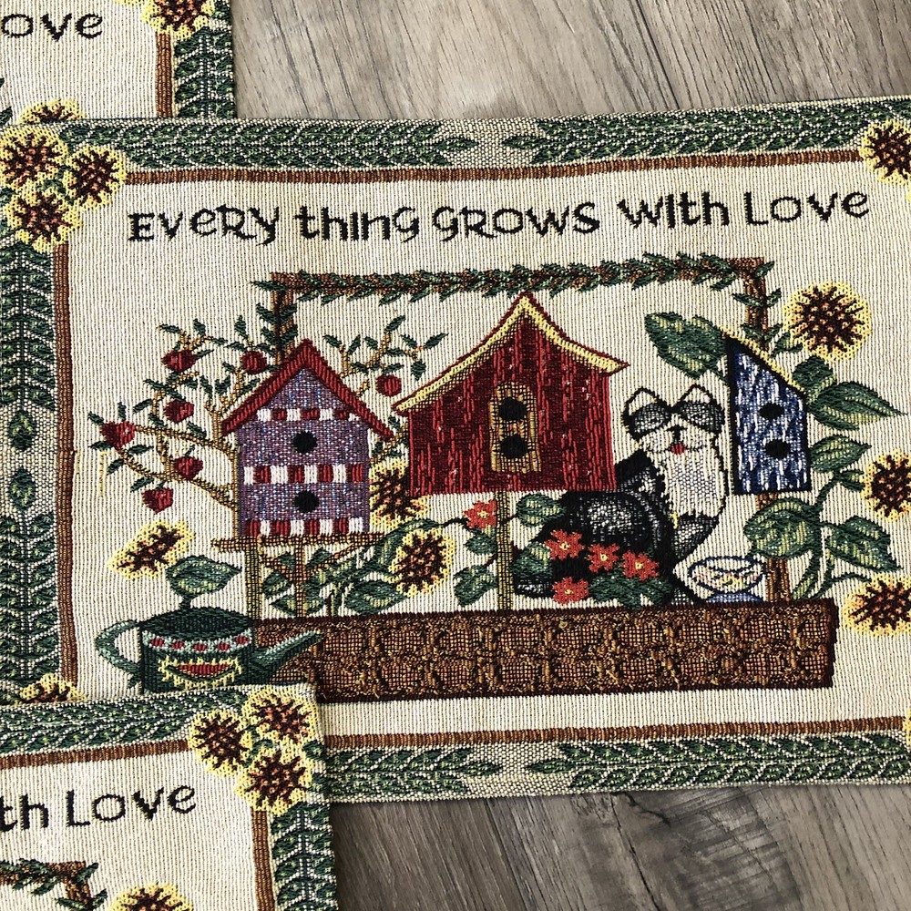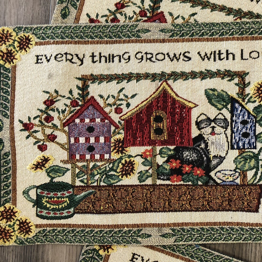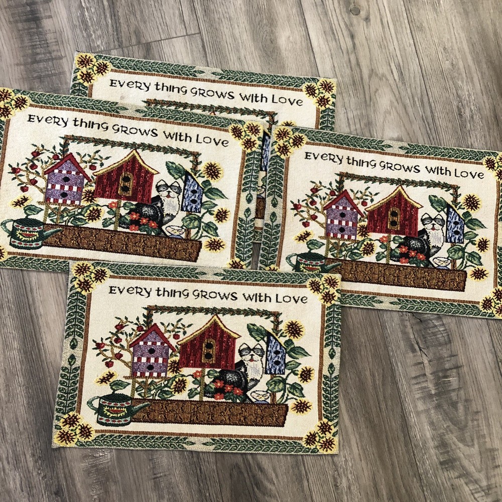Set Of 4 Woven Tapestry Placemats Everything Grows With Love Design Imports Cats Birdhouses Flowers 17 1/2" x 11 1/2"...