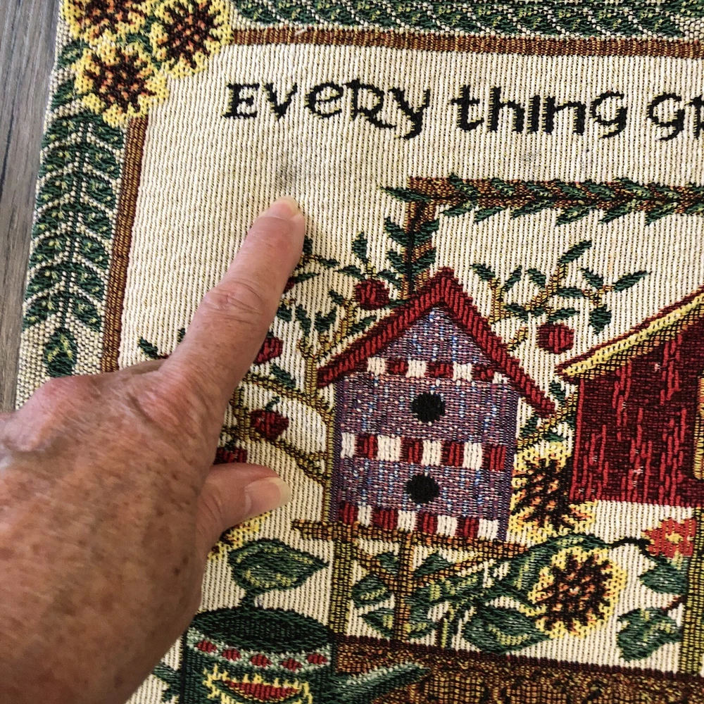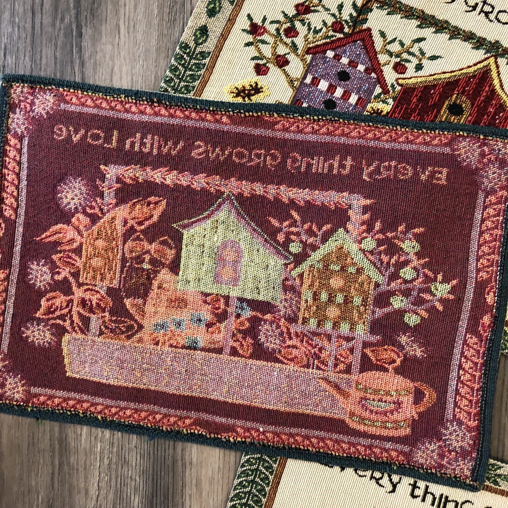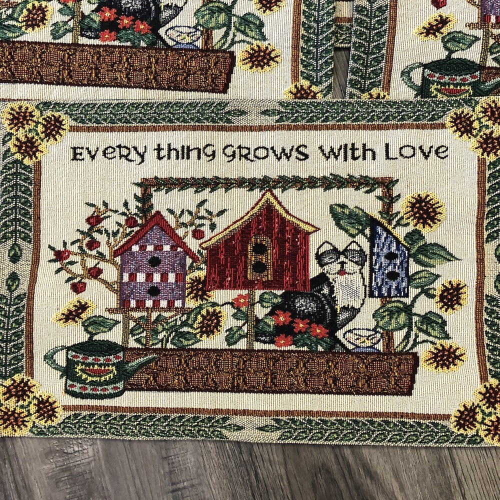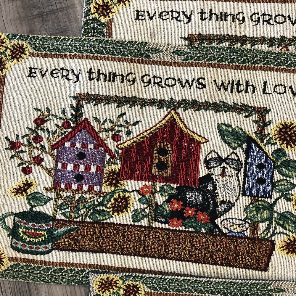 Set Of 4 Woven Tapestry Placemats Everything Grows With Love Design Imports Cats Birdhouses Flowers 17 1/2" x 11 1/2"...