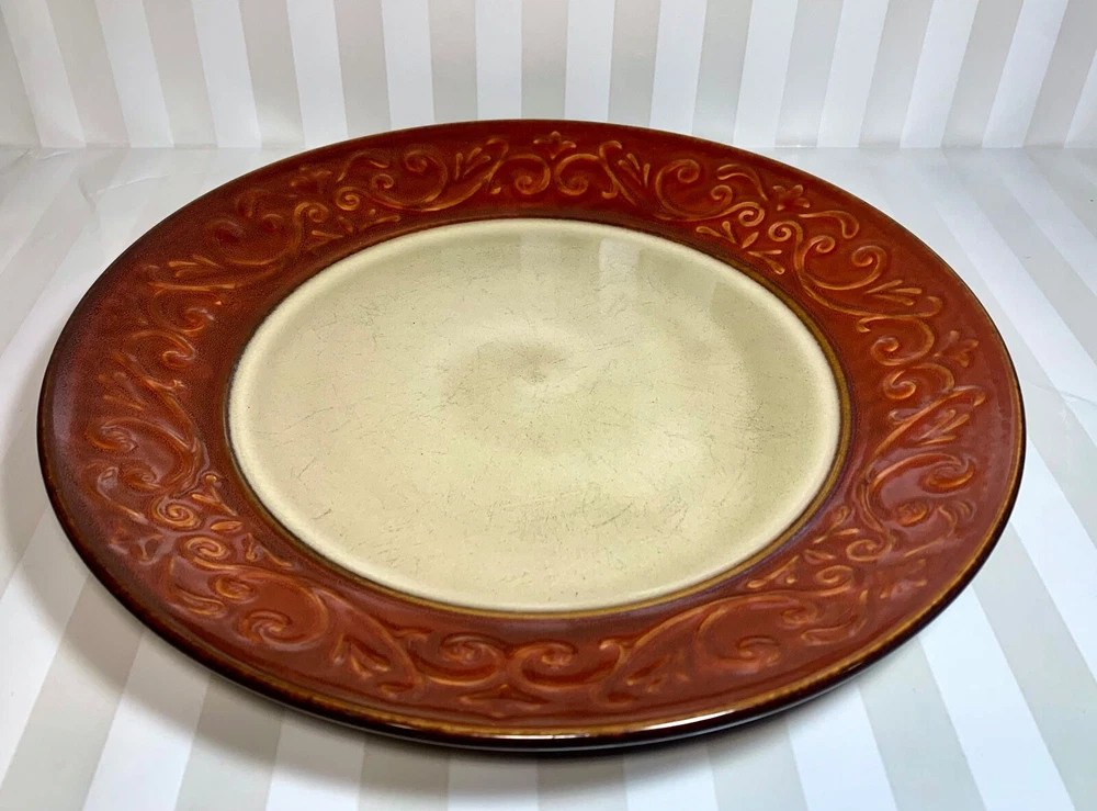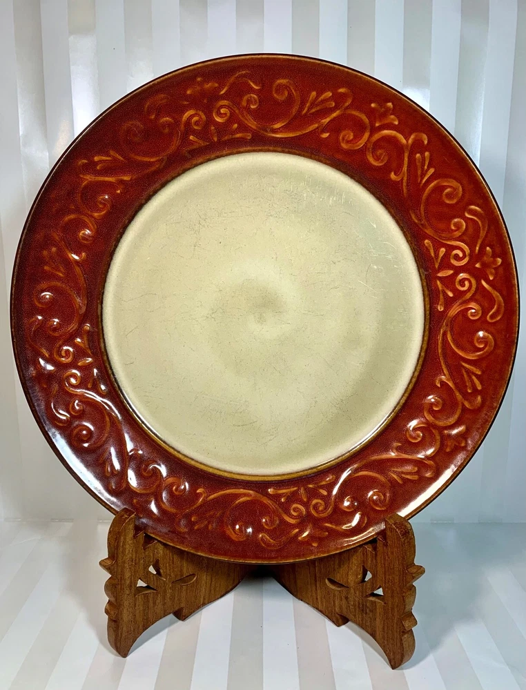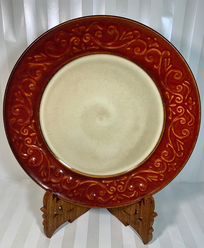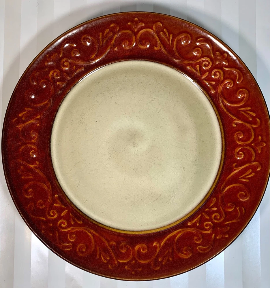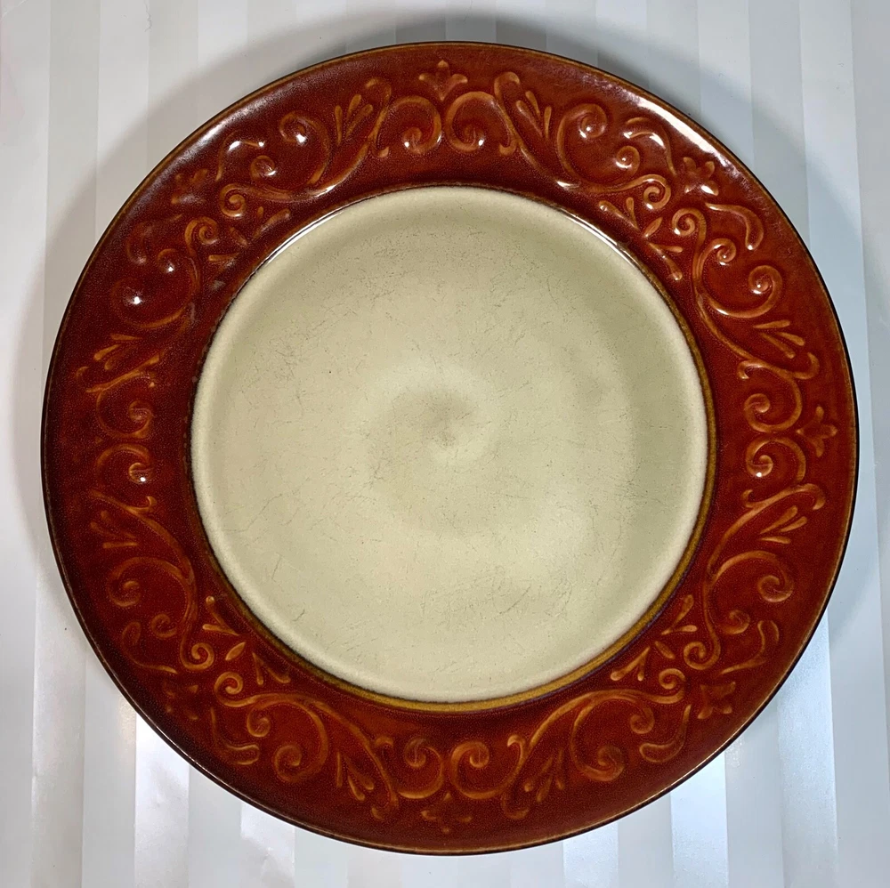 I am selling these gorgeous stoneware coupe dinner plates in singles. I have a total of 10 and a discount will be offered if you purchase more than 1! They are the "Red Scroll" line made exclusively for Pier 1 Imports. These sophisticated dinner plates feature an outer rim that is a beautiful barn red with gorgeous ornate embossed scroll designs. These beautiful designs are accentuated by a tan middle/center. middle/center of each plate is a light tan. The back of each plate is dark brown with a small tan circle left unglazed which has the printed backstamp. These plates are both dishwasher and microwave safe! These gorgeous plates are sure to bring a touch of elegance to any occasion! They are in excellent condition with no nicks, cracks, or chips. A few of the plates have some utensil marks that are very minimal. They measure 10 3/4" in diameter and are 1 1/8" in depth.