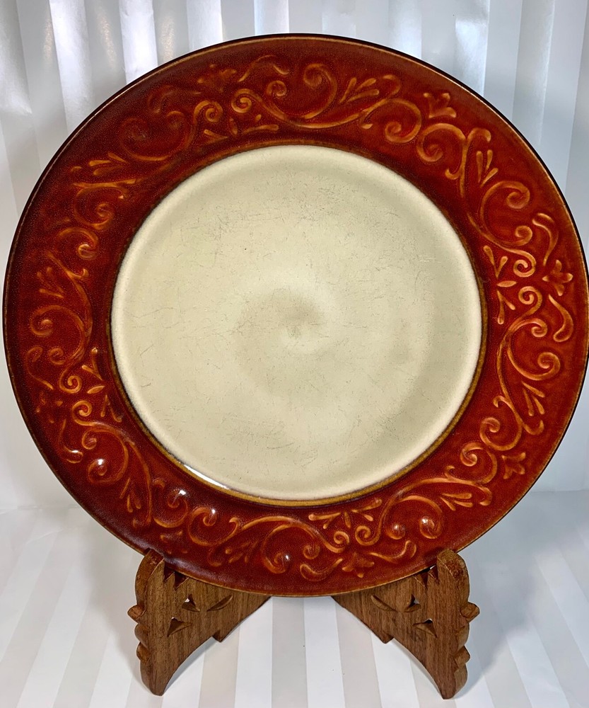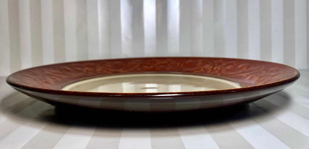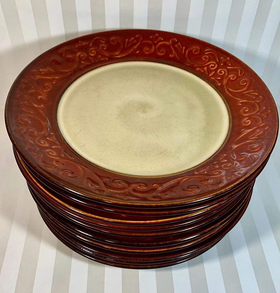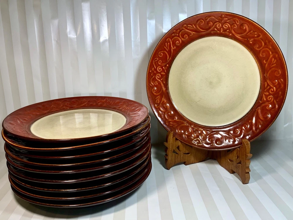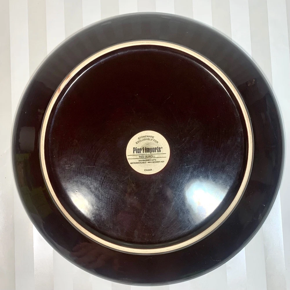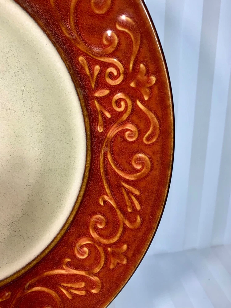 I am selling these gorgeous stoneware coupe dinner plates in singles. I have a total of 10 and a discount will be offered if you purchase more than 1! They are the "Red Scroll" line made exclusively for Pier 1 Imports. These sophisticated dinner plates feature an outer rim that is a beautiful barn red with gorgeous ornate embossed scroll designs. These beautiful designs are accentuated by a tan middle/center. middle/center of each plate is a light tan. The back of each plate is dark brown with a small tan circle left unglazed which has the printed backstamp. These plates are both dishwasher and microwave safe! These gorgeous plates are sure to bring a touch of elegance to any occasion! They are in excellent condition with no nicks, cracks, or chips. A few of the plates have some utensil marks that are very minimal. They measure 10 3/4" in diameter and are 1 1/8" in depth.