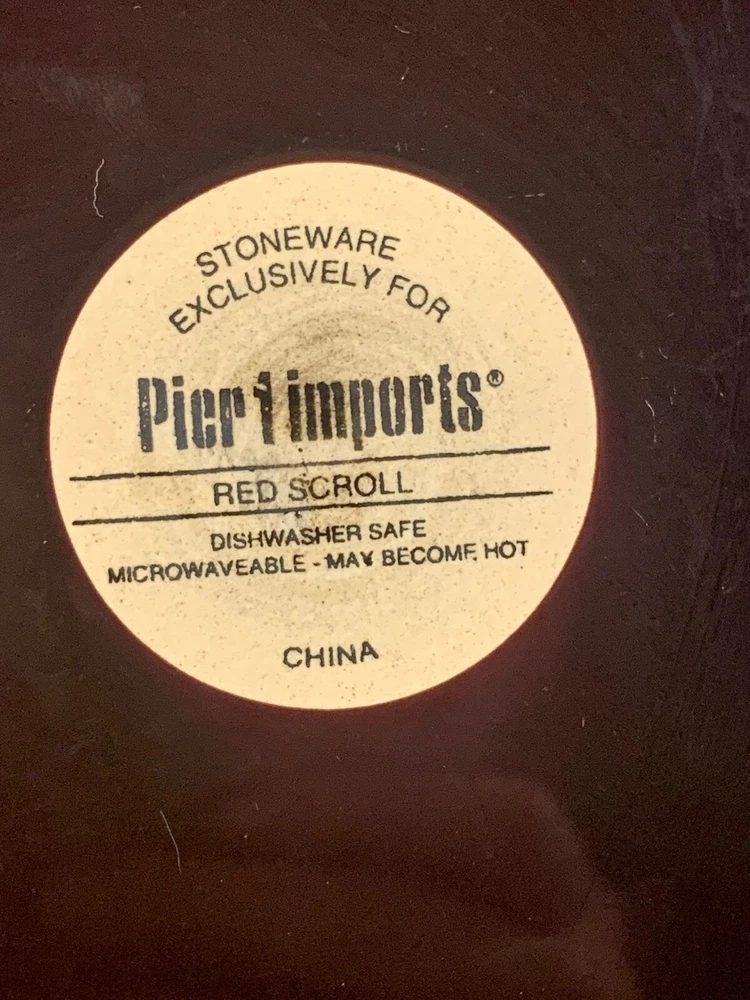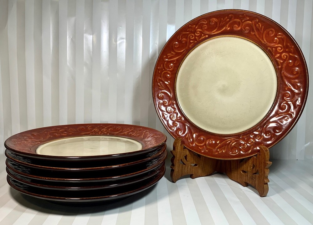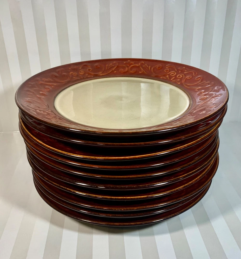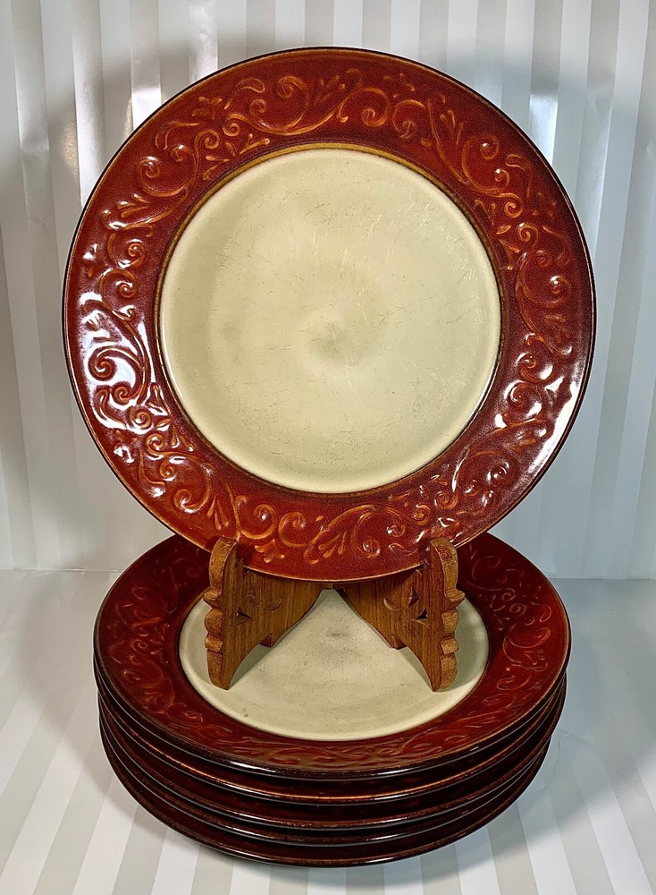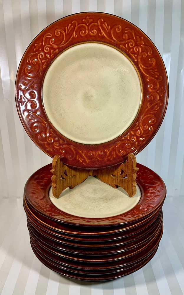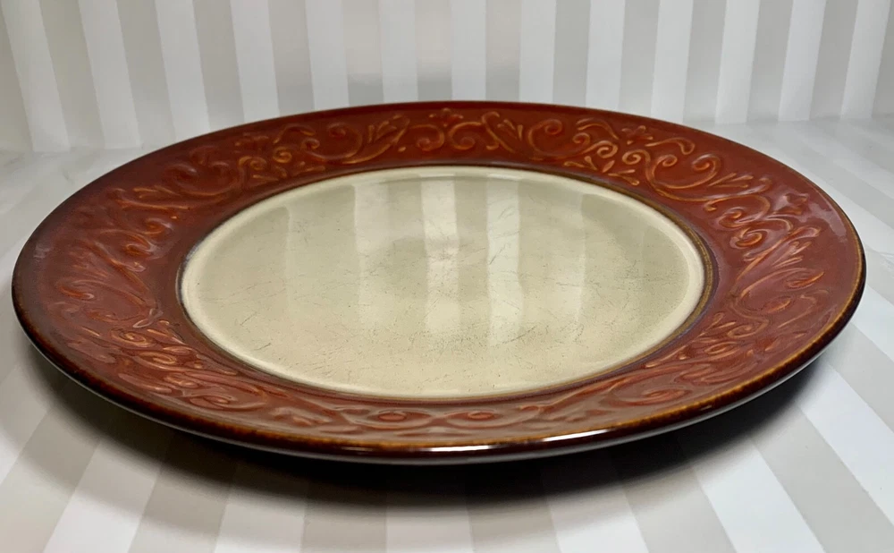 I am selling these gorgeous stoneware coupe dinner plates in singles. I have a total of 10 and a discount will be offered if you purchase more than 1! They are the "Red Scroll" line made exclusively for Pier 1 Imports. These sophisticated dinner plates feature an outer rim that is a beautiful barn red with gorgeous ornate embossed scroll designs. These beautiful designs are accentuated by a tan middle/center. middle/center of each plate is a light tan. The back of each plate is dark brown with a small tan circle left unglazed which has the printed backstamp. These plates are both dishwasher and microwave safe! These gorgeous plates are sure to bring a touch of elegance to any occasion! They are in excellent condition with no nicks, cracks, or chips. A few of the plates have some utensil marks that are very minimal. They measure 10 3/4" in diameter and are 1 1/8" in depth.