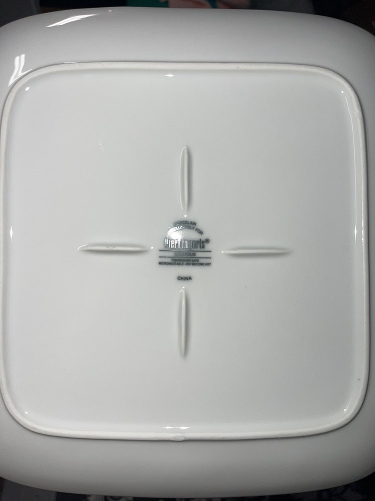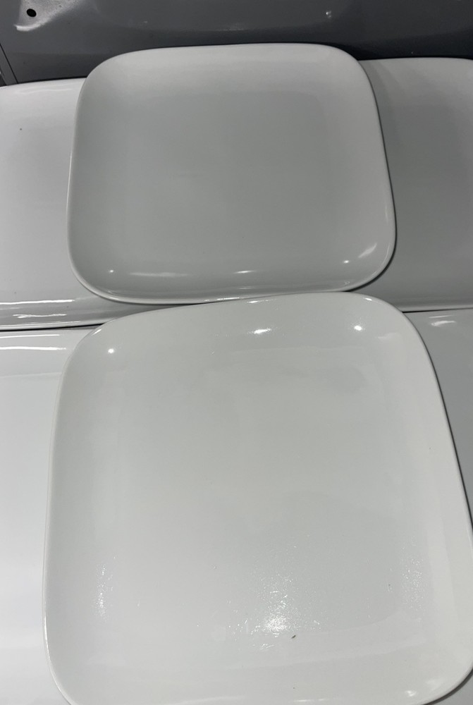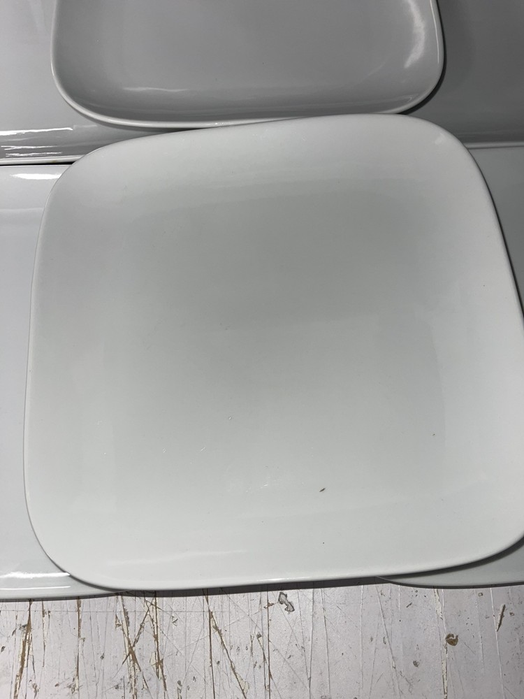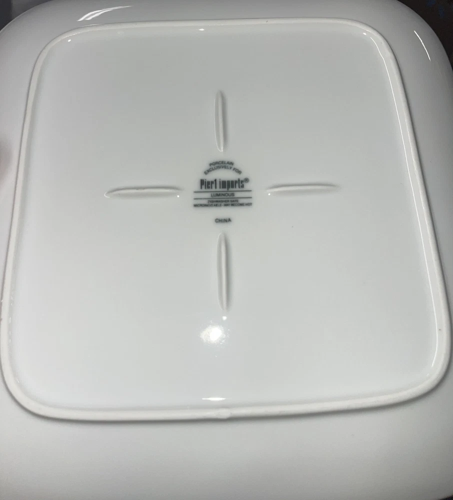 This set includes 6 Pier 1 Luminous Square White Dinner Plates, each measuring 10 inches in length and width with a height of 5/8 inch. Made of porcelain, they feature a contemporary square shape with a glossy finish, suitable for all occasions.
