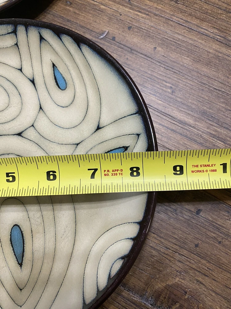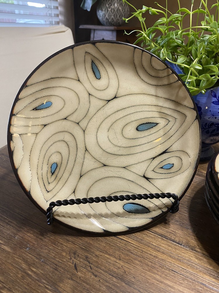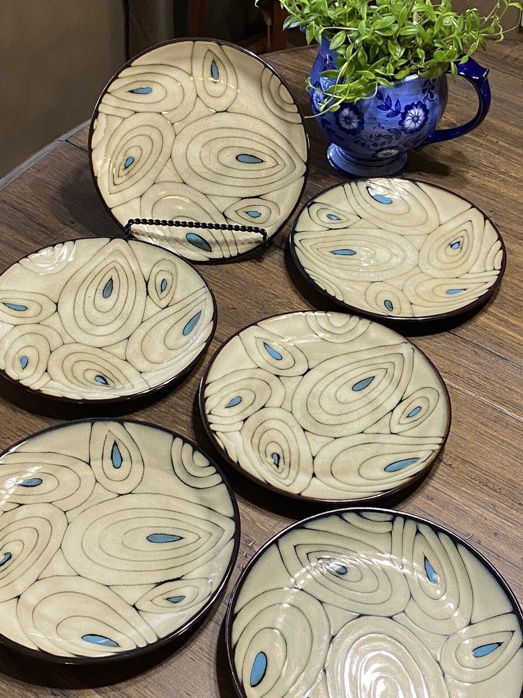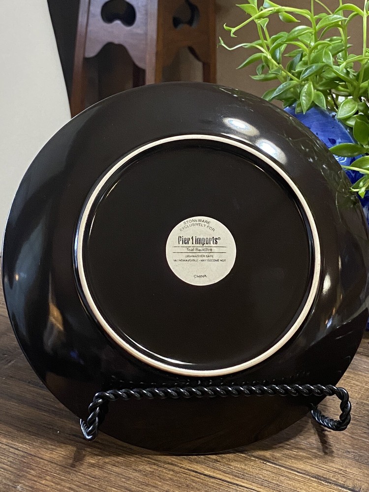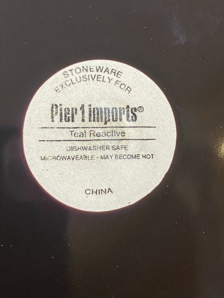 **Note: These are pre-owned and have surface wear consistent with usage. See pictures. Add a pop of color to your table setting with this set of six (6) Teal Reactive Salad Plates from Pier 1 Imports. Each plate features a teal reactive glaze that creates a unique peacock pattern, making them a stunning addition to any table. The round, coupe shape with an 8.25" diameter is perfect for serving salads or other small dishes. These stoneware plates are dishwasher safe, making cleaning up after your meal a breeze. The backstamp is printed with the Pier 1 Imports brand logo, ensuring its authenticity. Get ready to impress your guests with these beautiful plates!