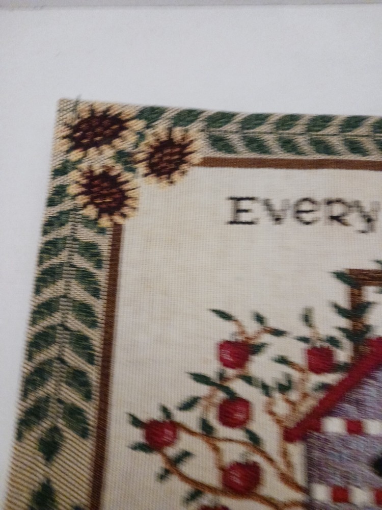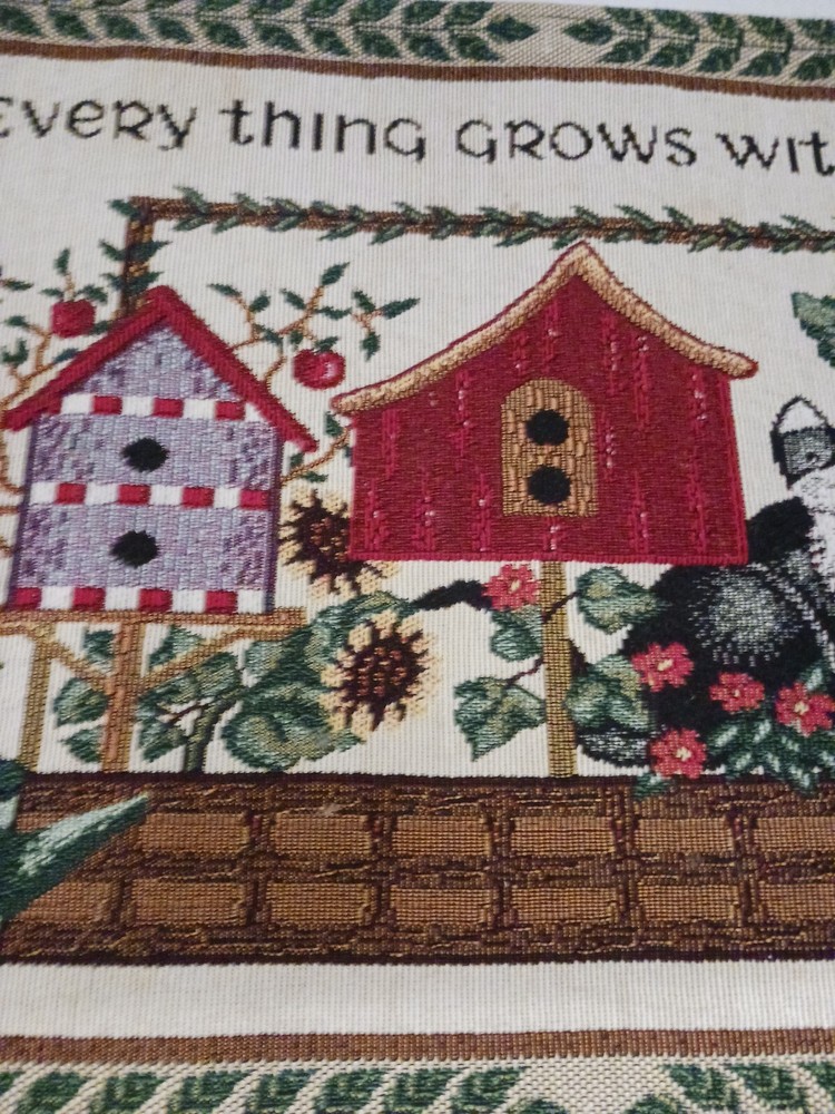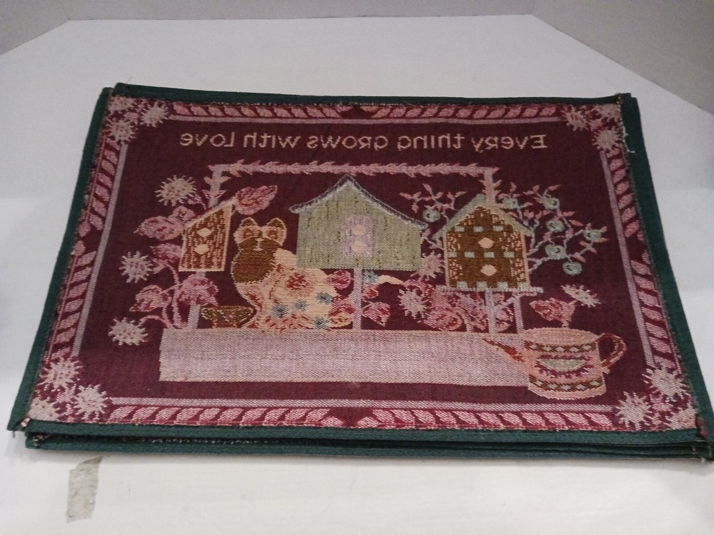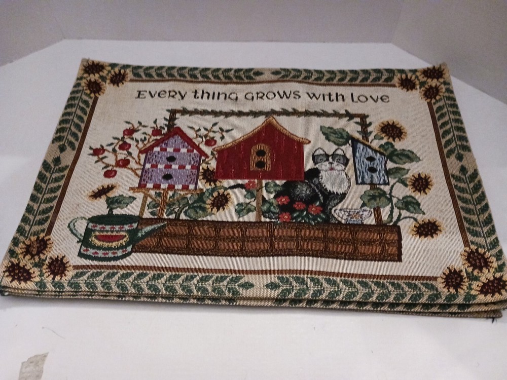 Set Of 6 Woven Tapestry Placemats Everything Grows With Love Design Imports. Pre-owned on great condition- clean- no tears Cute little cat sits in the garden surrounded by birdhouses These are great f...