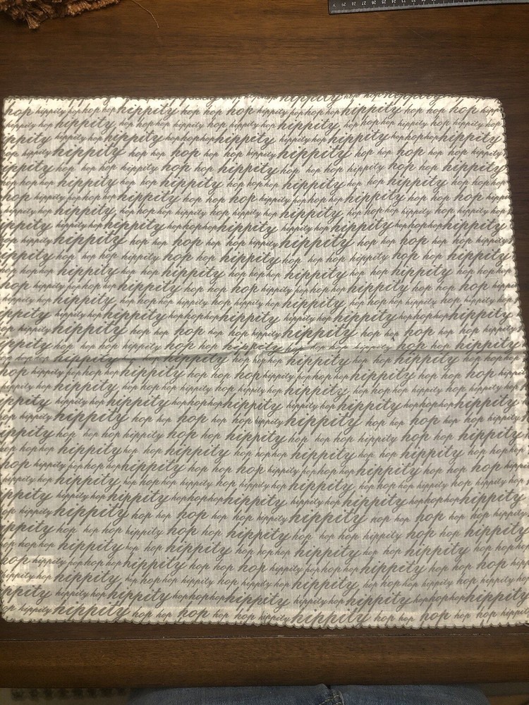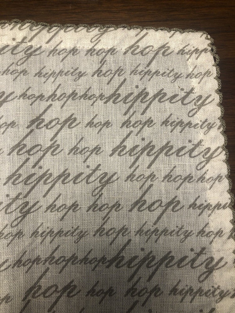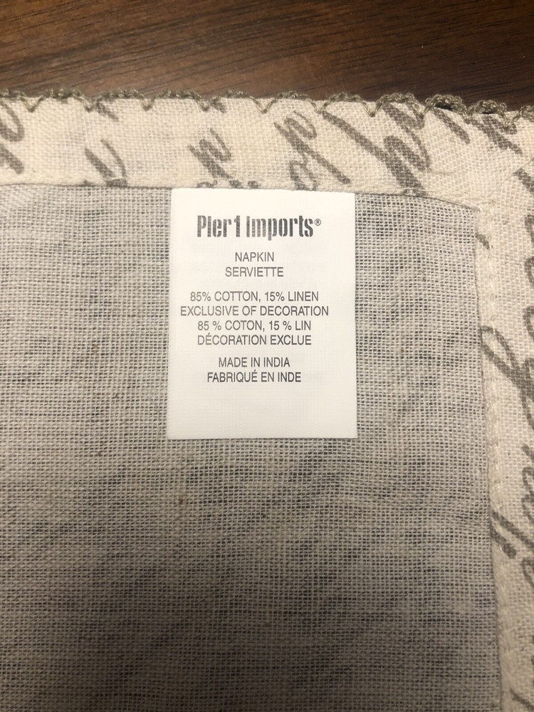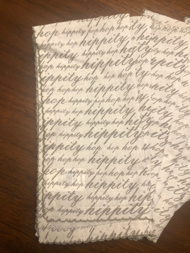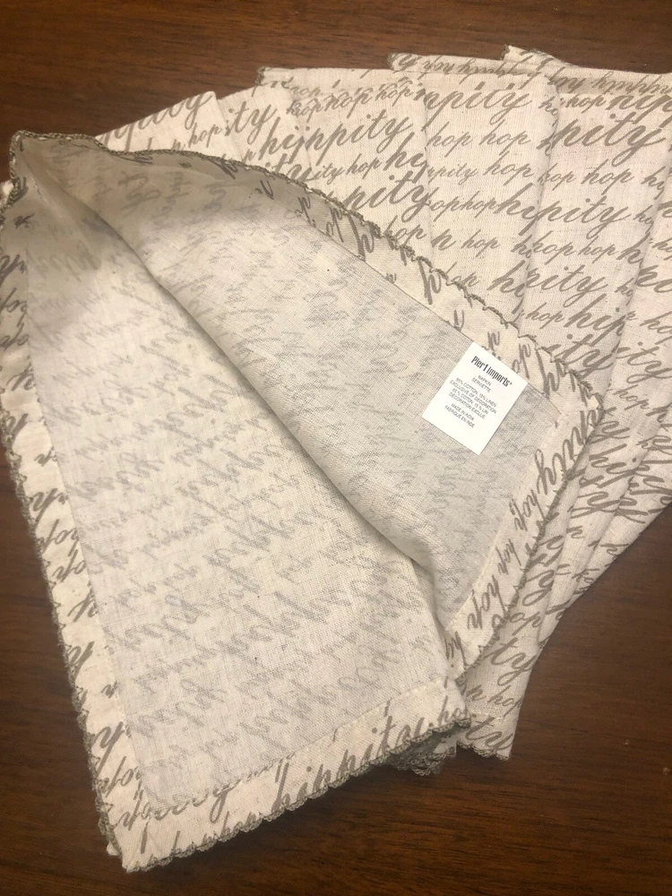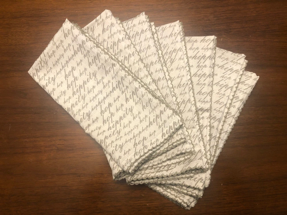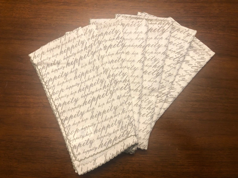 Set of 7 Pier 1 cloth napkins with Easter/rabbit text, hemmed and embroidered edges, like new condition....