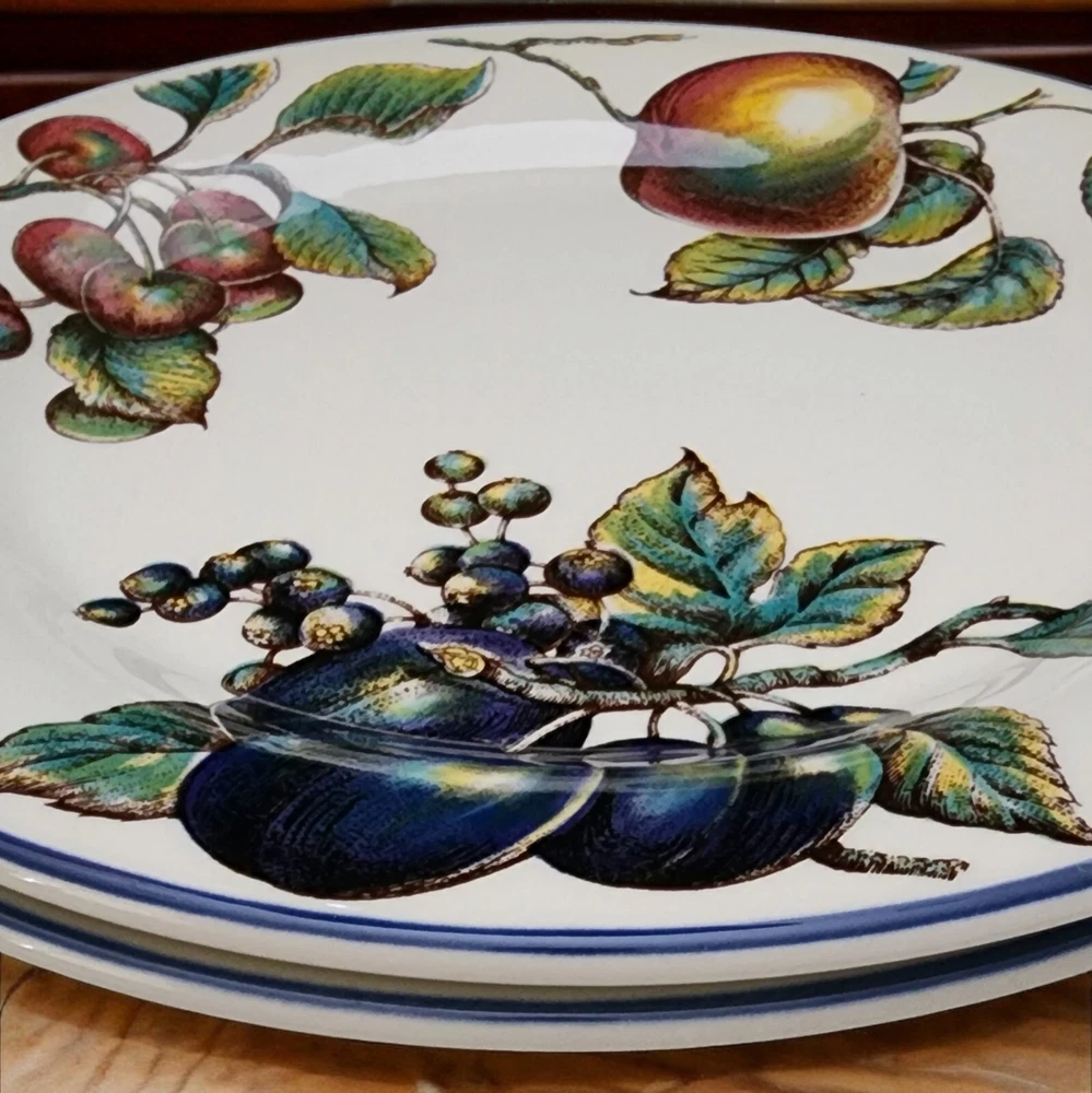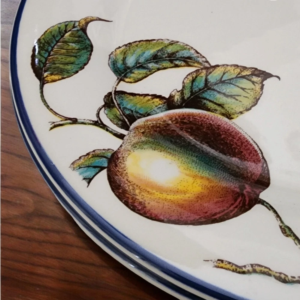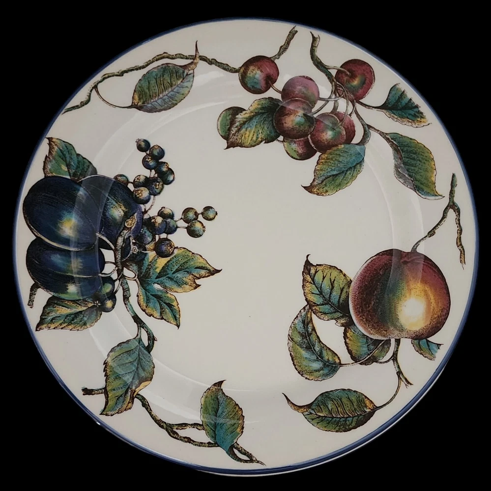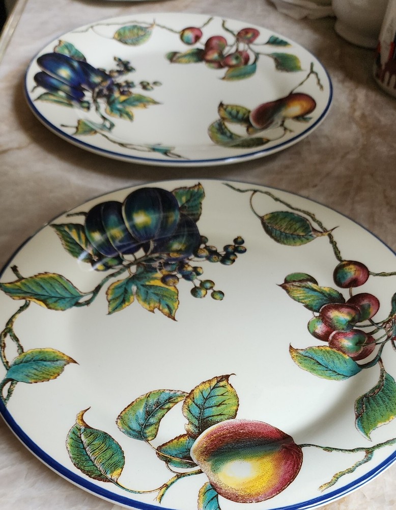 This listing is for TWO plates with multiples available at a discounted price. More Pier 1 Macintosh pattern plateware available in our store. Add a touch of elegance to your dining table with this set of two Pier 1 dinner plates. Made in England, these 10" round ceramic plates are part of the Macintosh product line and feature a beautiful fruit pattern in rich multicolor detail. Perfect for all occasions, these blue trimmed bplates are ideal for serving your favorite meals and creating a stylish dining experience. By nature, pottery will have imperfections that add to the style. This artful pottery is in great condition for it's age. Please consult all of pictures for more detailed information. Each plate is printed with a backstamp and has a glossy finish. The set includes two dinner plates, each weighing 2.14#, and are 21st century original pieces. These plates are not only functional but also a work of art with their art pottery production style and pottery production technique. Upgrade your dinnerware collection with these stunning plates today.